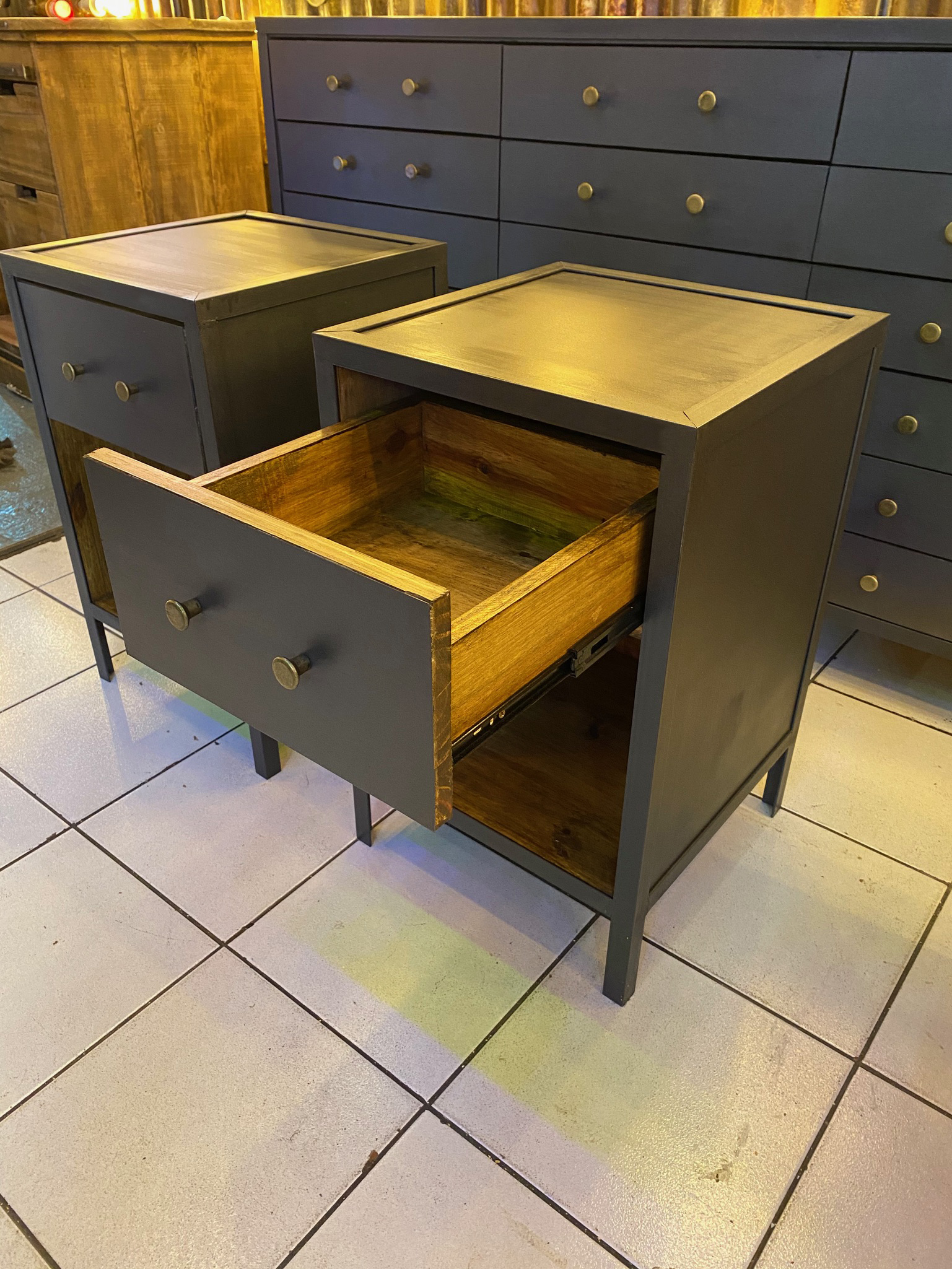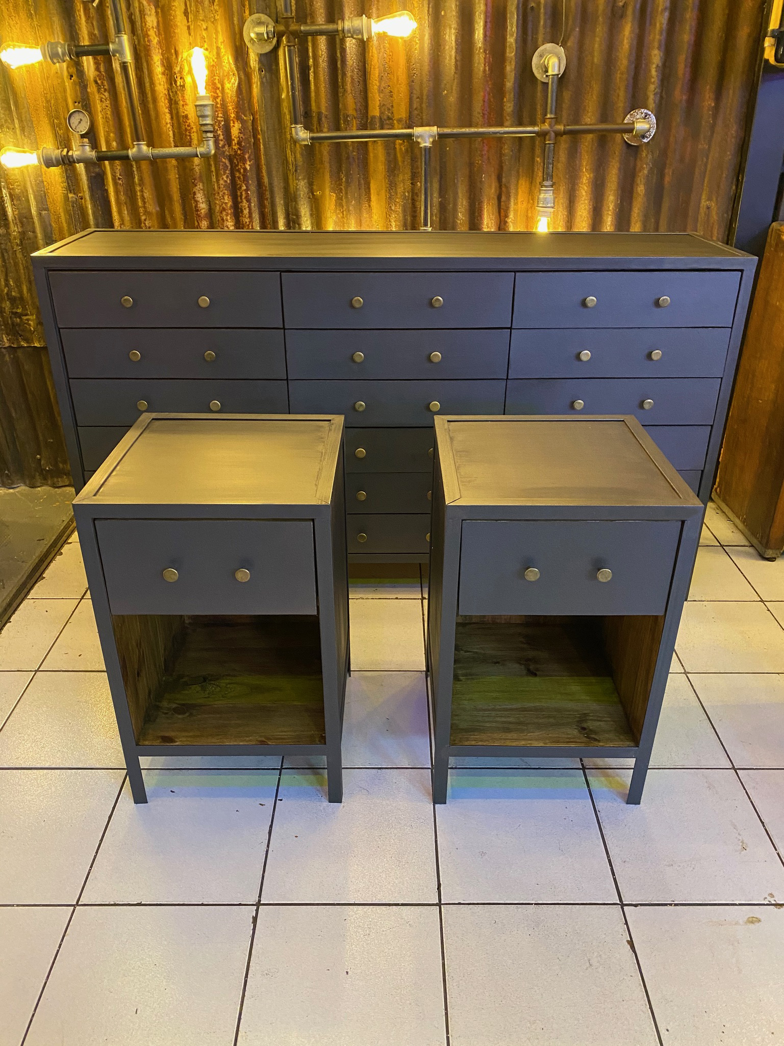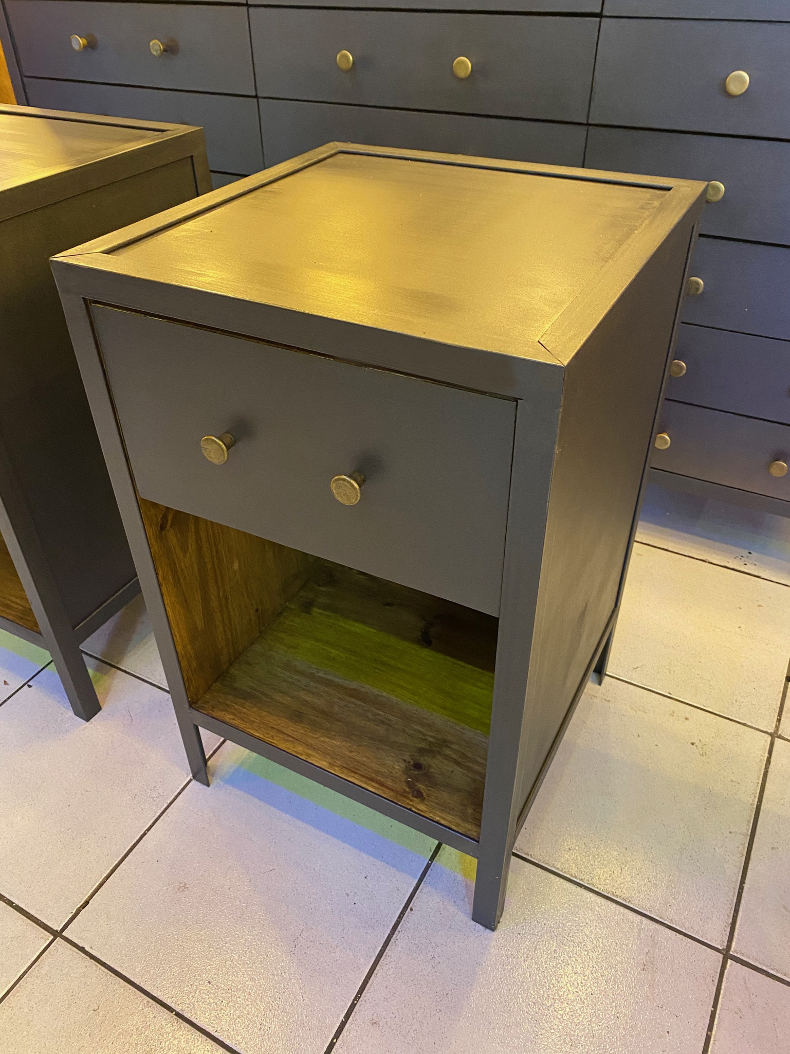 Mesa de luz en chapa con terminación gris mate, frente con doble perilla.