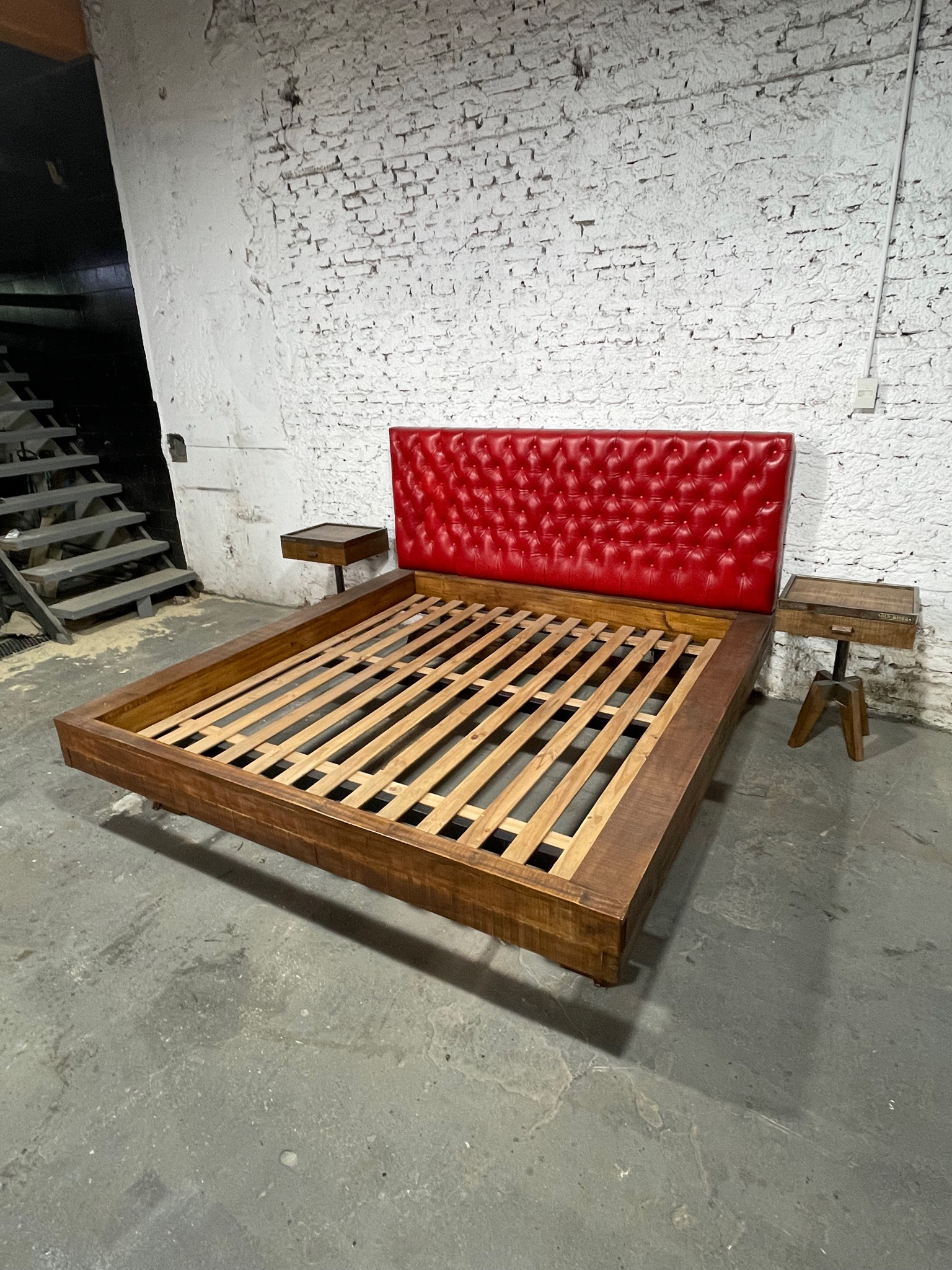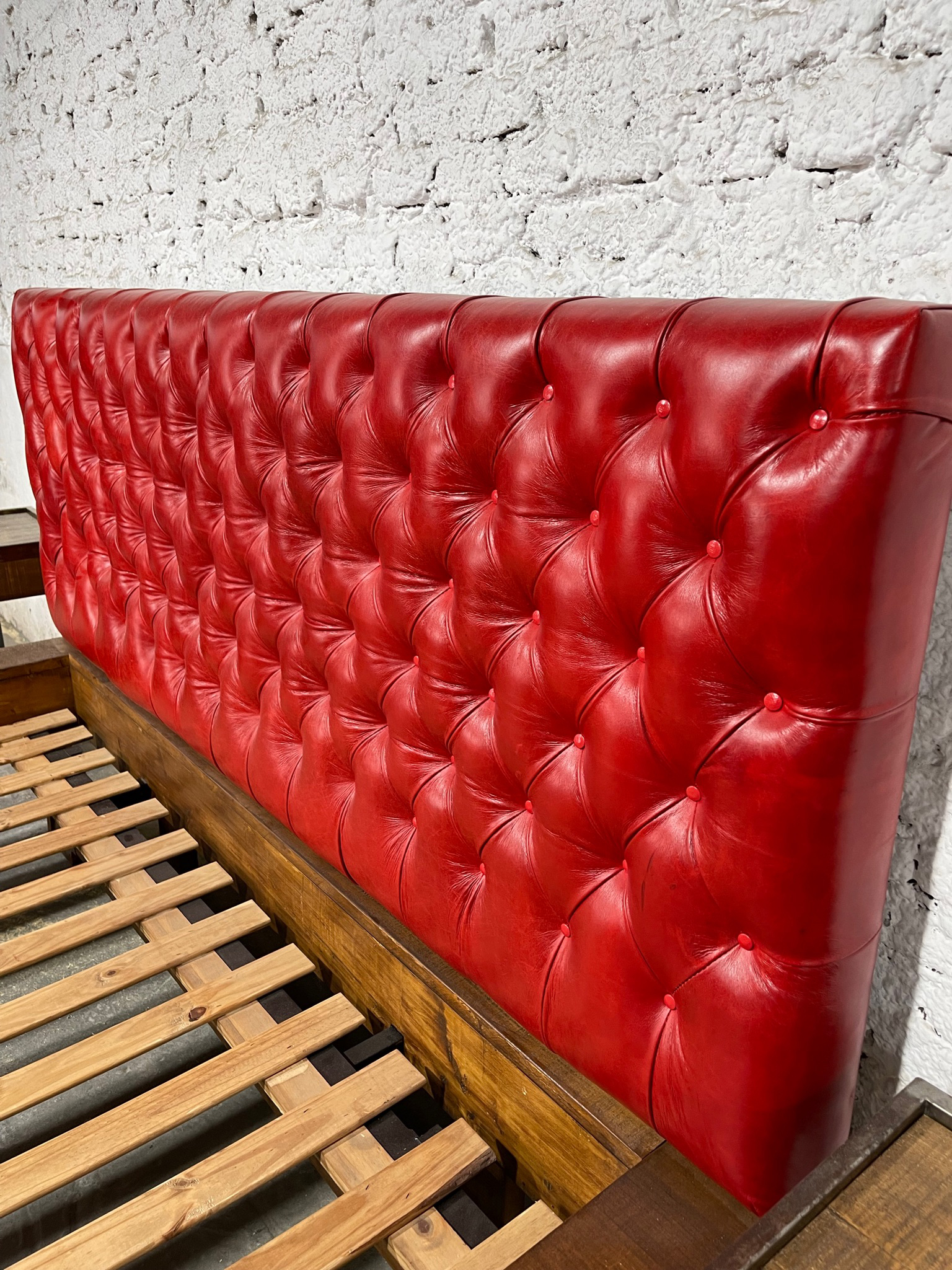Cama en madera con respaldo capitoné tapizado en cuero rojo y base de listones en madera.