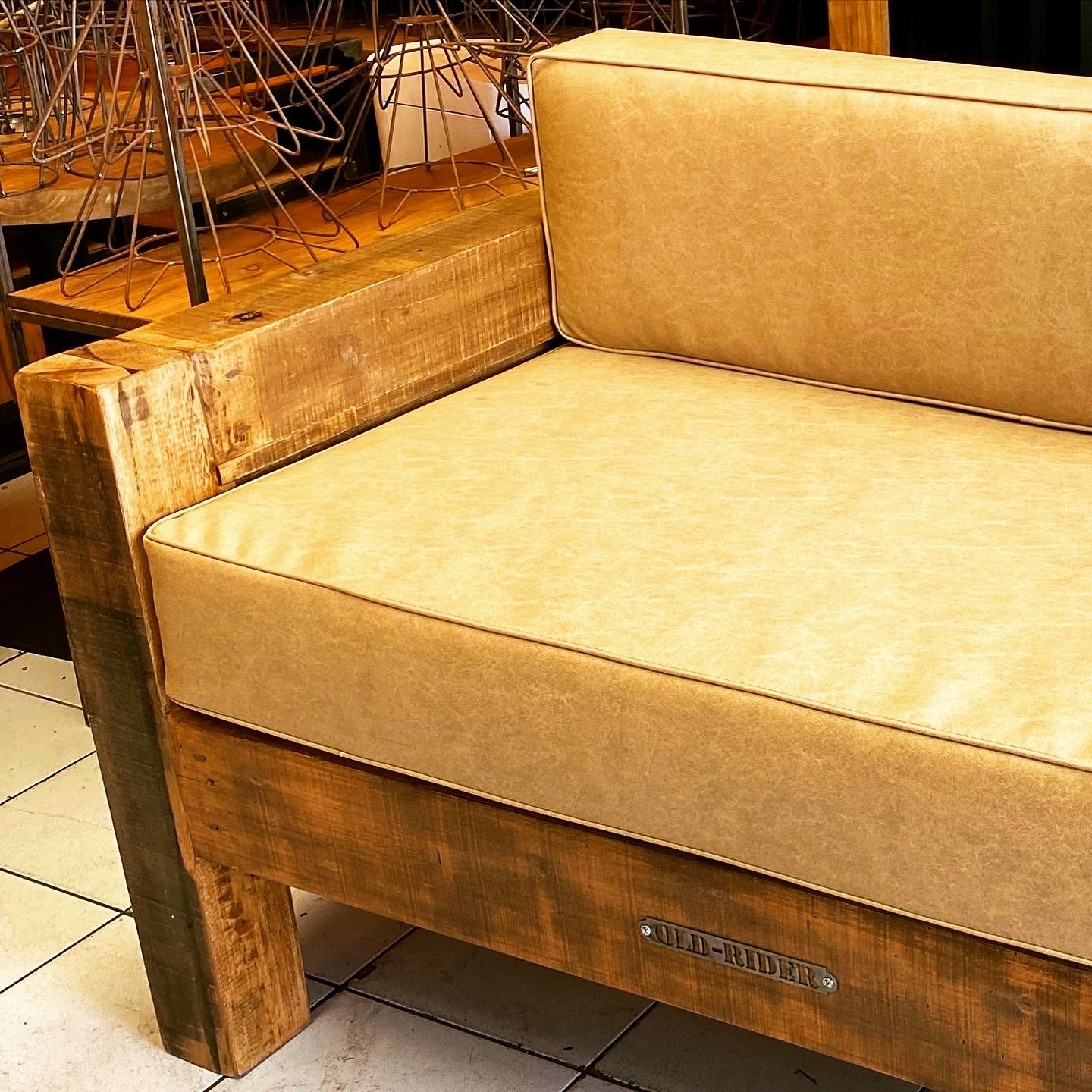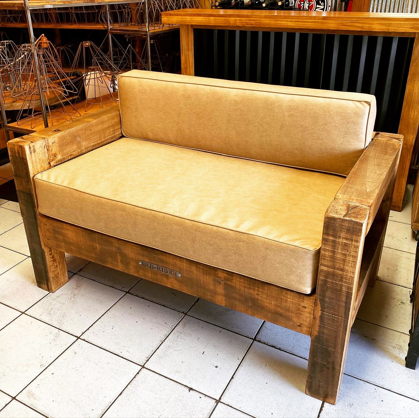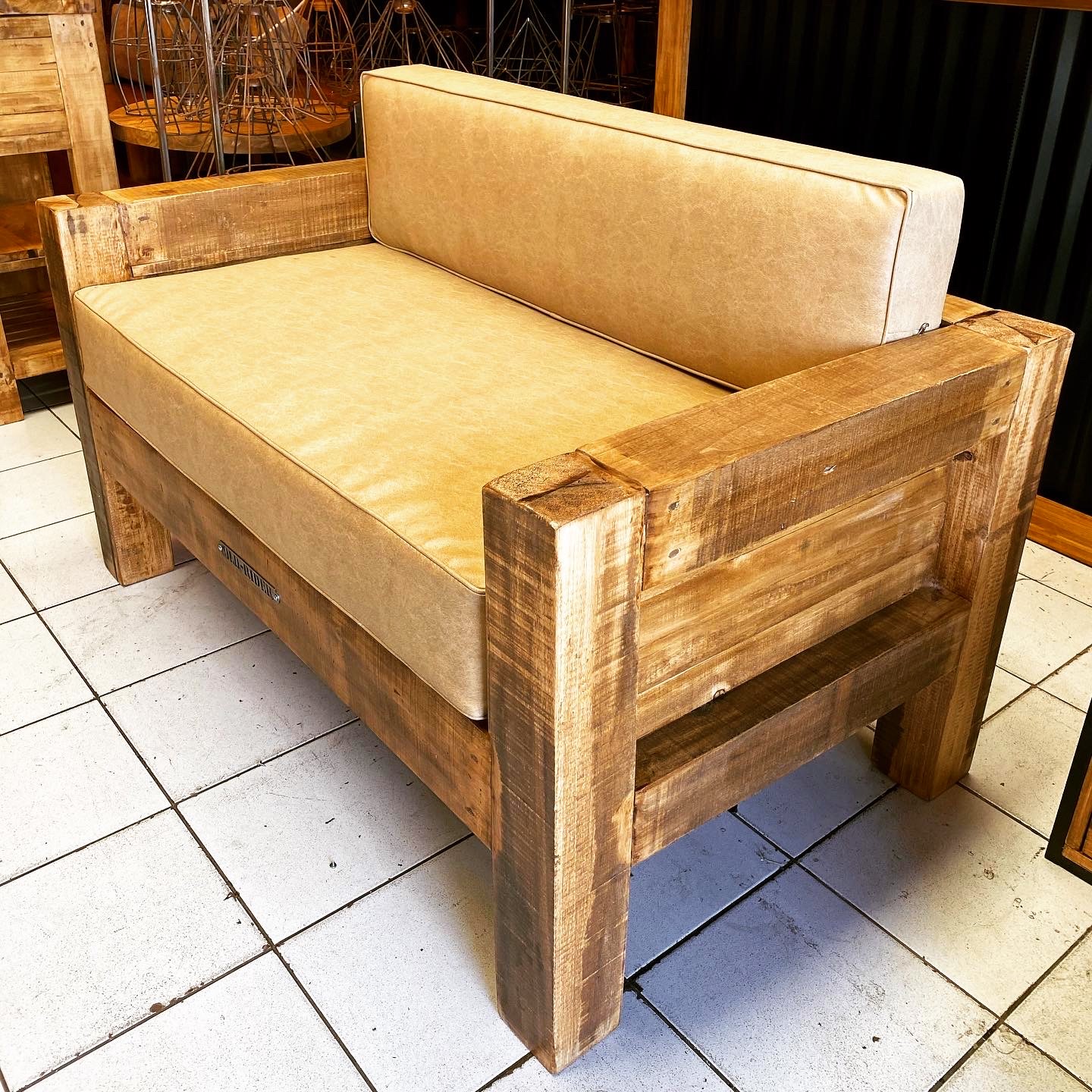 Sillón de madera rústica con almohadones tapizados en cuero claro
