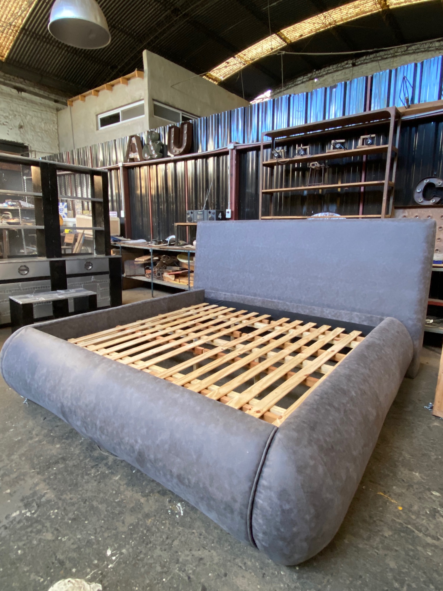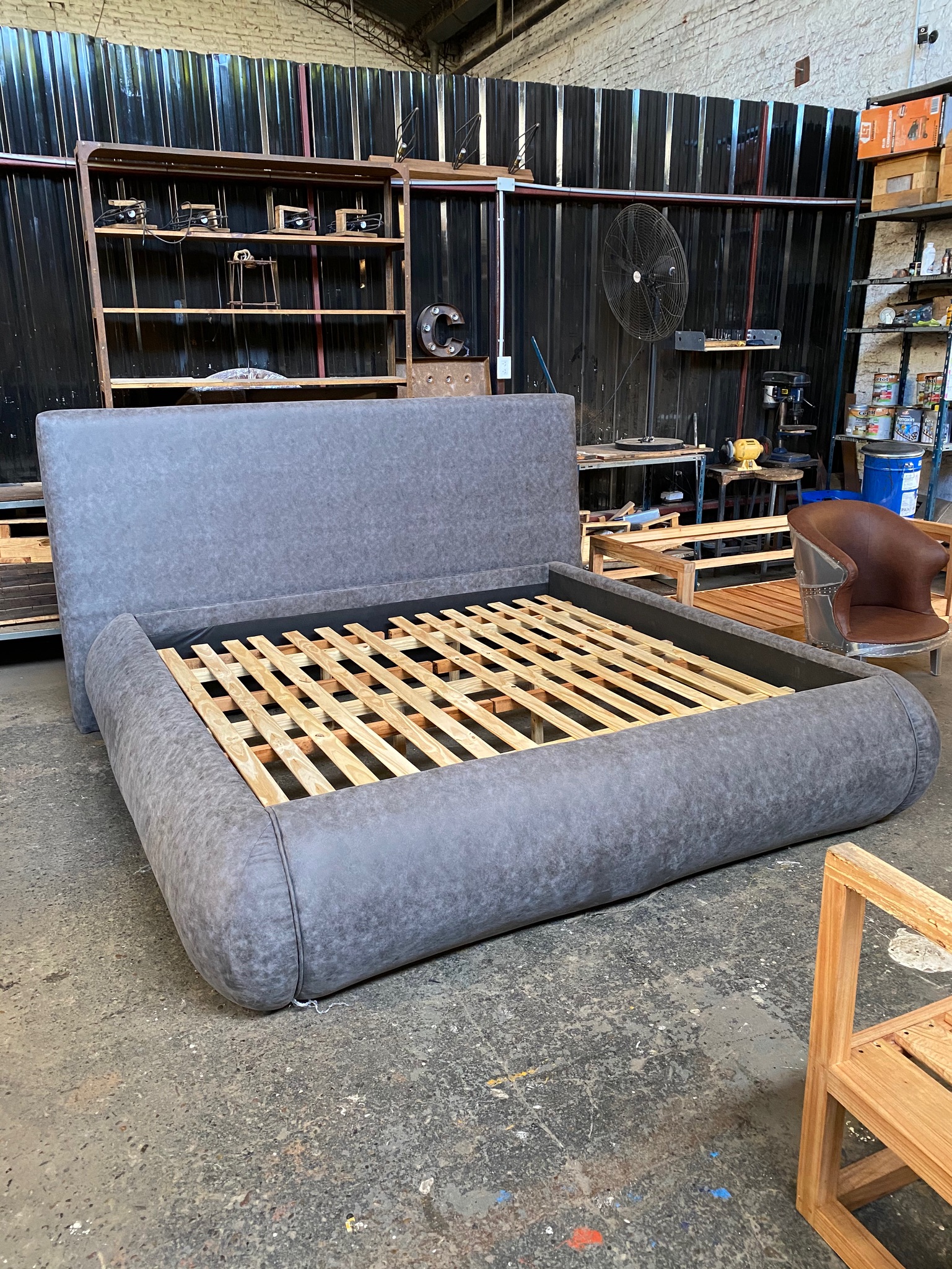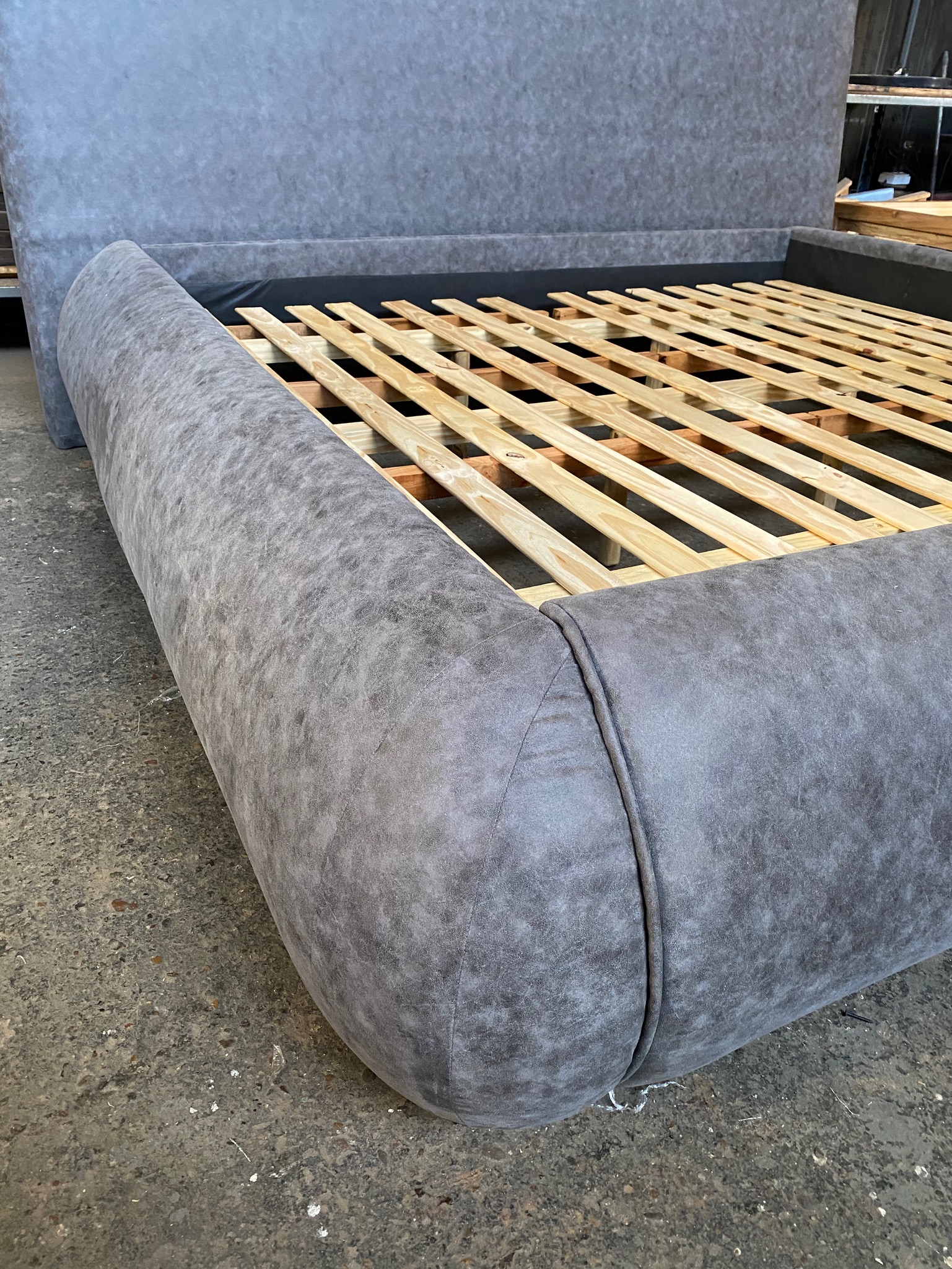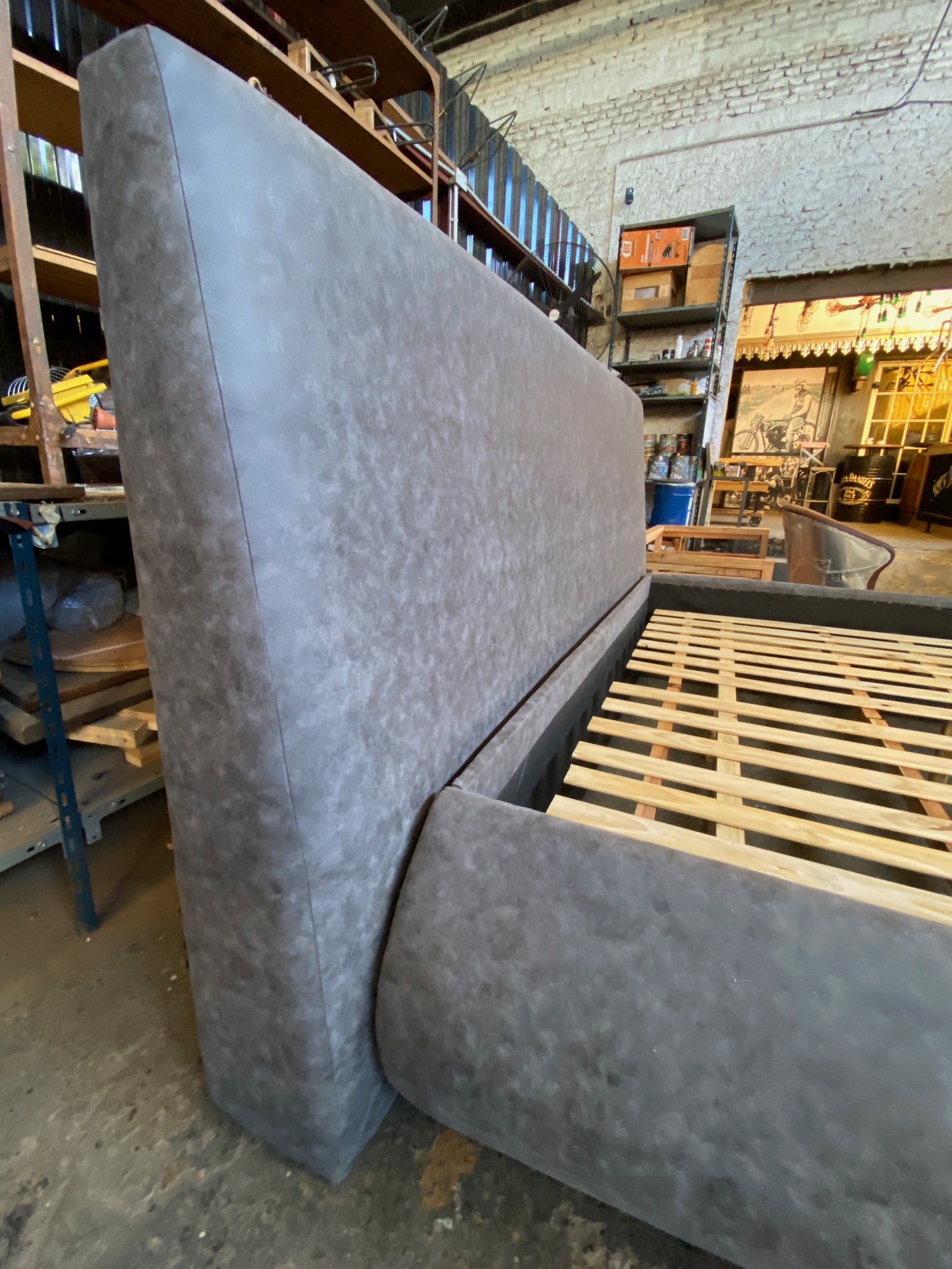 Cama tapizada en eco cuero gris envejecido, con bordes curvos envolventes y base de madera.