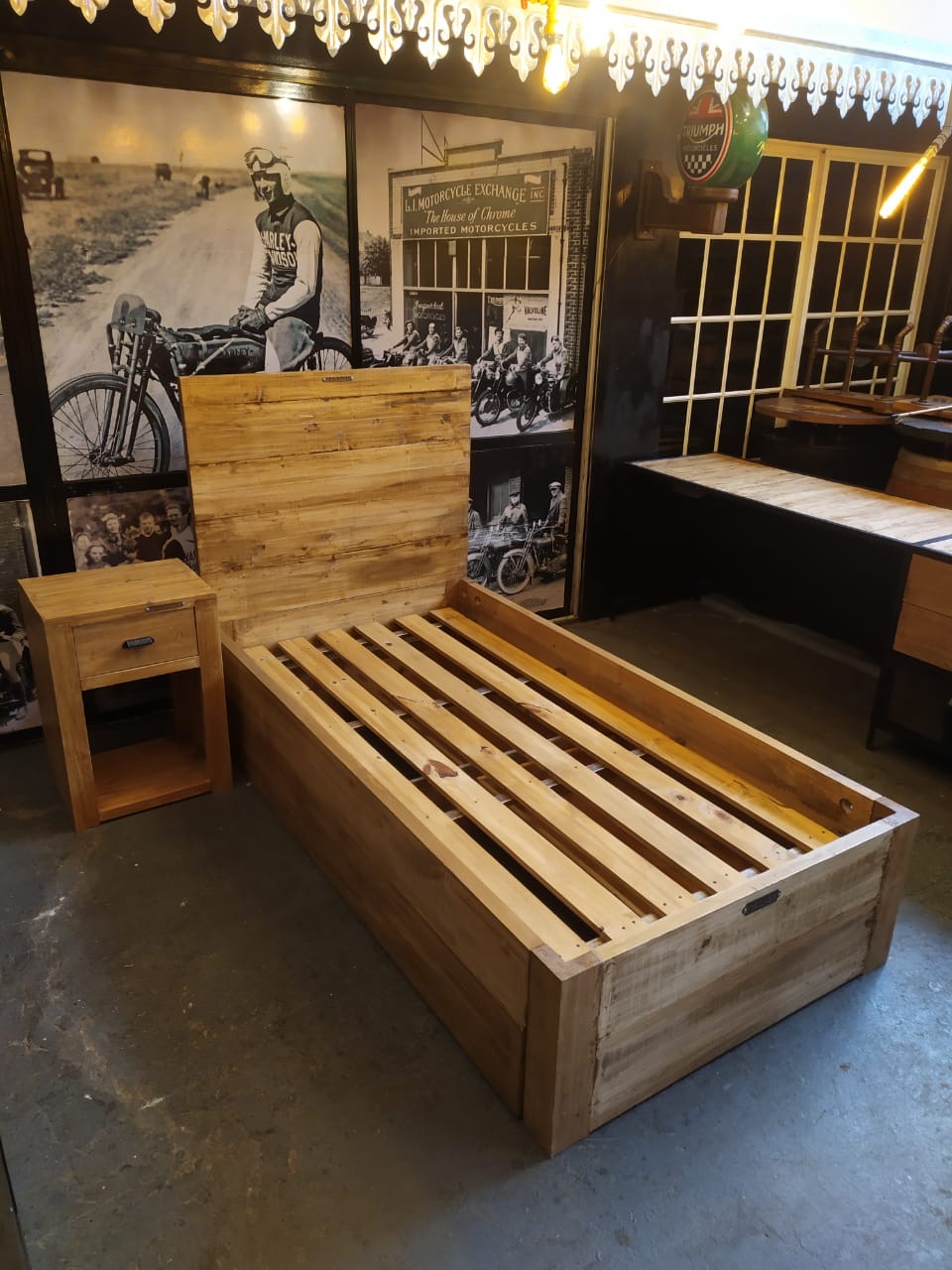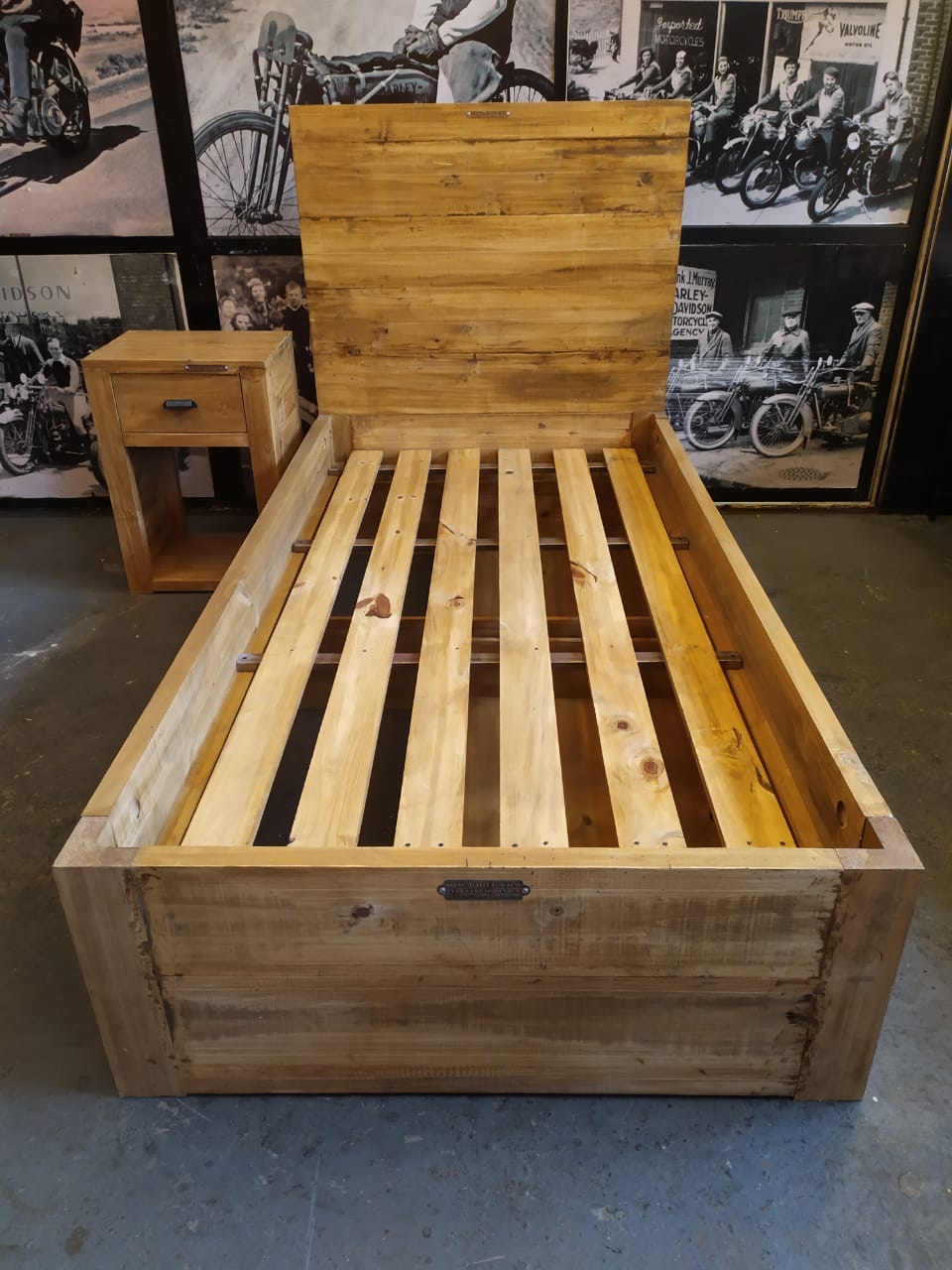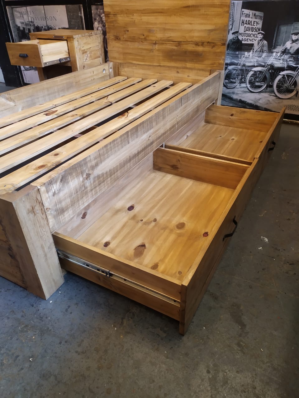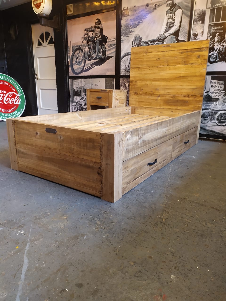 Cama individual en madera con respaldo de tablones y cajones laterales con guías telescópicas