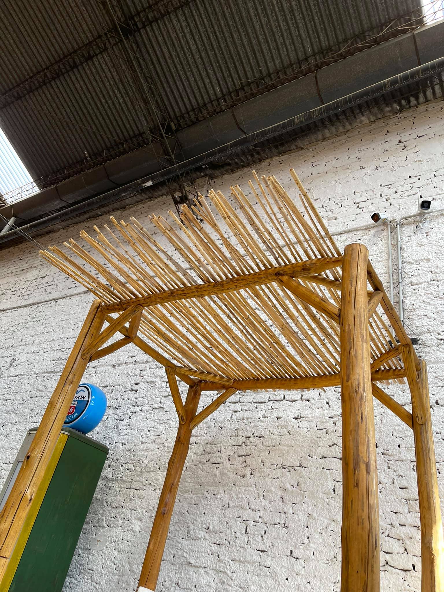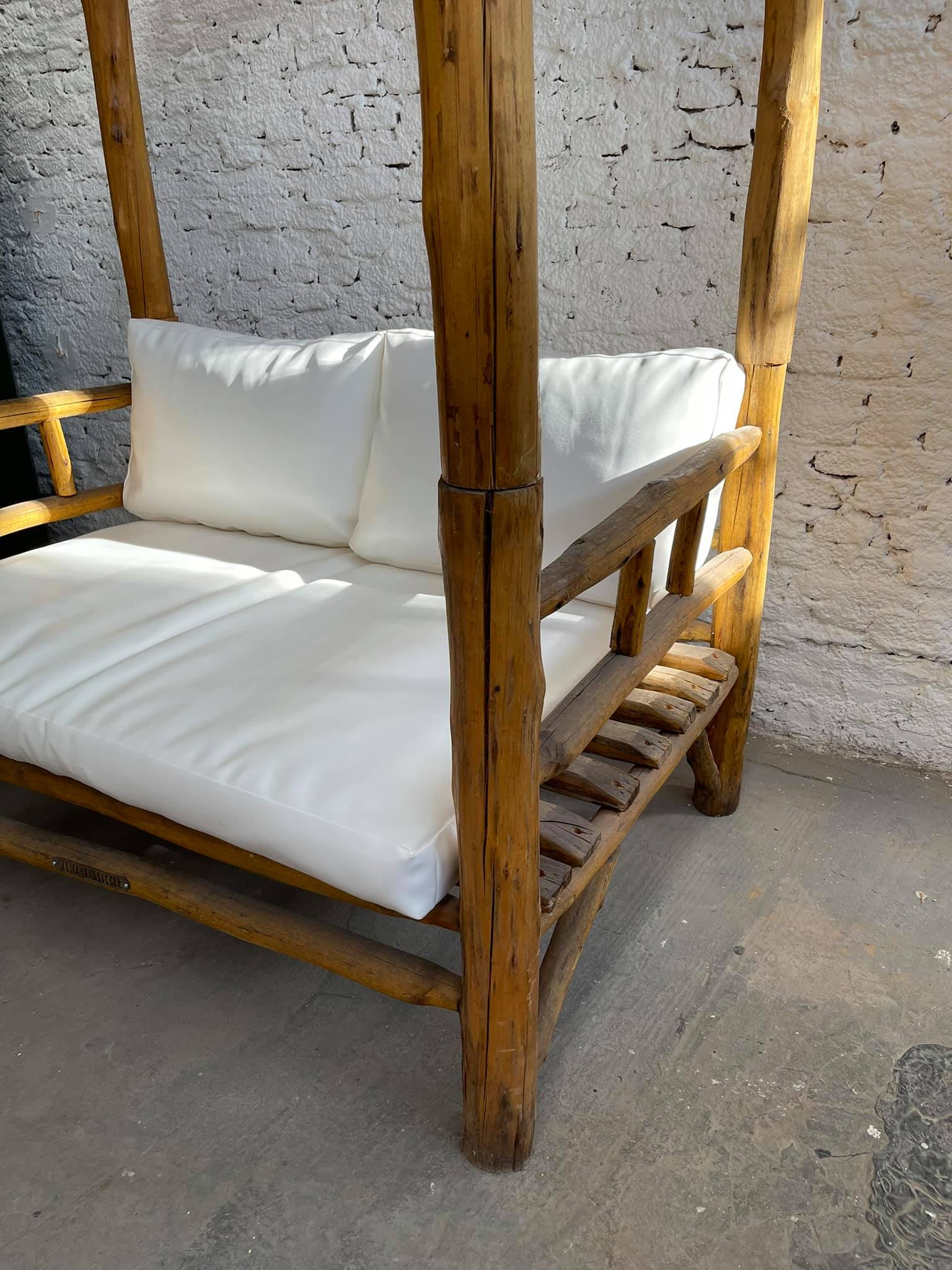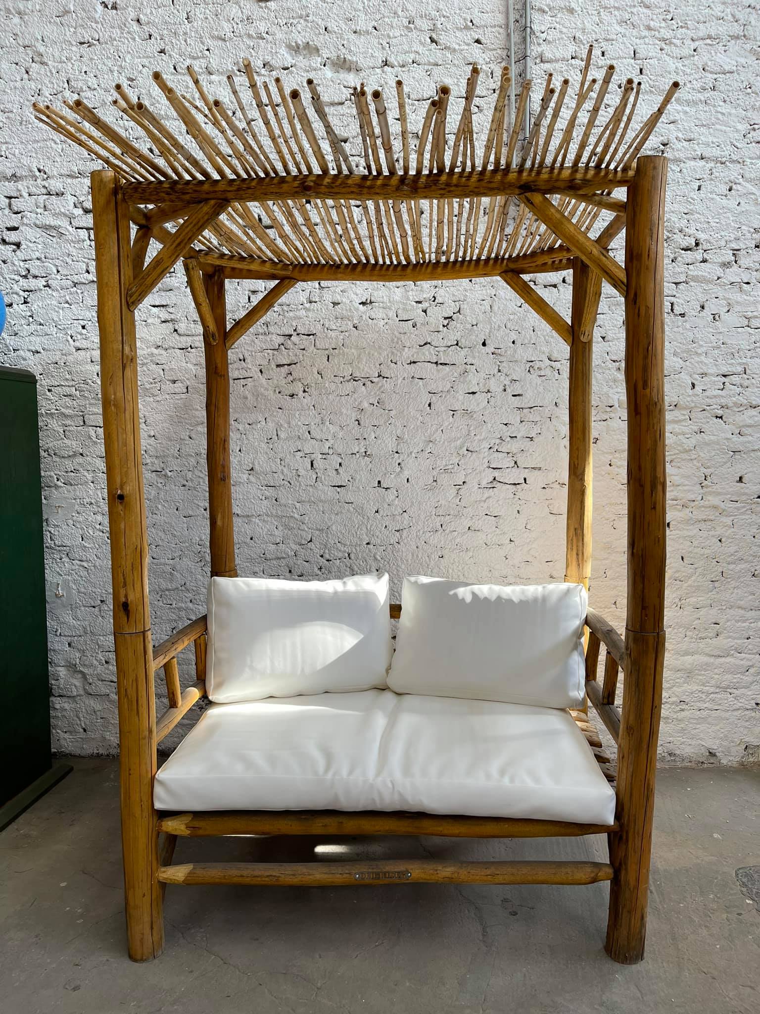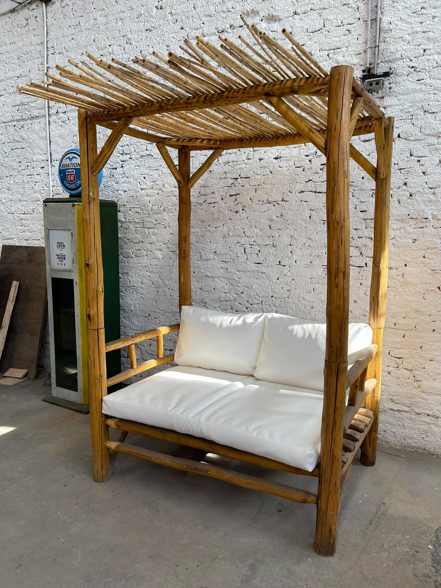 Camastro de caña con techo de varillas y almohadones tapizados en color blanco.
