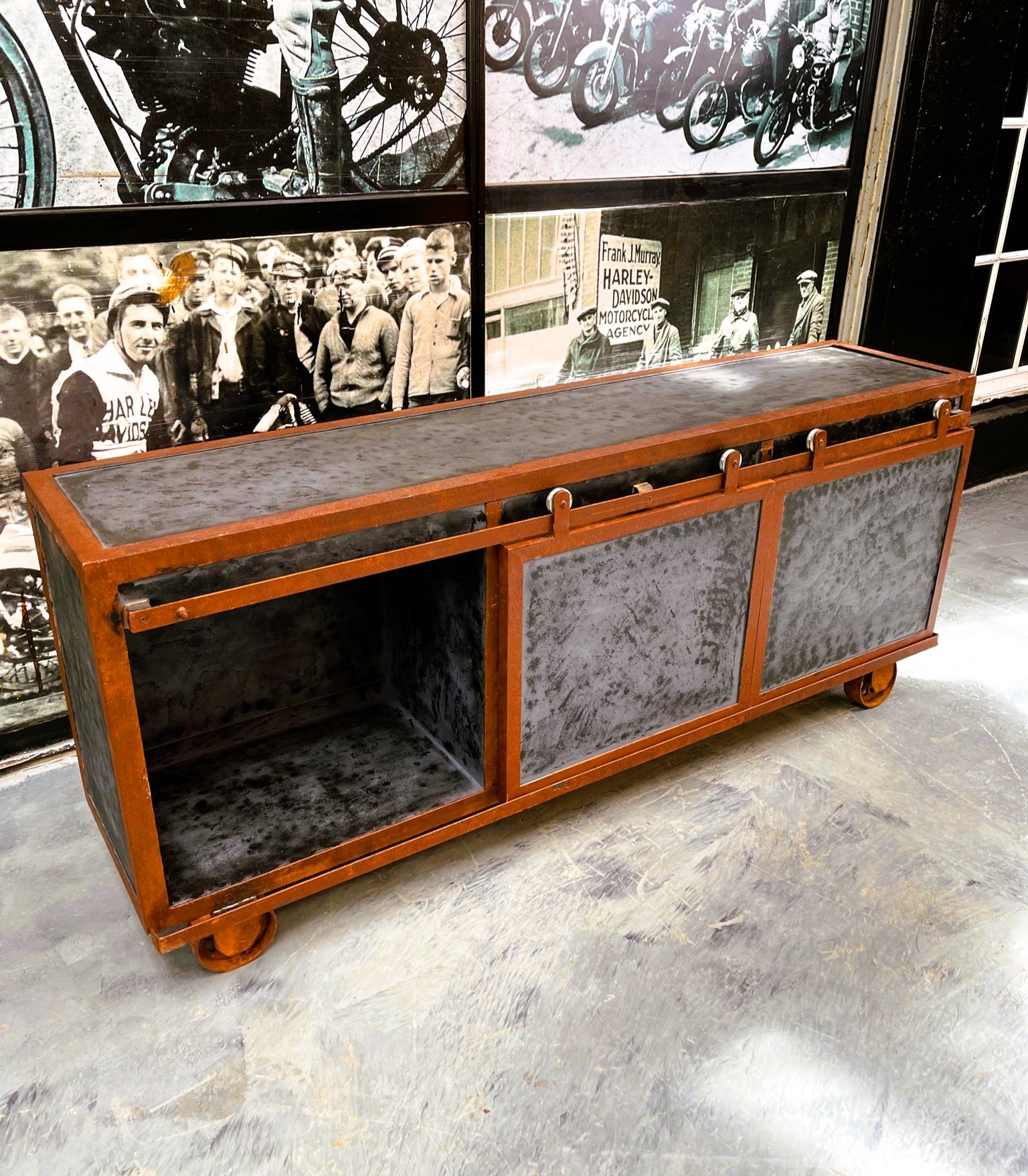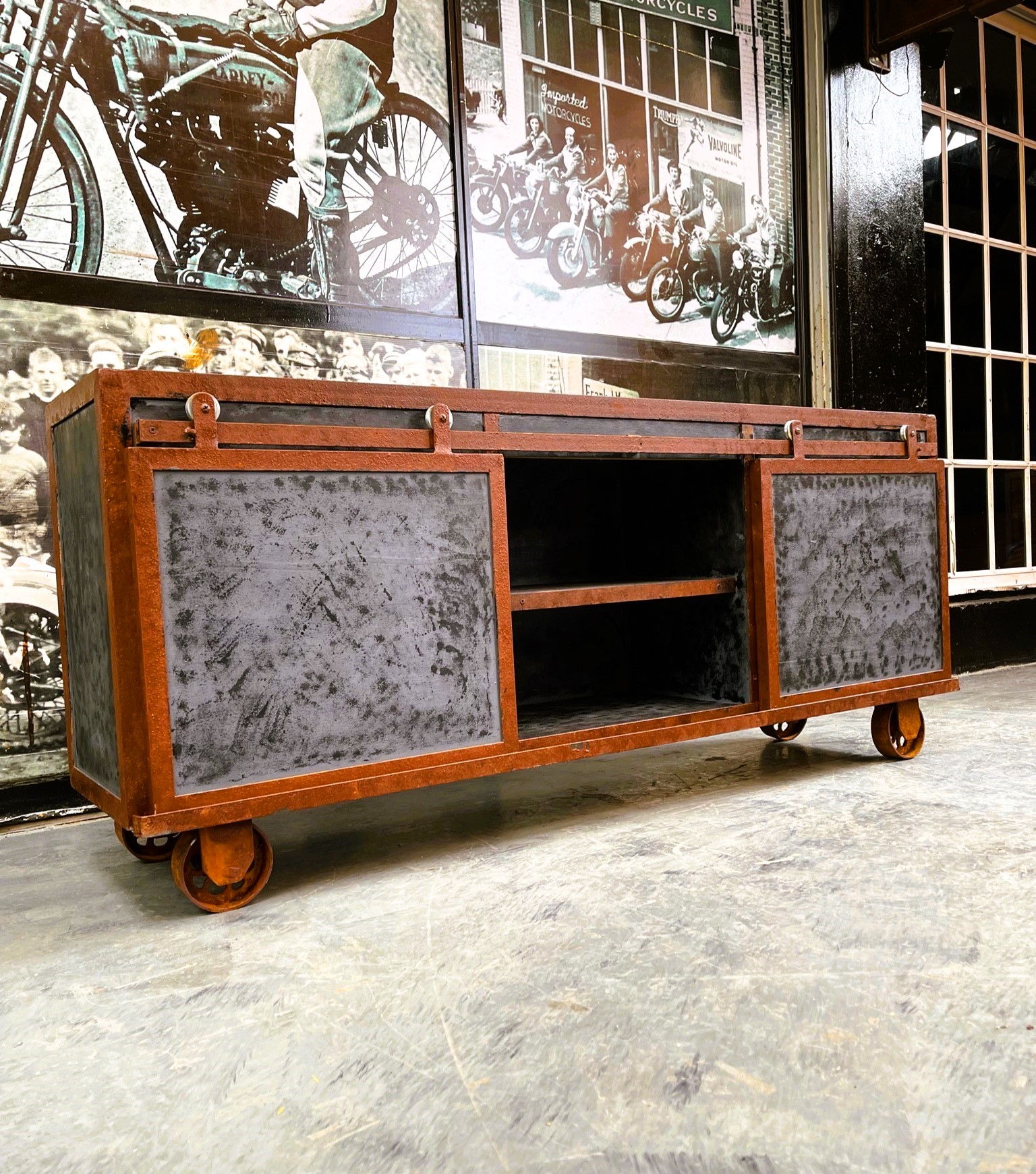 Mtv con estructura de hierro oxidado, frentes en chapa negra texturada y ruedas industriales