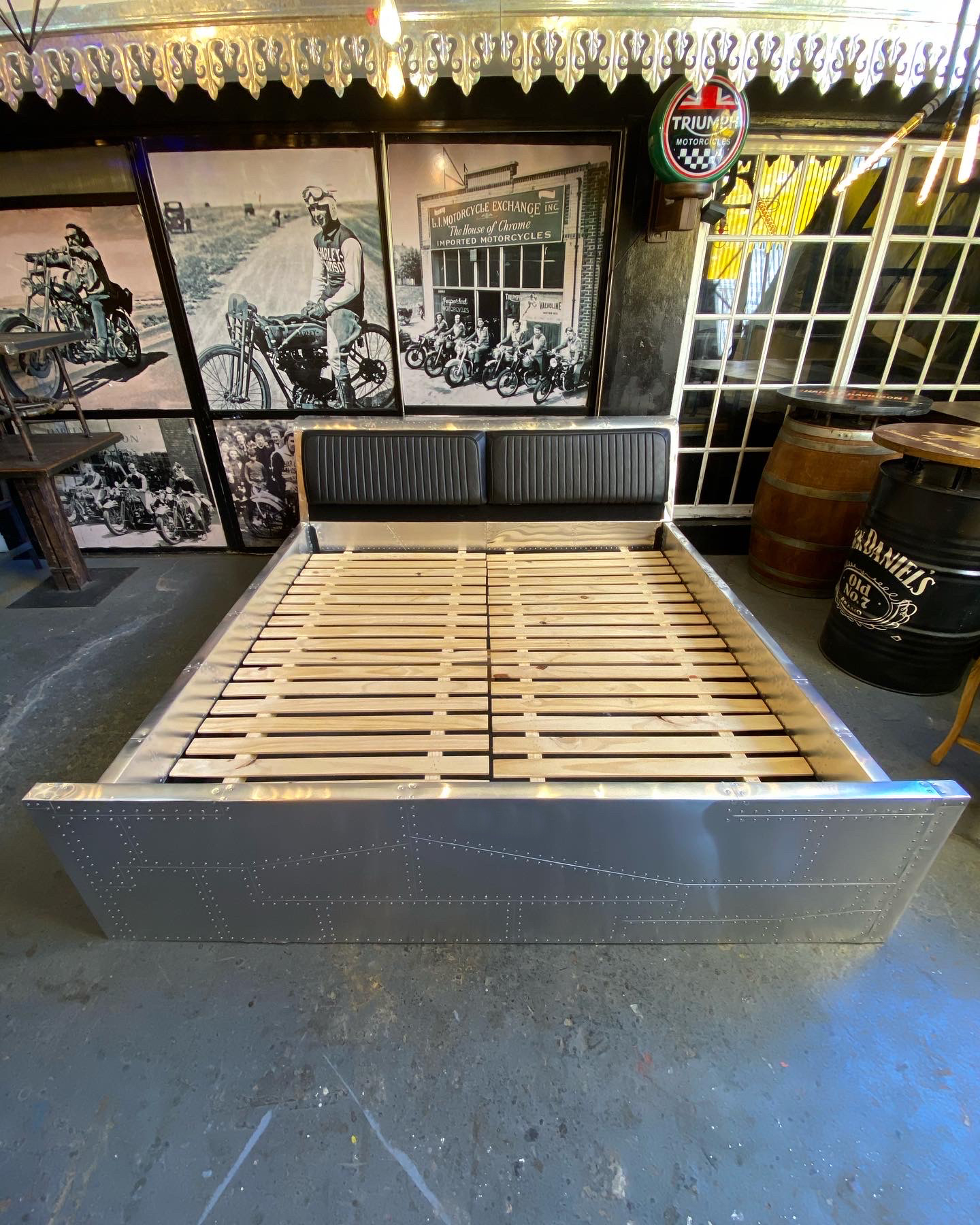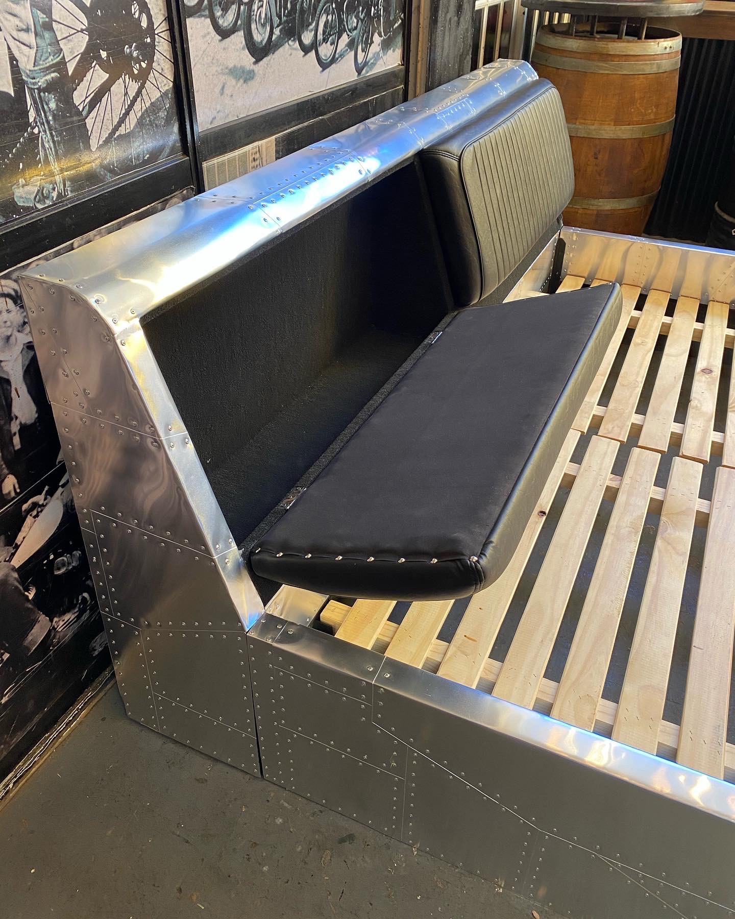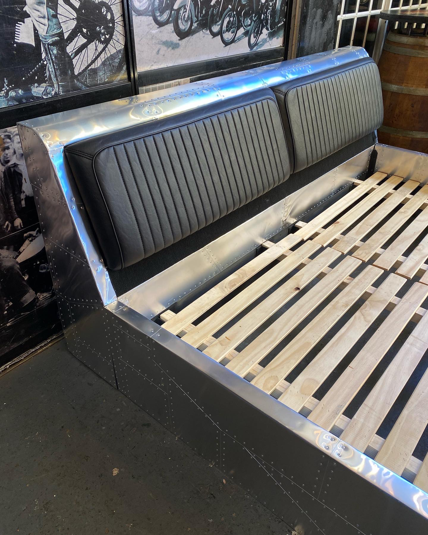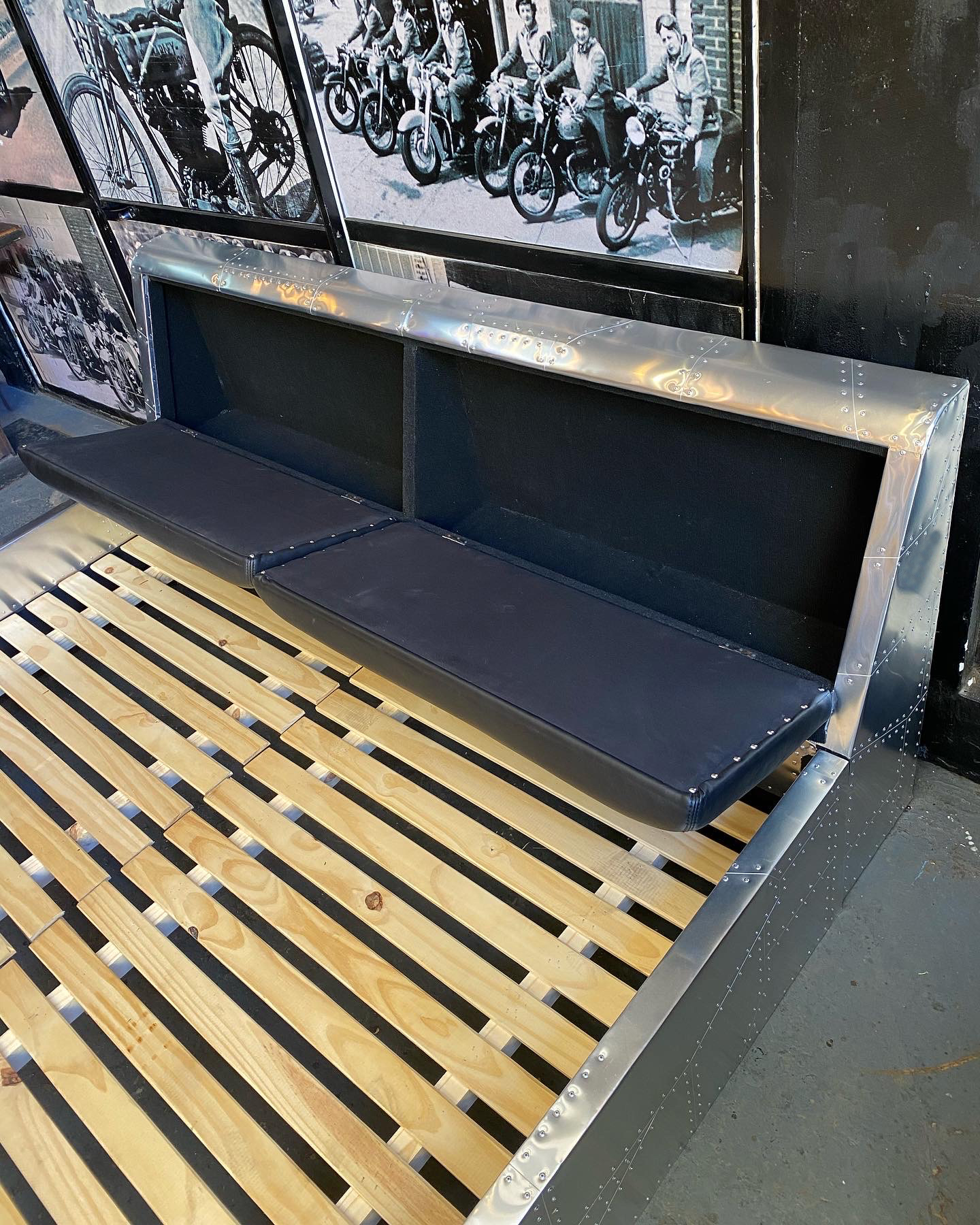 Cama aviator con estructura en aluminio remachado, respaldo tapizado en cuero y base de madera.