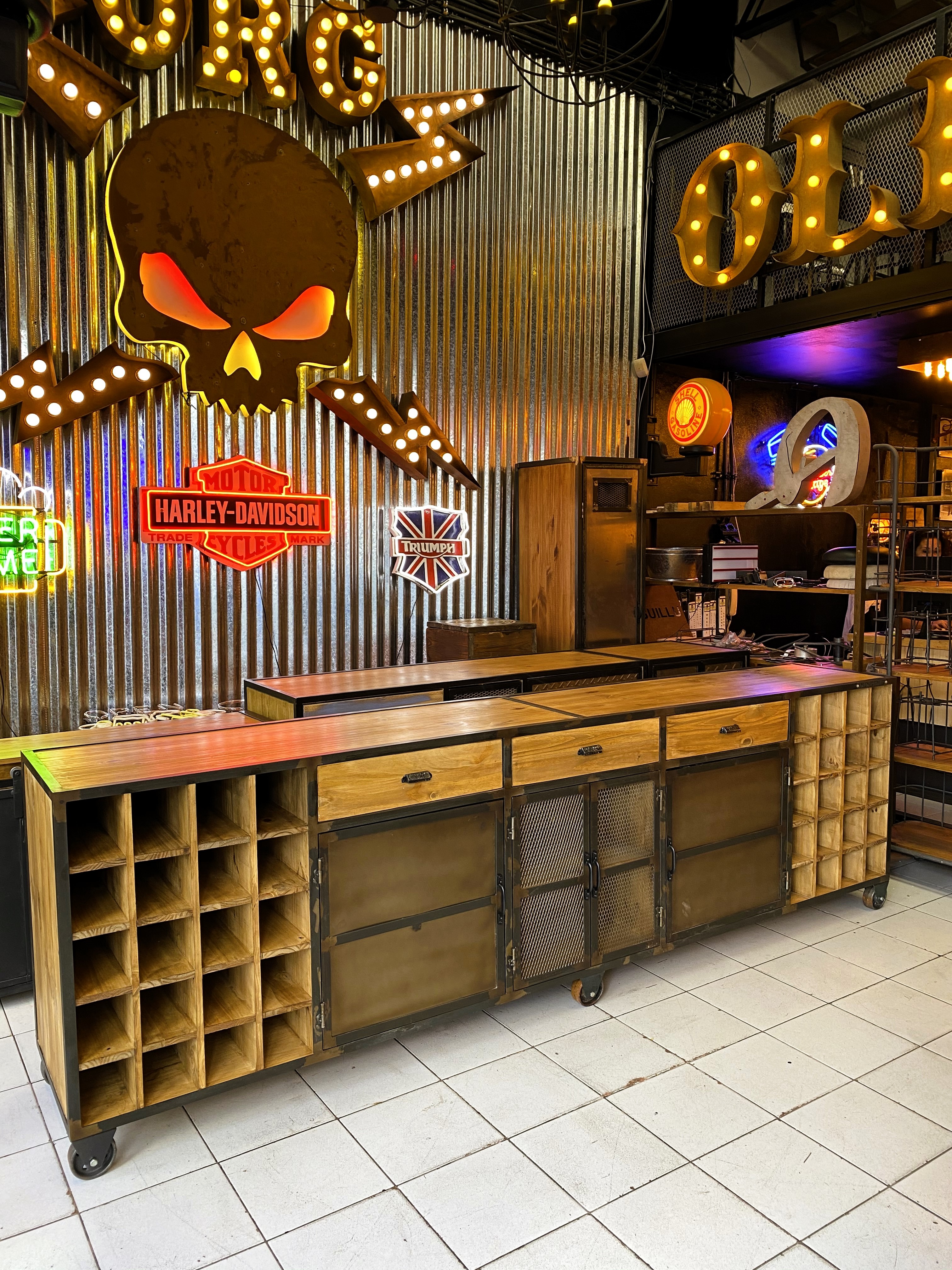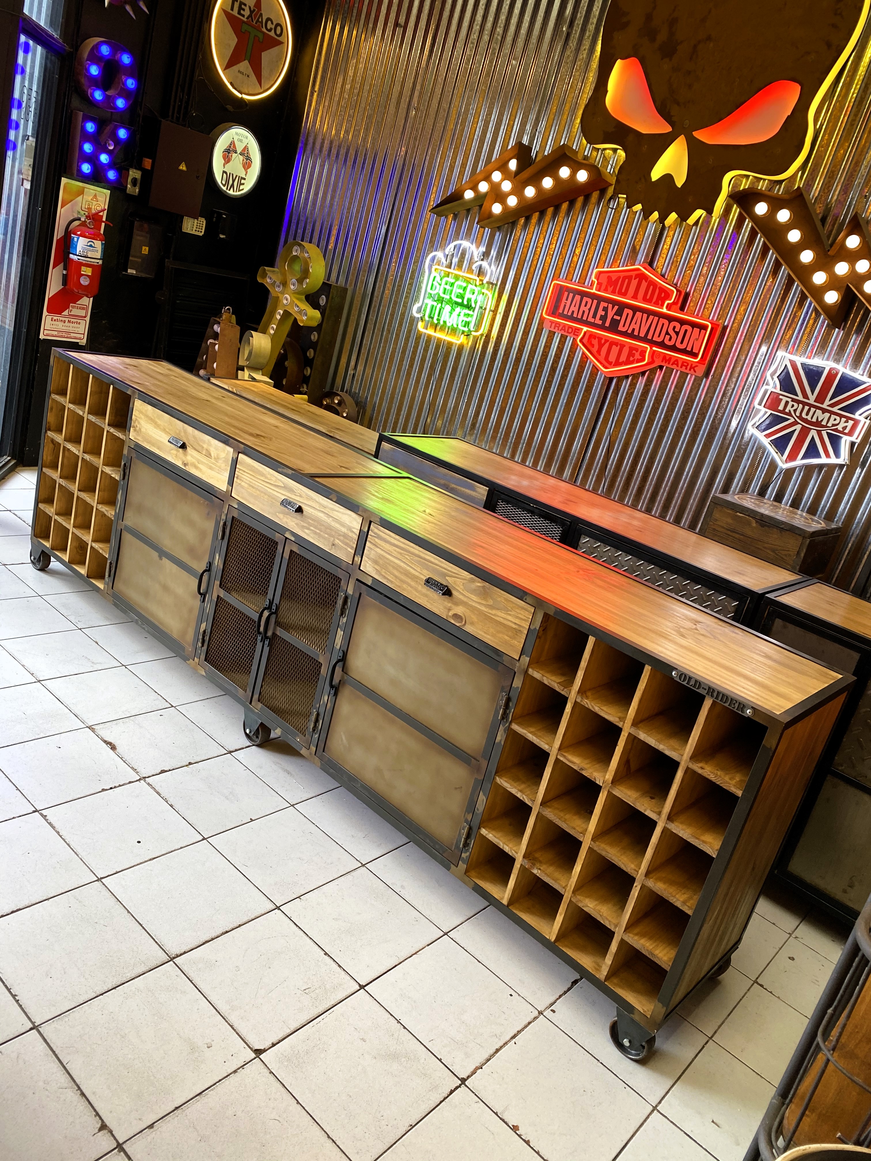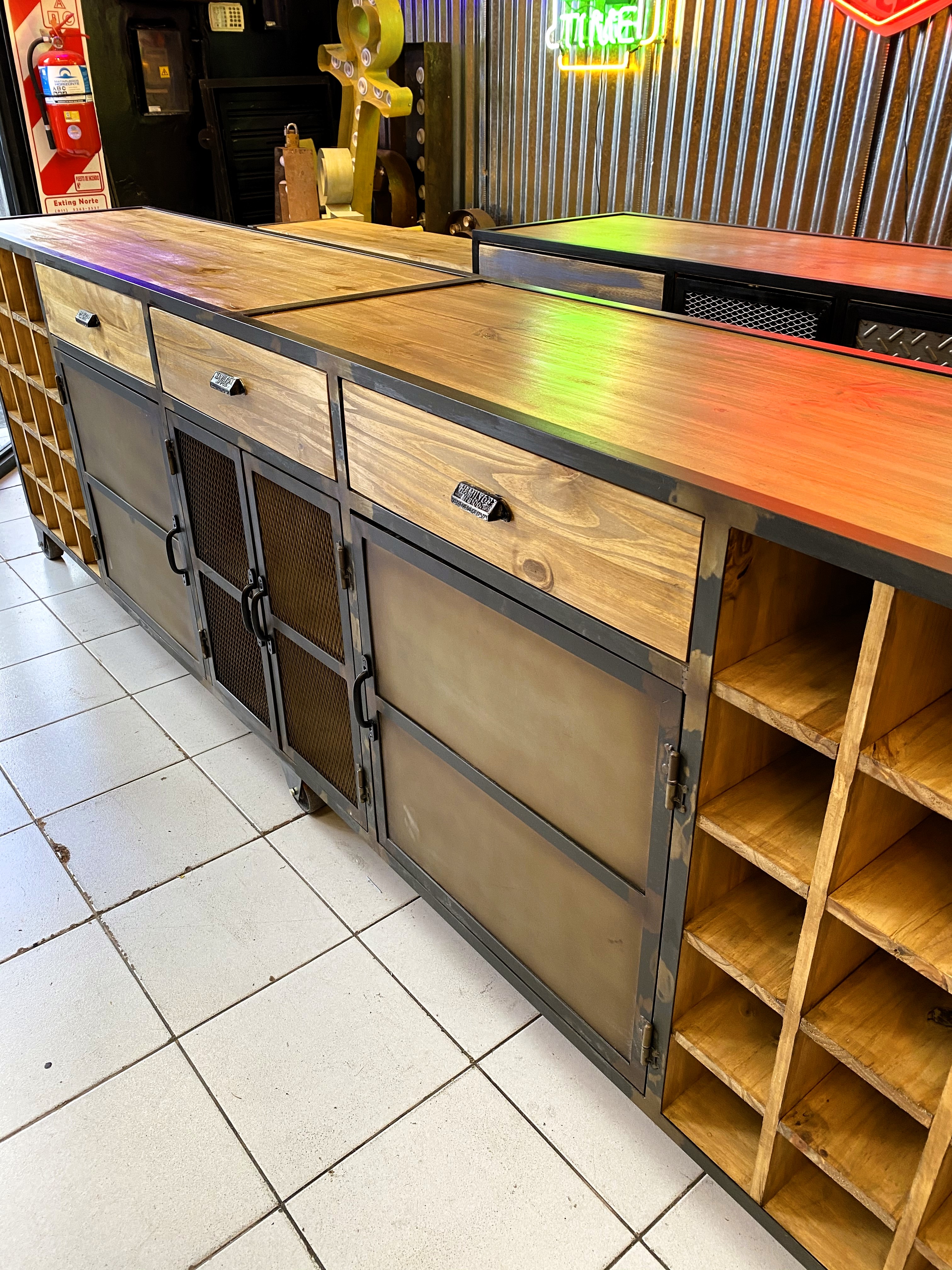 Mtv con bordes en angulo, tapas de madera, cajones y módulos cava con ruedas industriales.