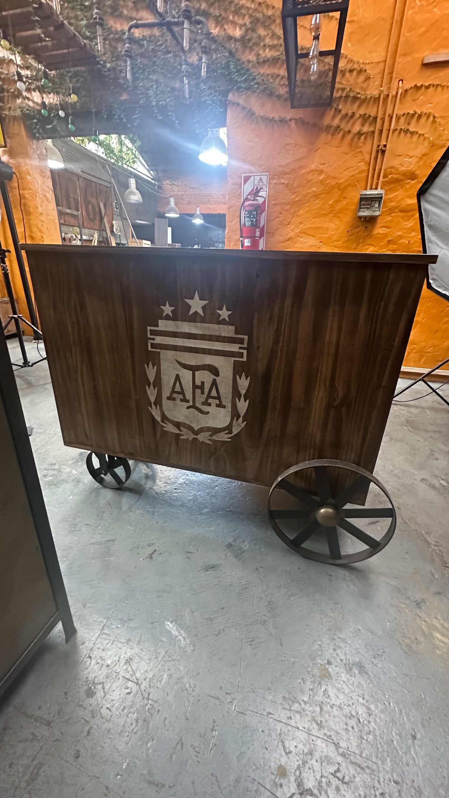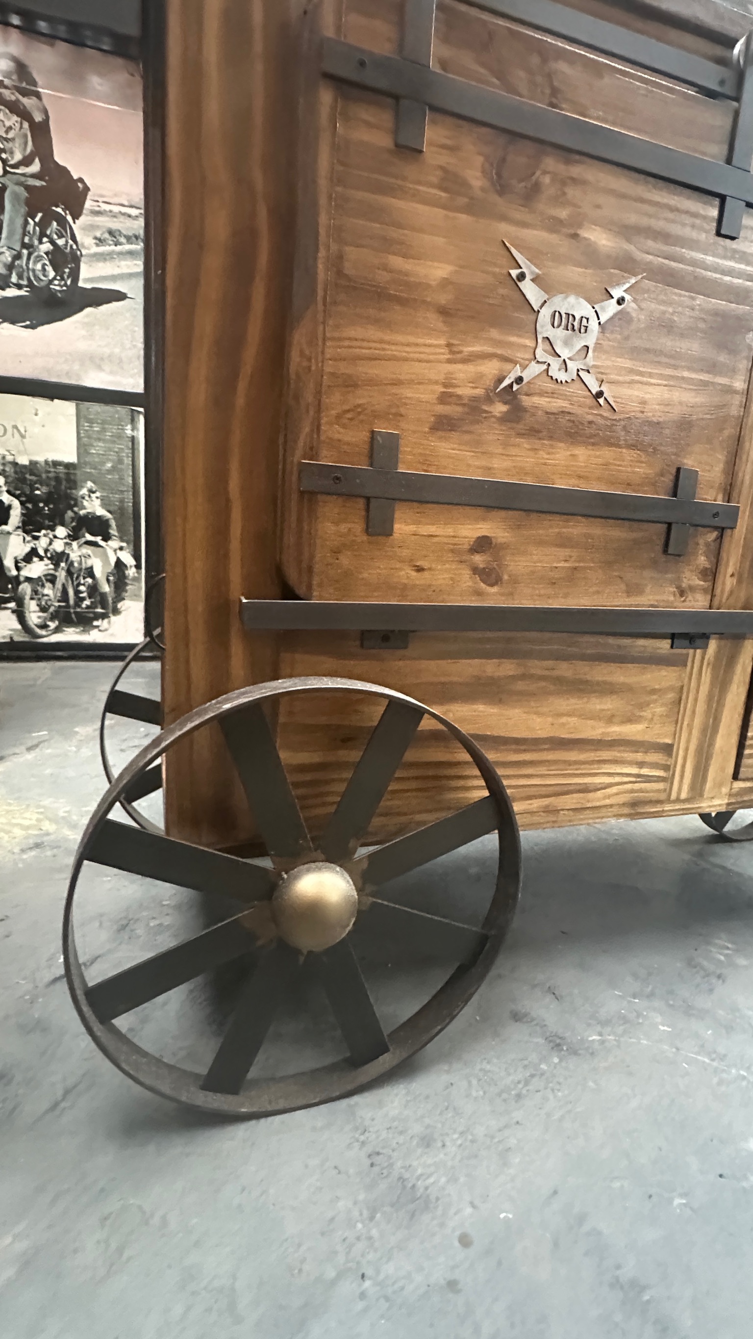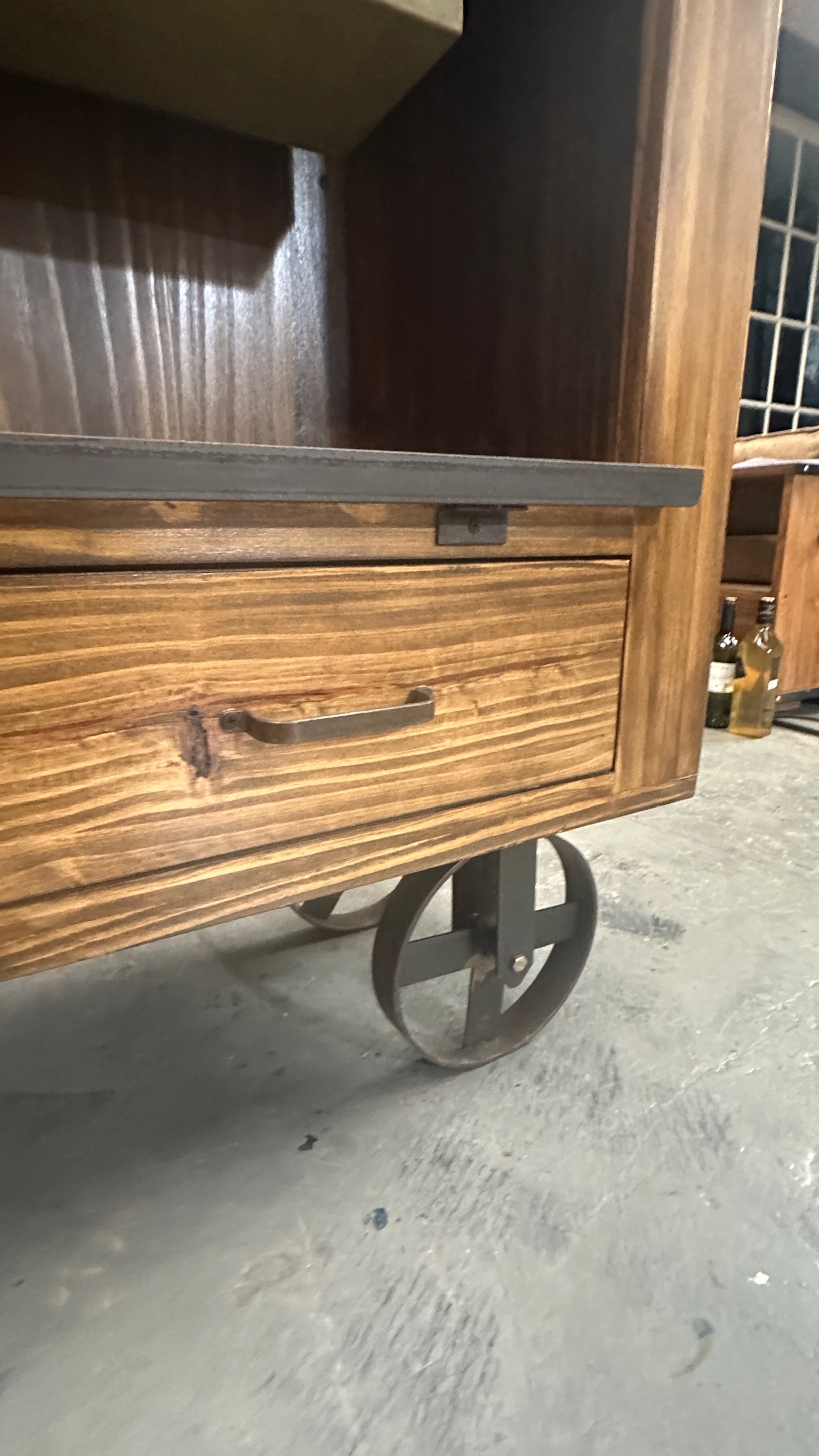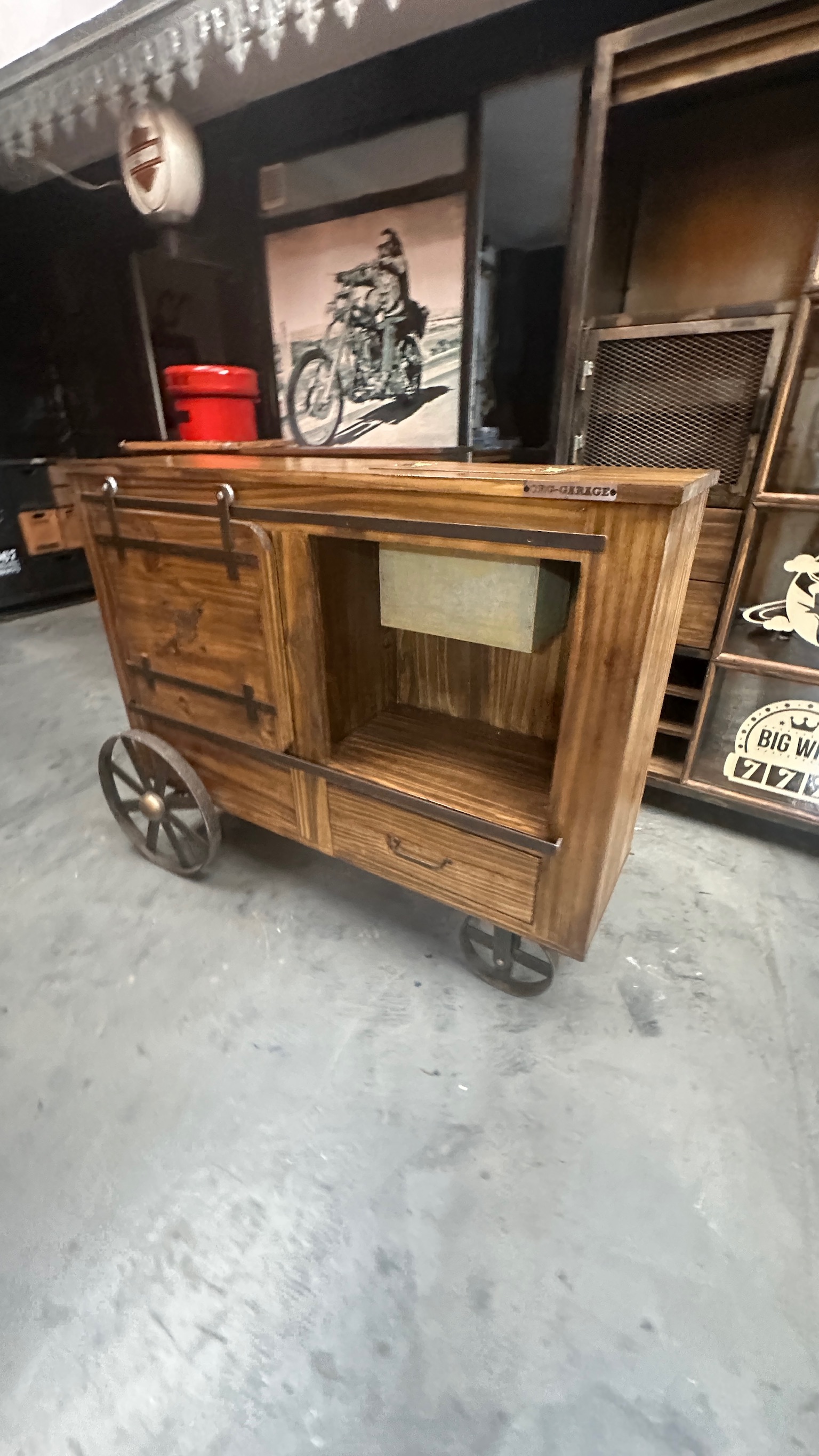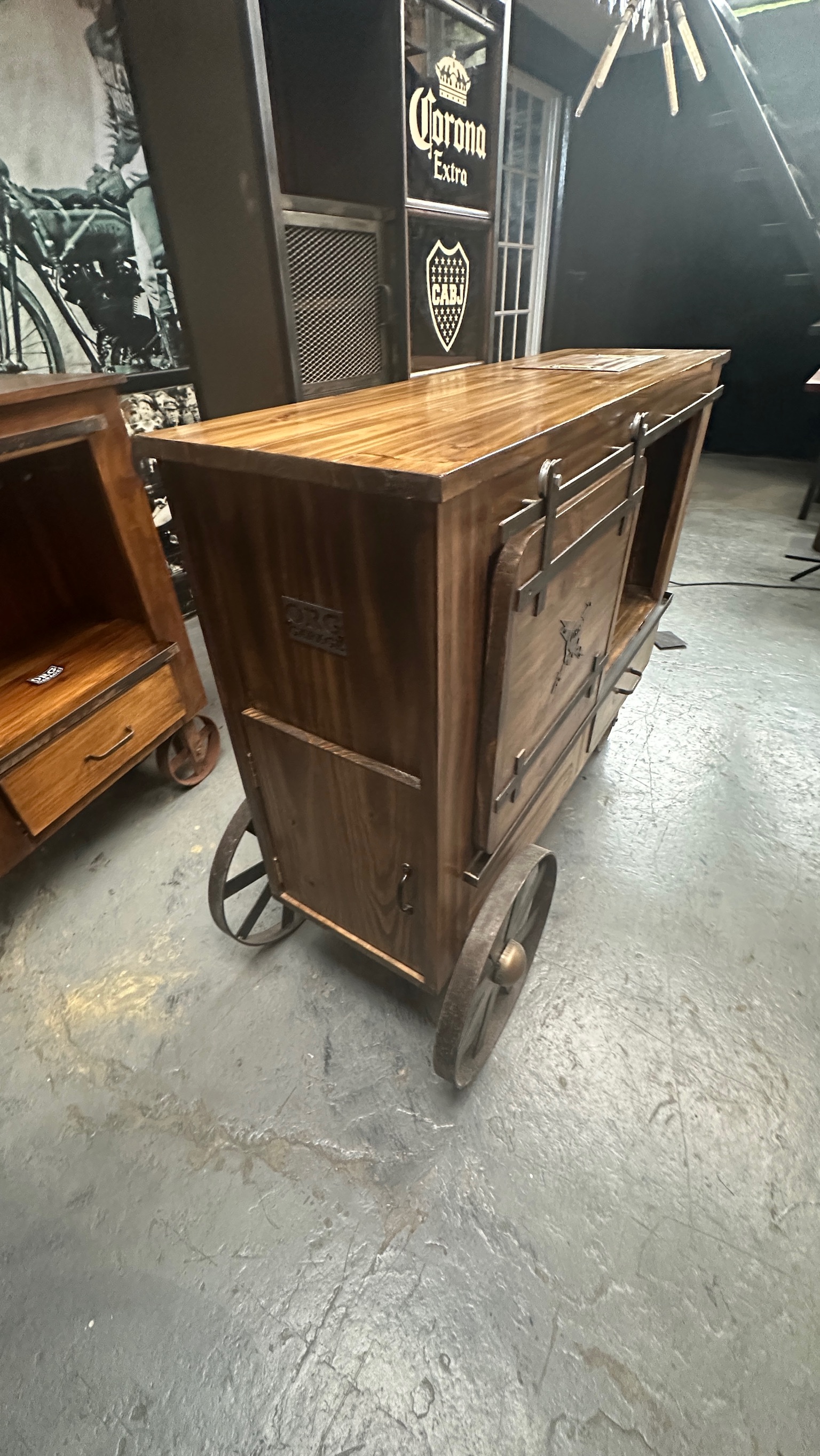madera maciza, con ruedas metálicas, puerta granero y cajones, estilo clasico industrial.