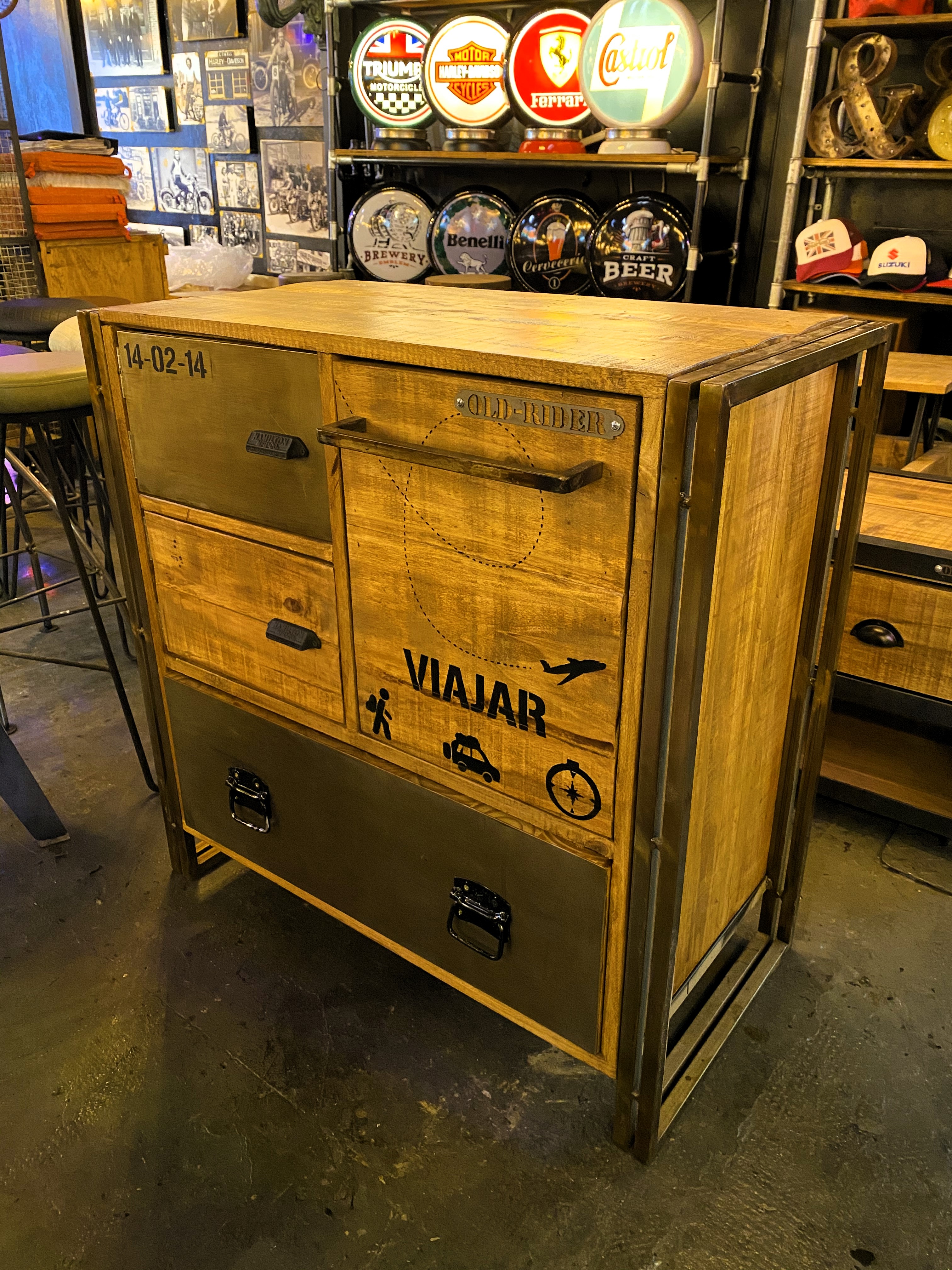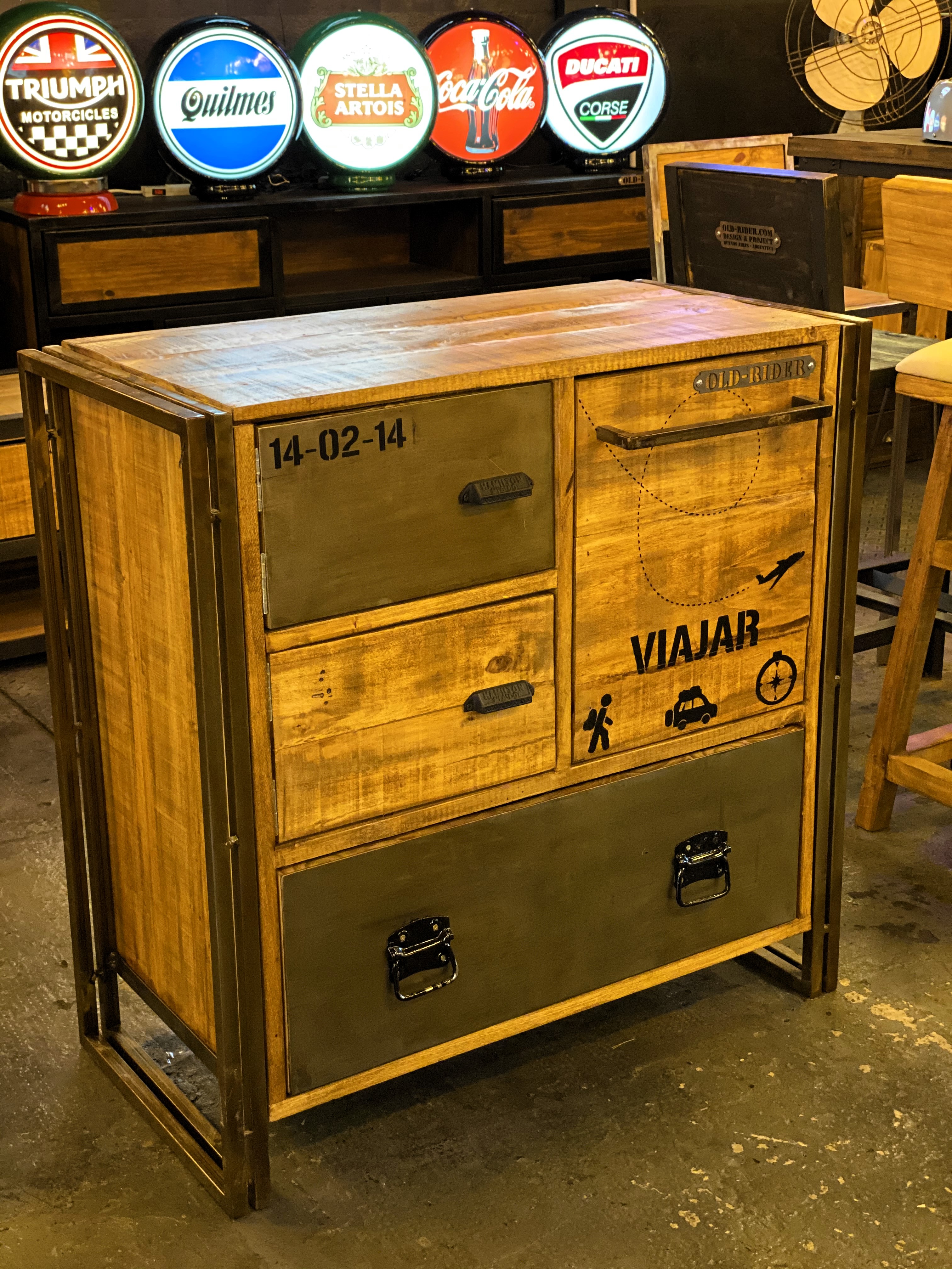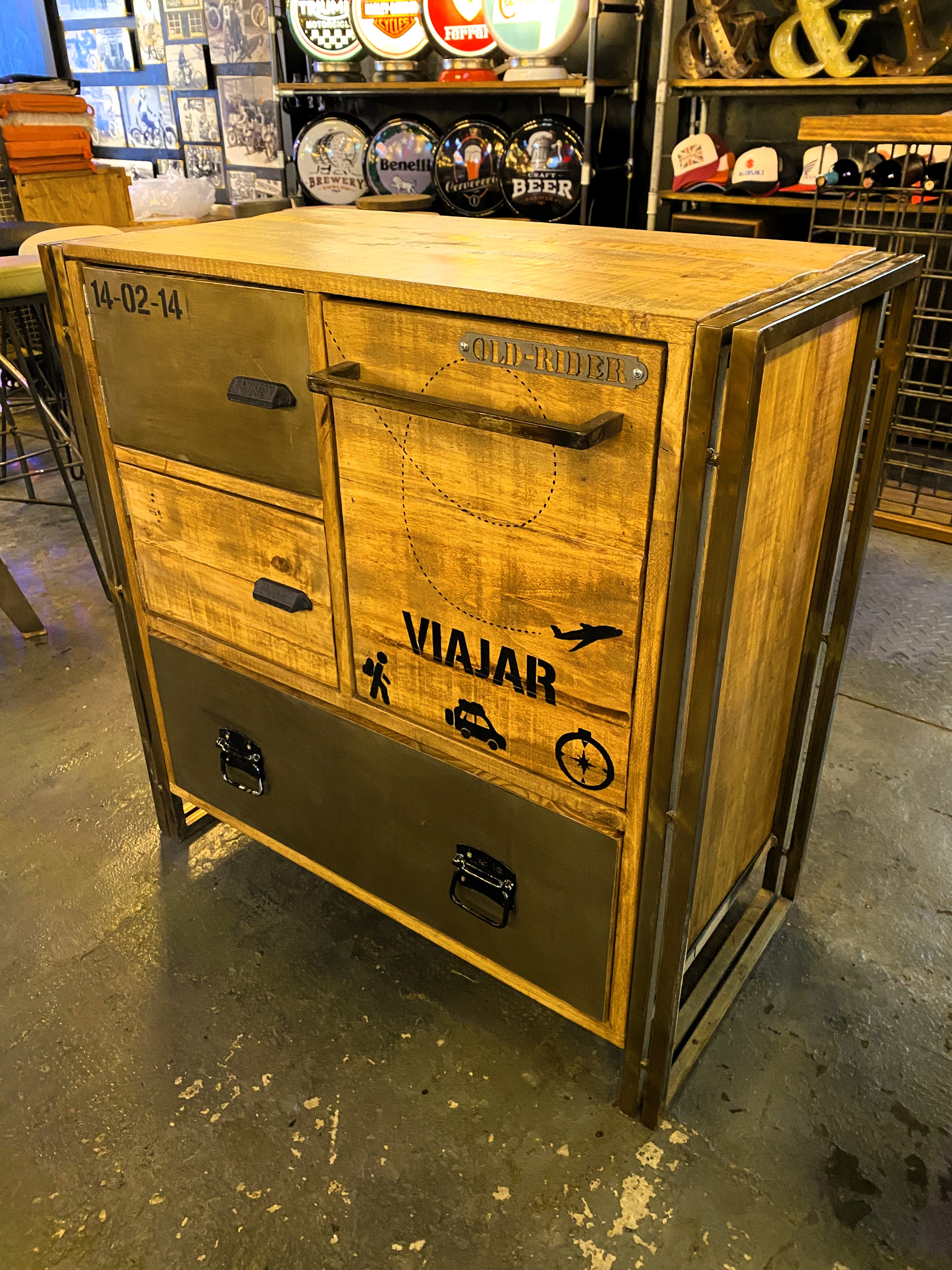 Cajonera de madera y hierro con cajones personalizados grabados y herrajes industriales