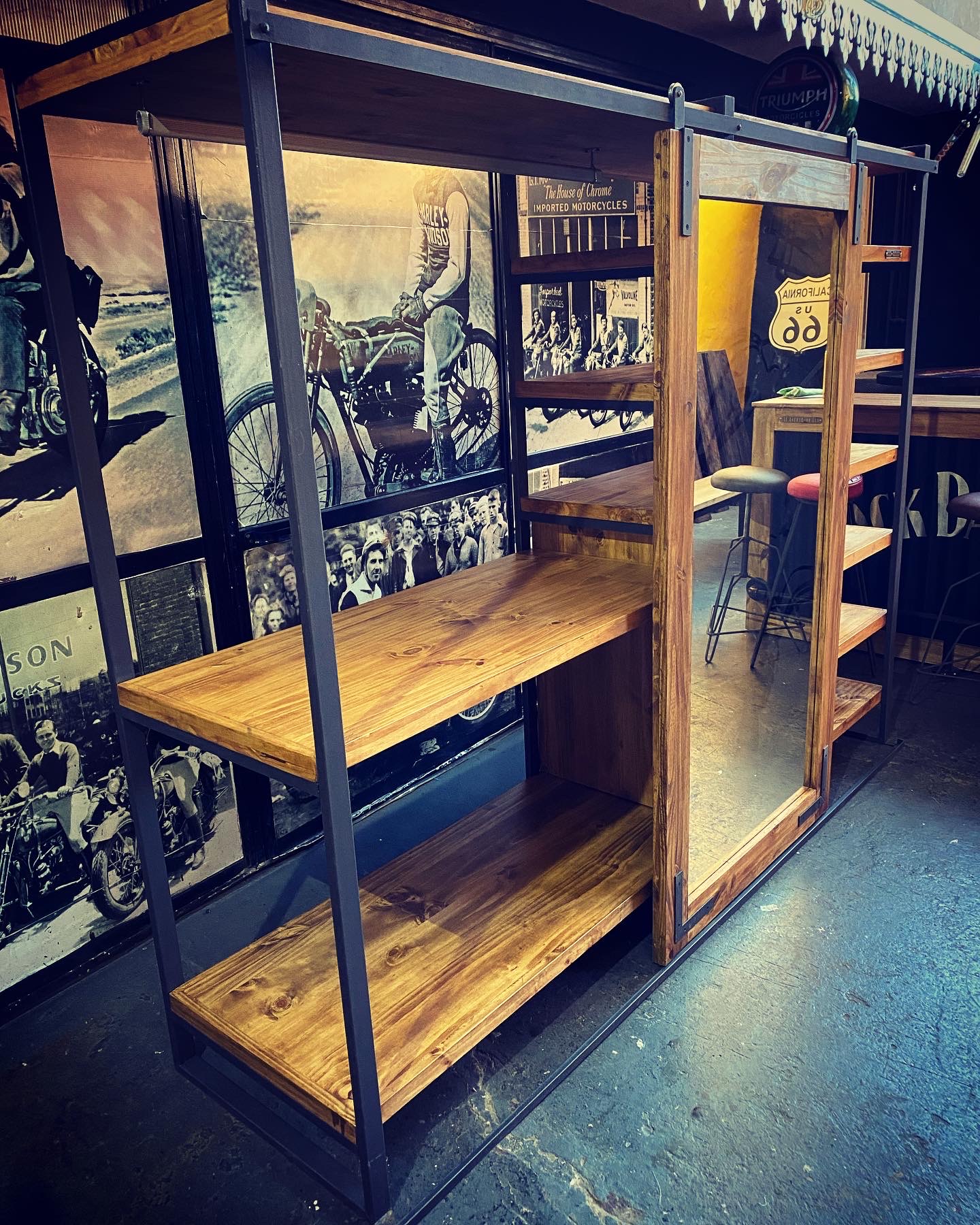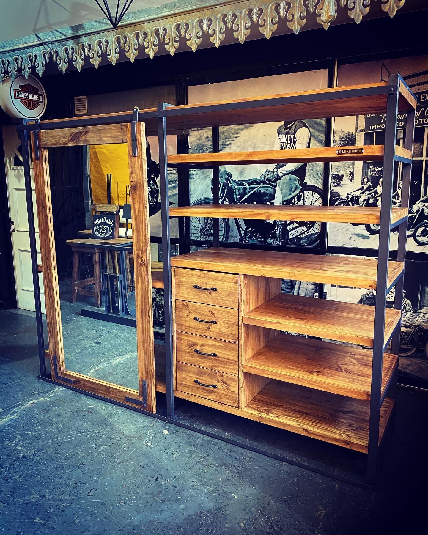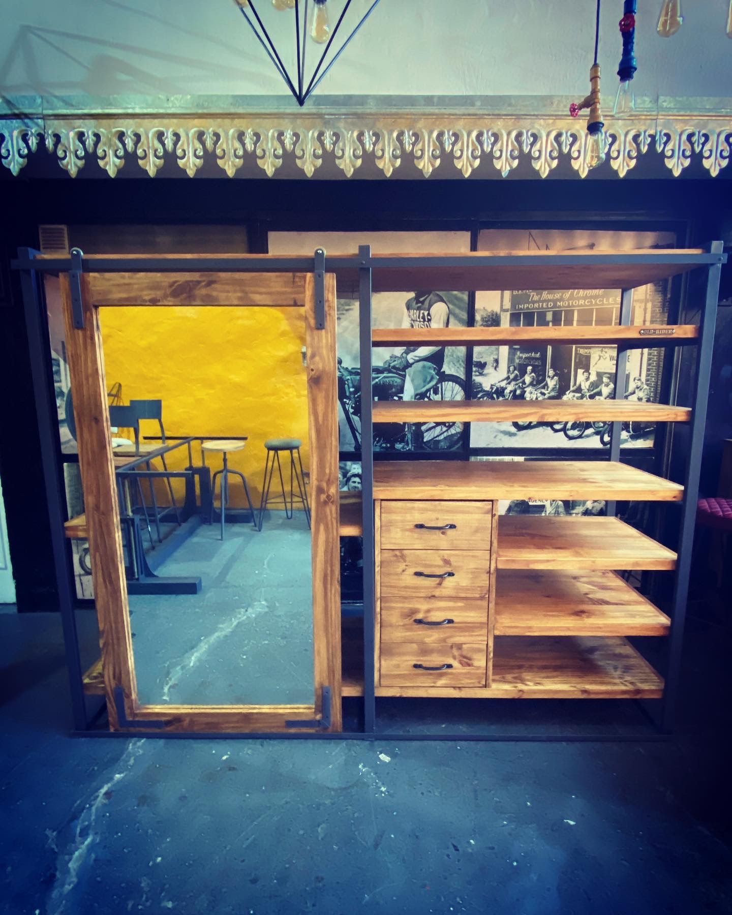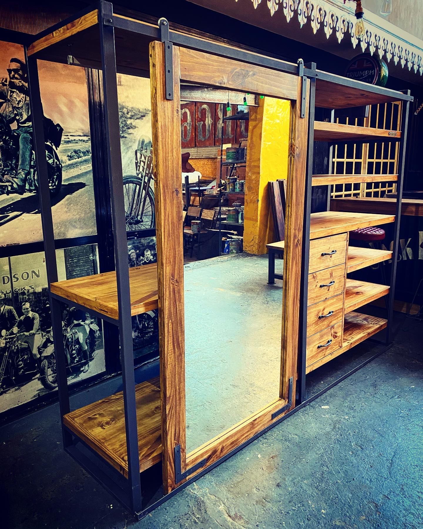 Espejo vestidor con estructura metálica, estantes de madera, cajonera y puerta granero.