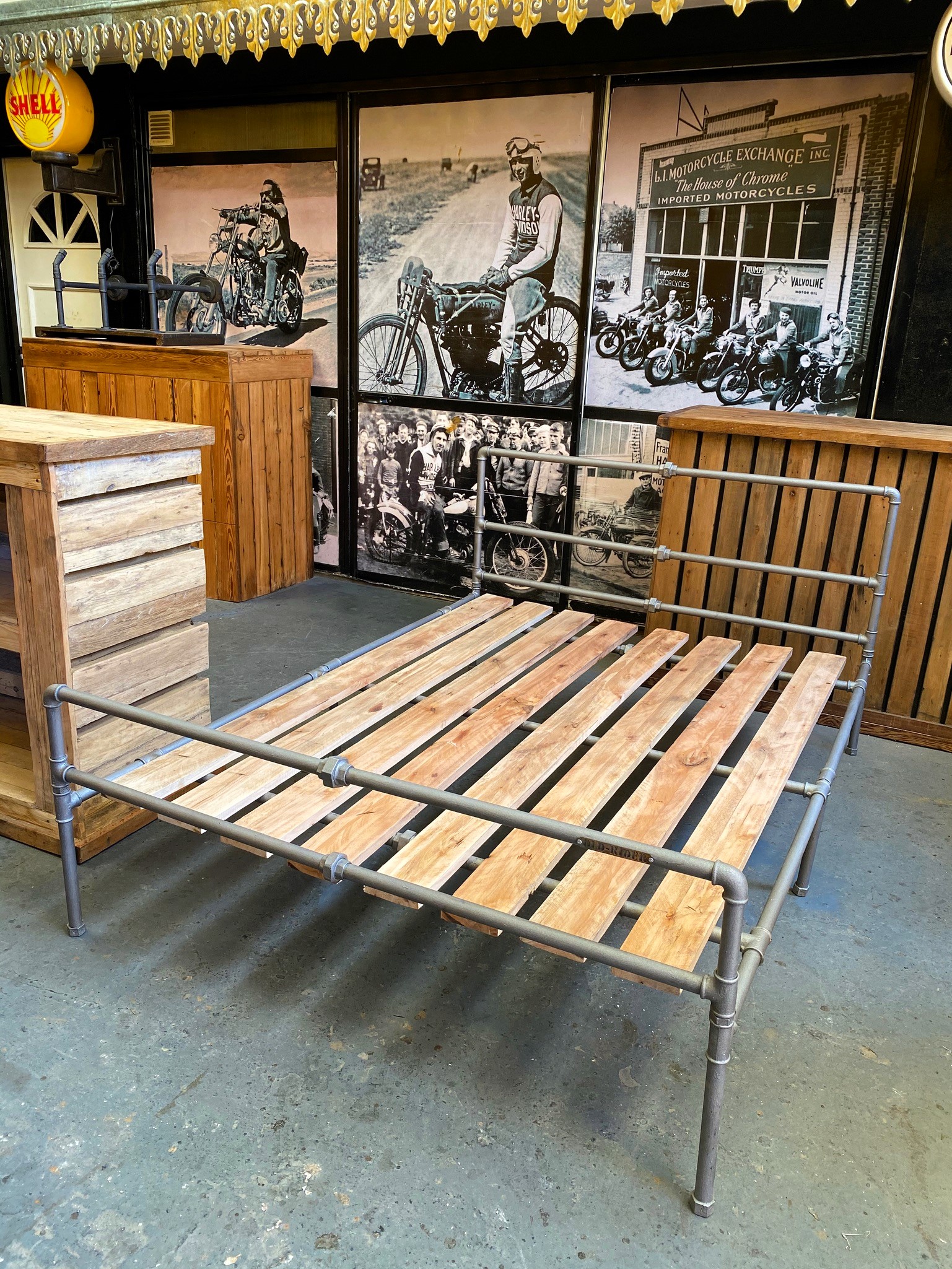 Cama con estructura de caños galvanizados y elasticos en madera clara