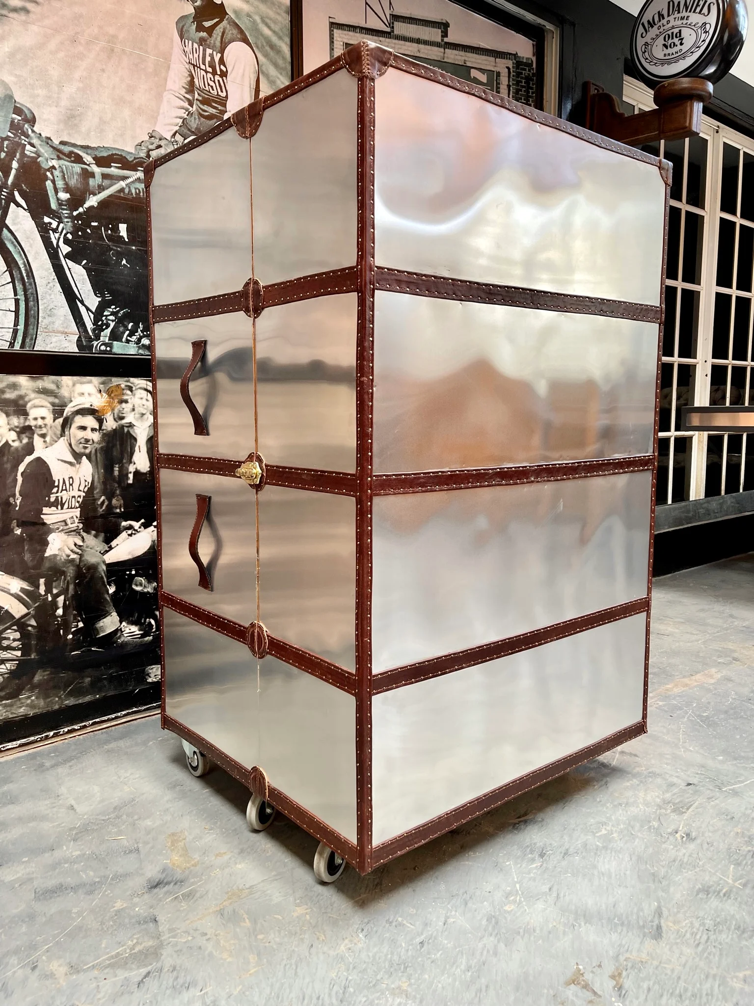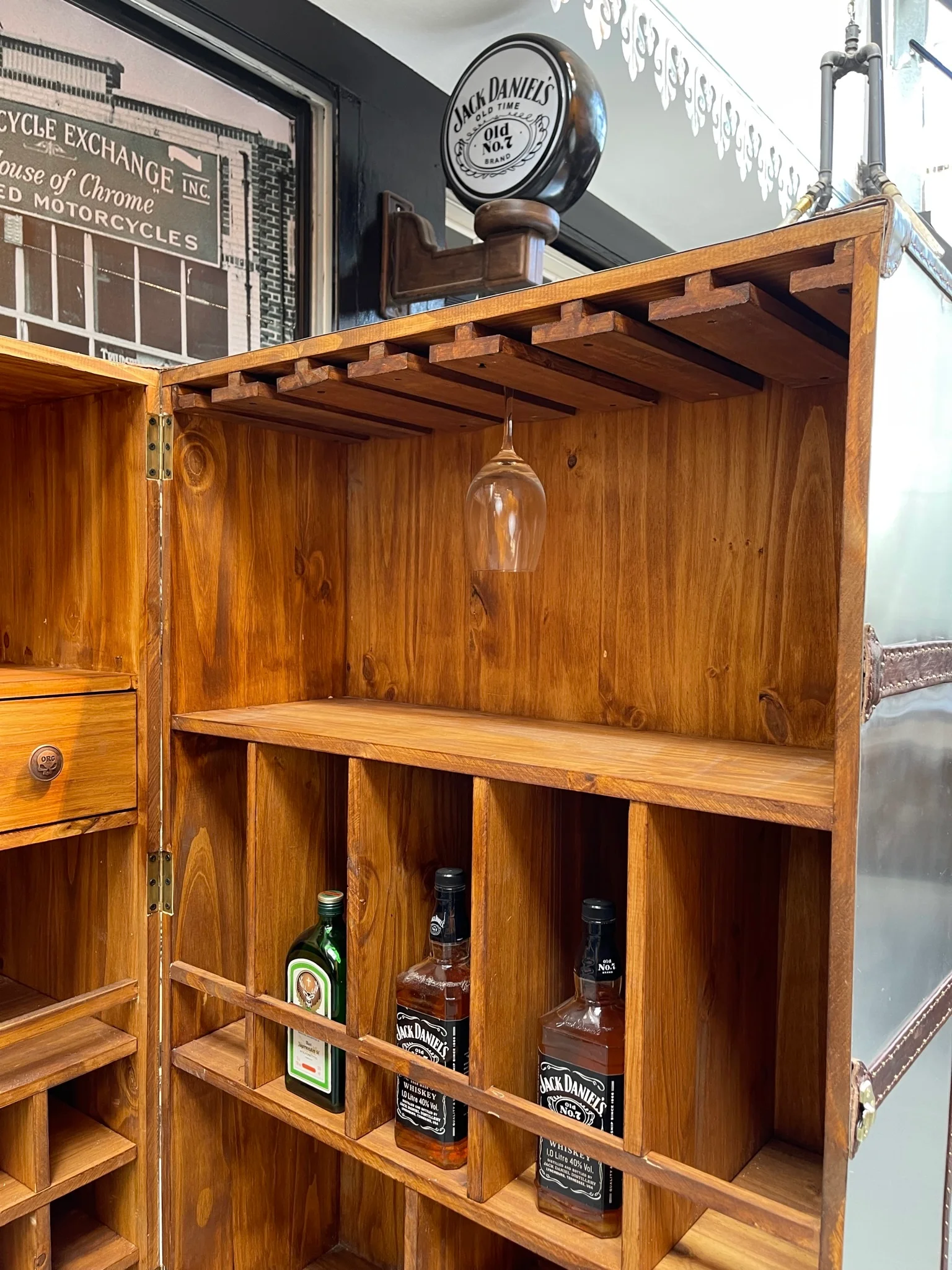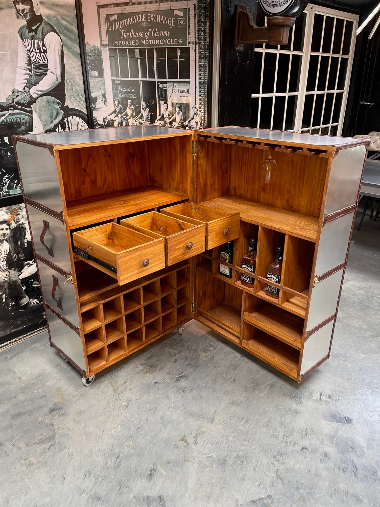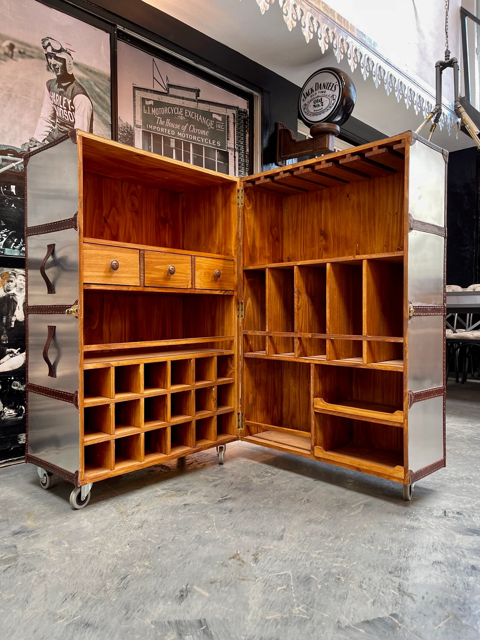 Bodega estilo aviator con terminaciones y manijas de cuero vacuno chocolate e interior de madera.