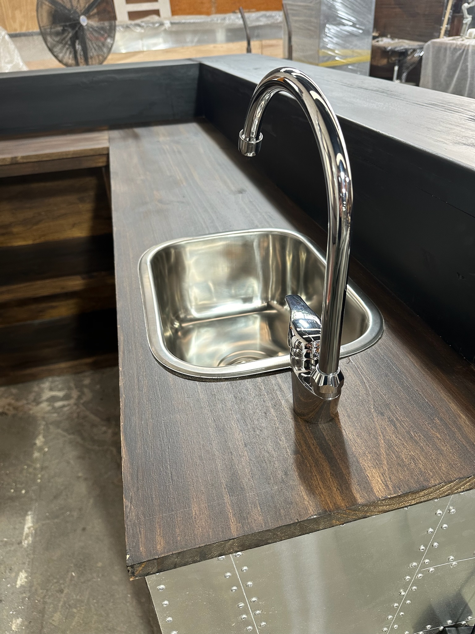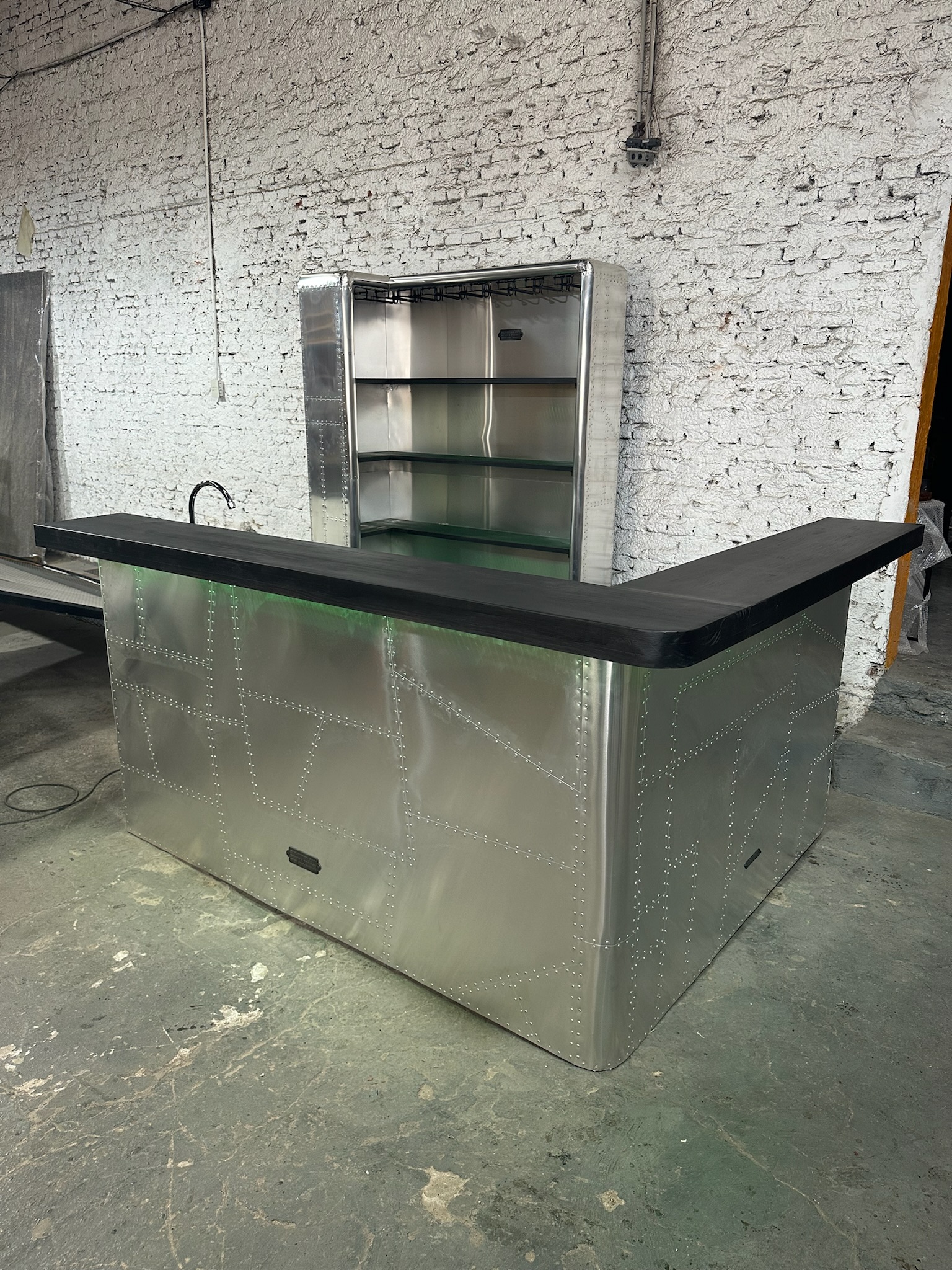 Barra en L con luces led RGB, frente en aluminio e interior en madera oscura con bacha frapera.
