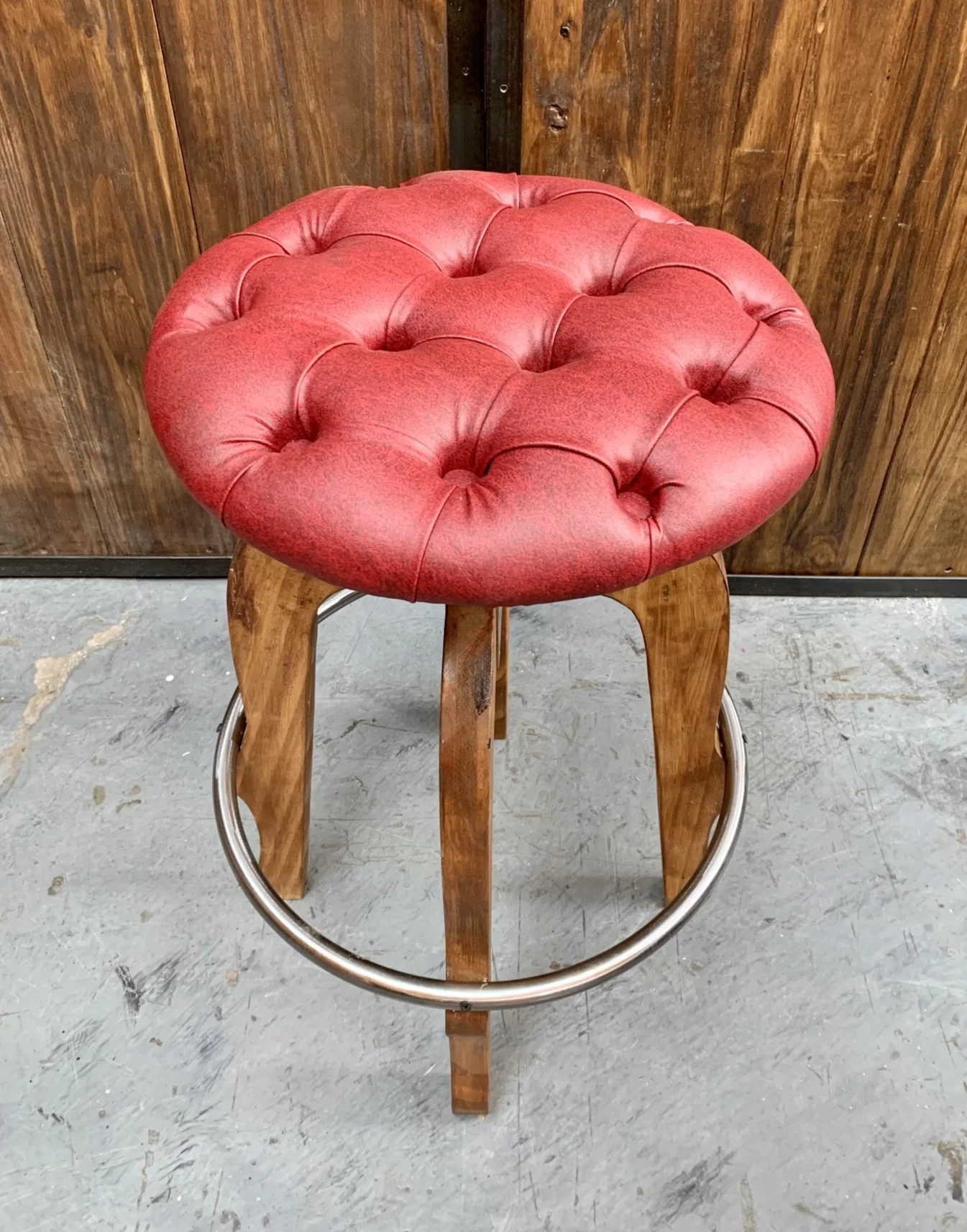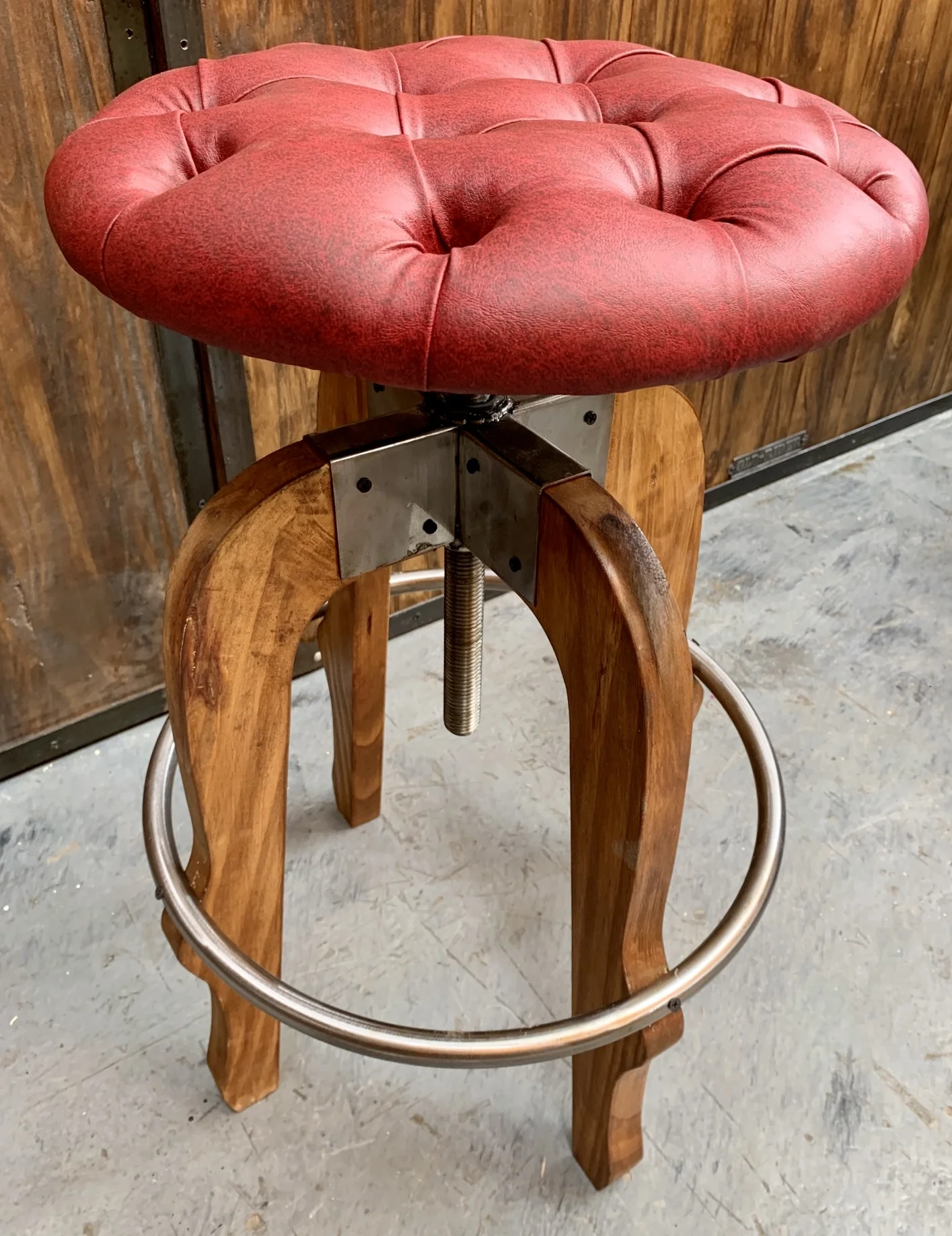Banqueta de cuero con acolchonado en capitoné. Patas de madera y apoya pies de metal.