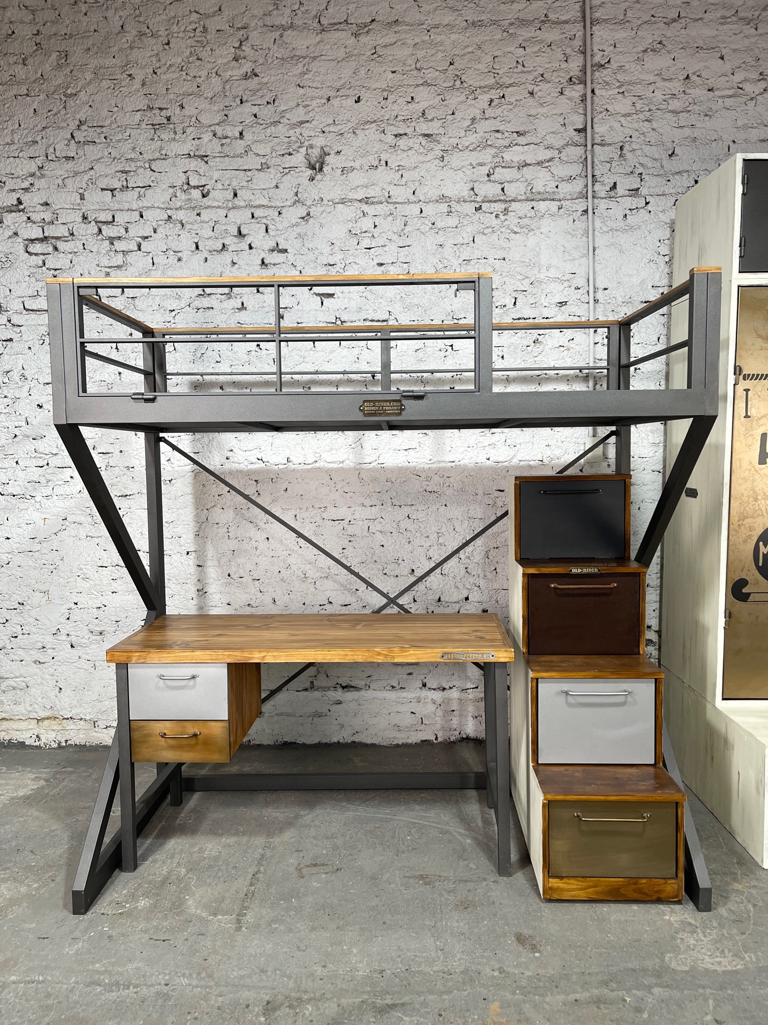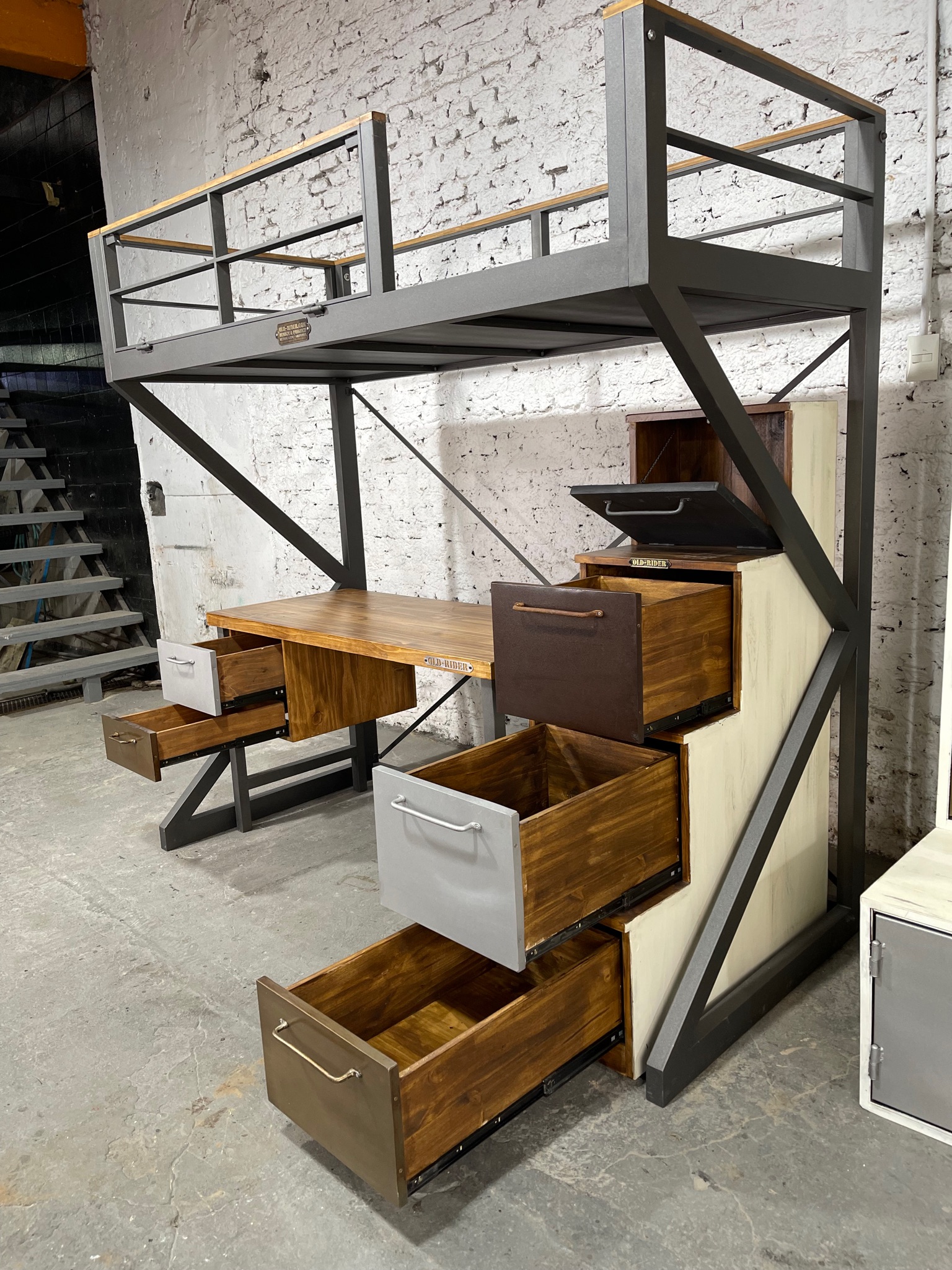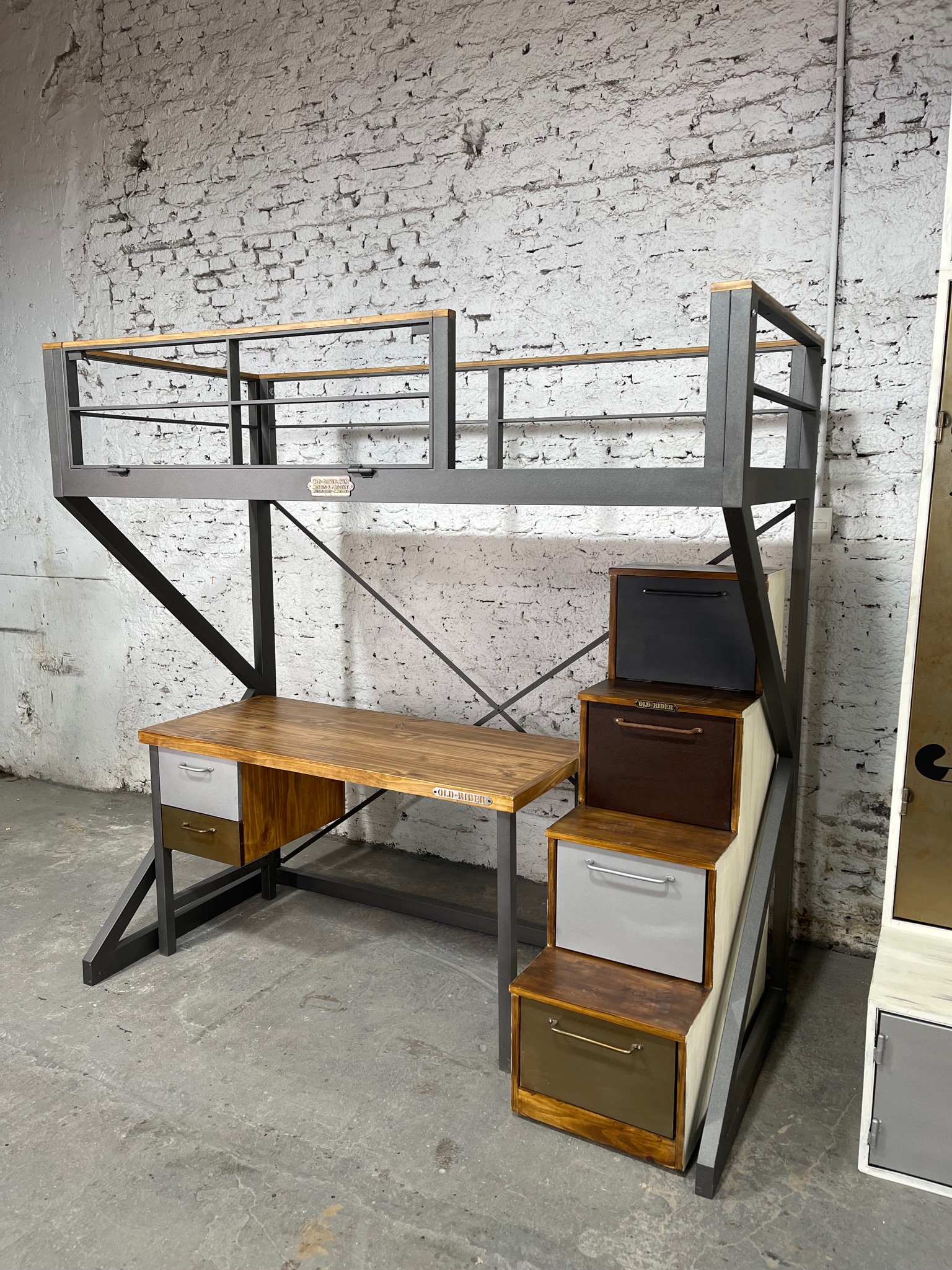 Mueble con cama de plaza y 1/2 en piso superior con espacio para escritorio y escalera de cajones.