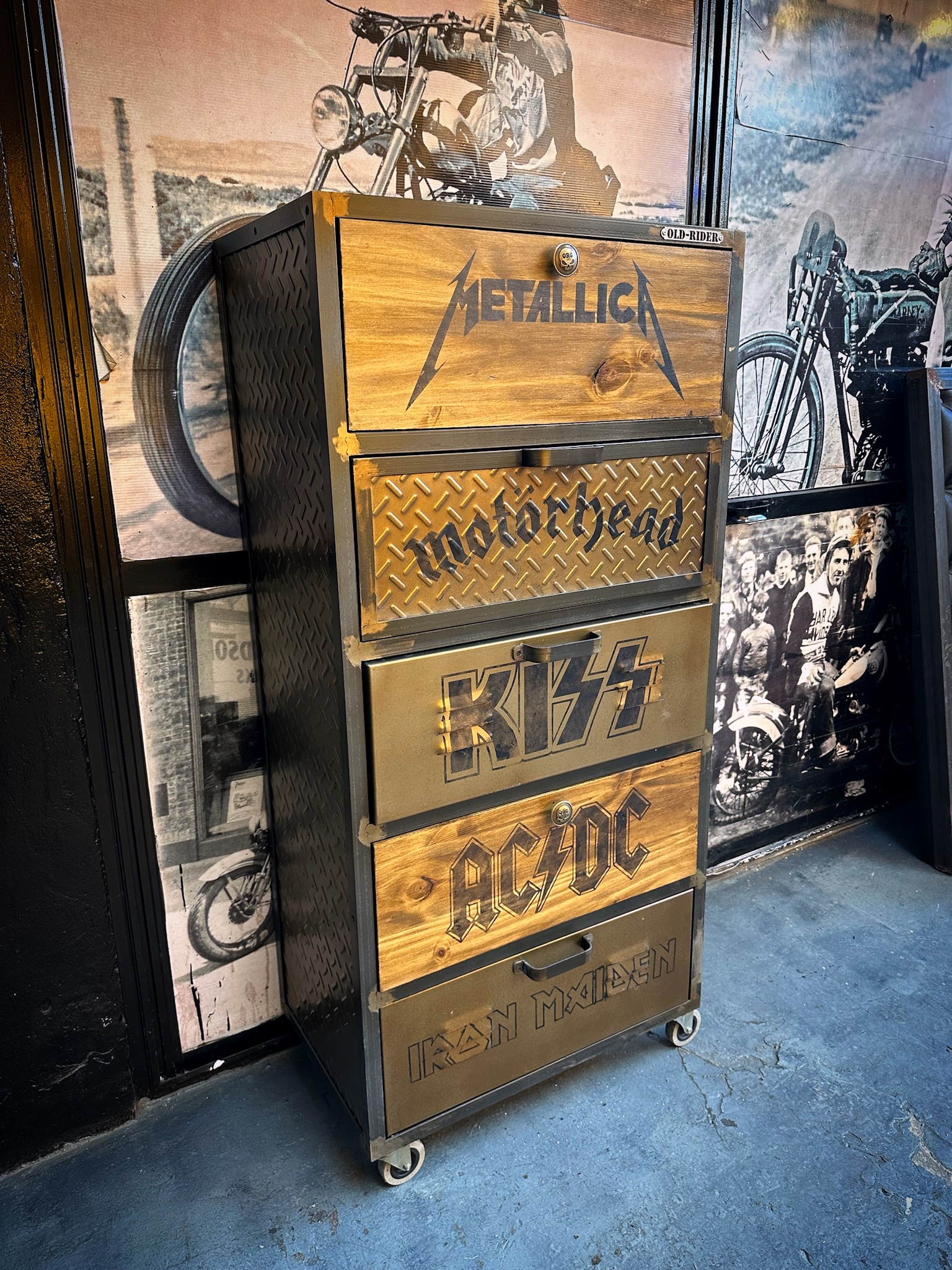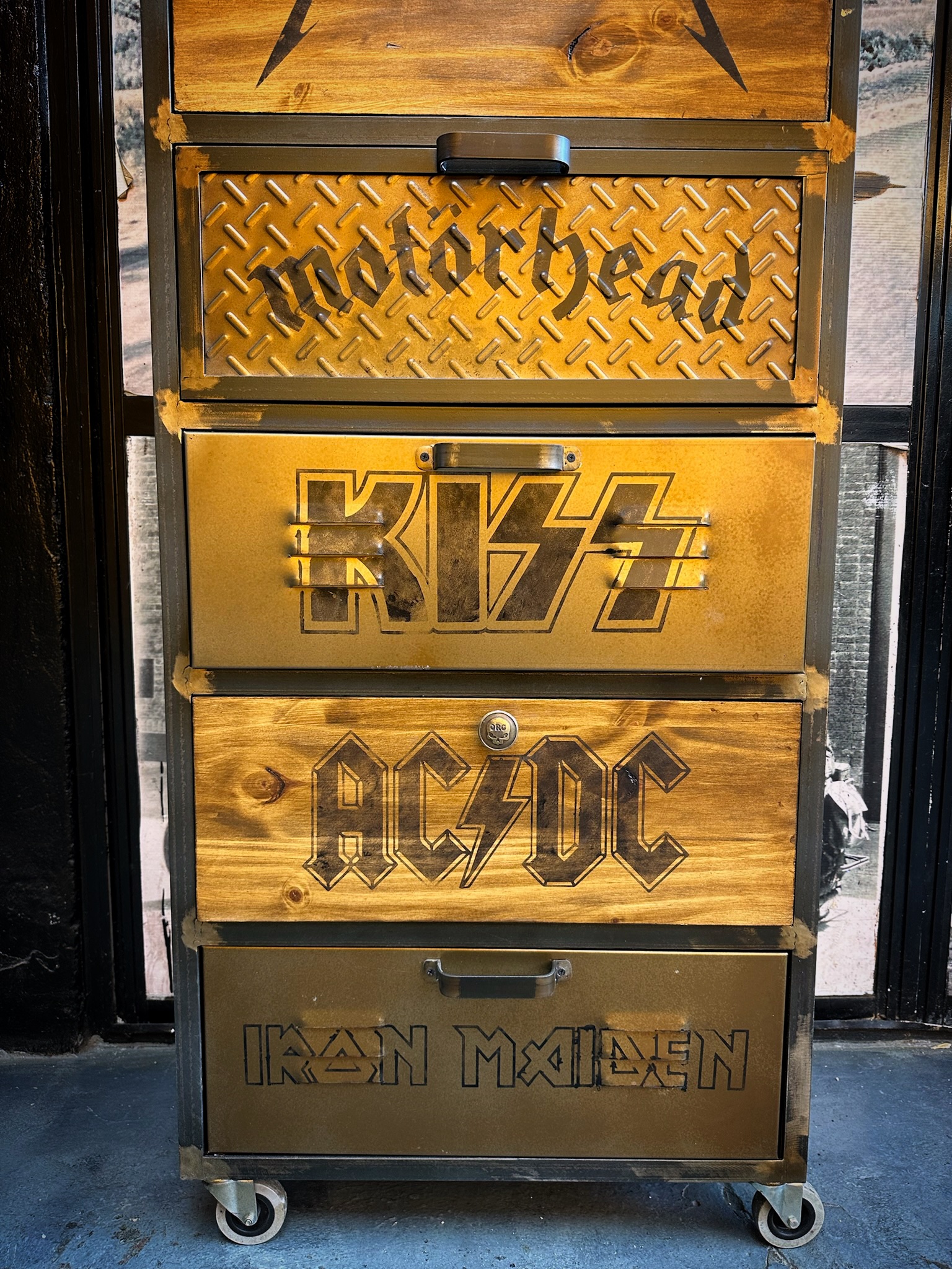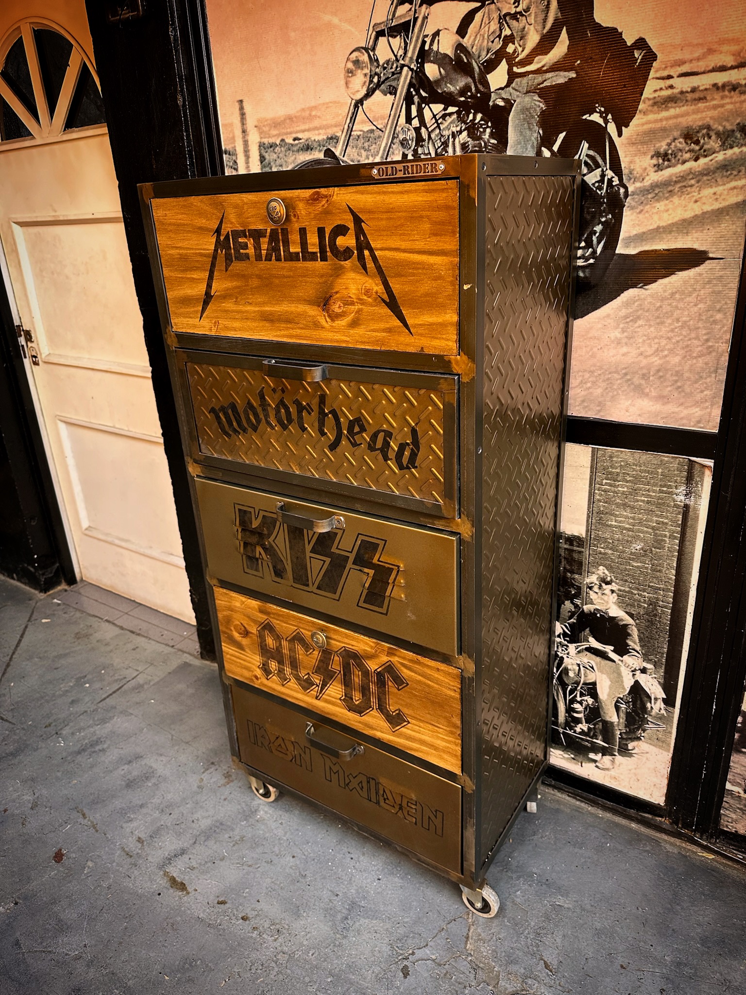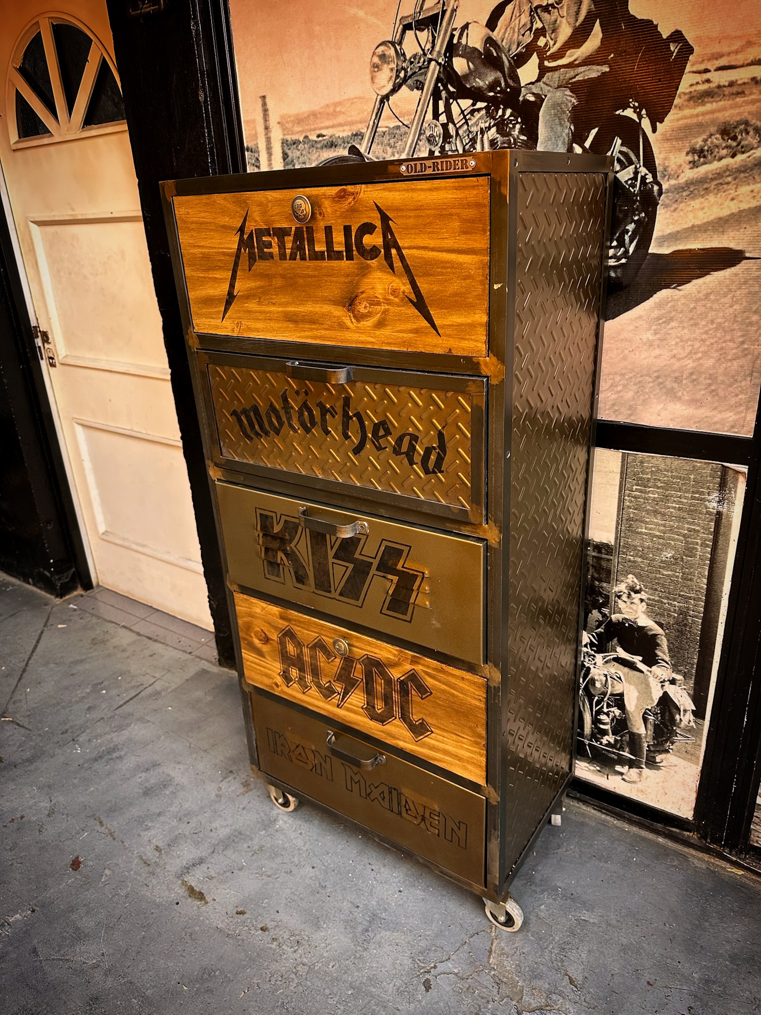 Cajonera de hierro, chapa y madera, logos de bandas pintados, logos y medida a elección