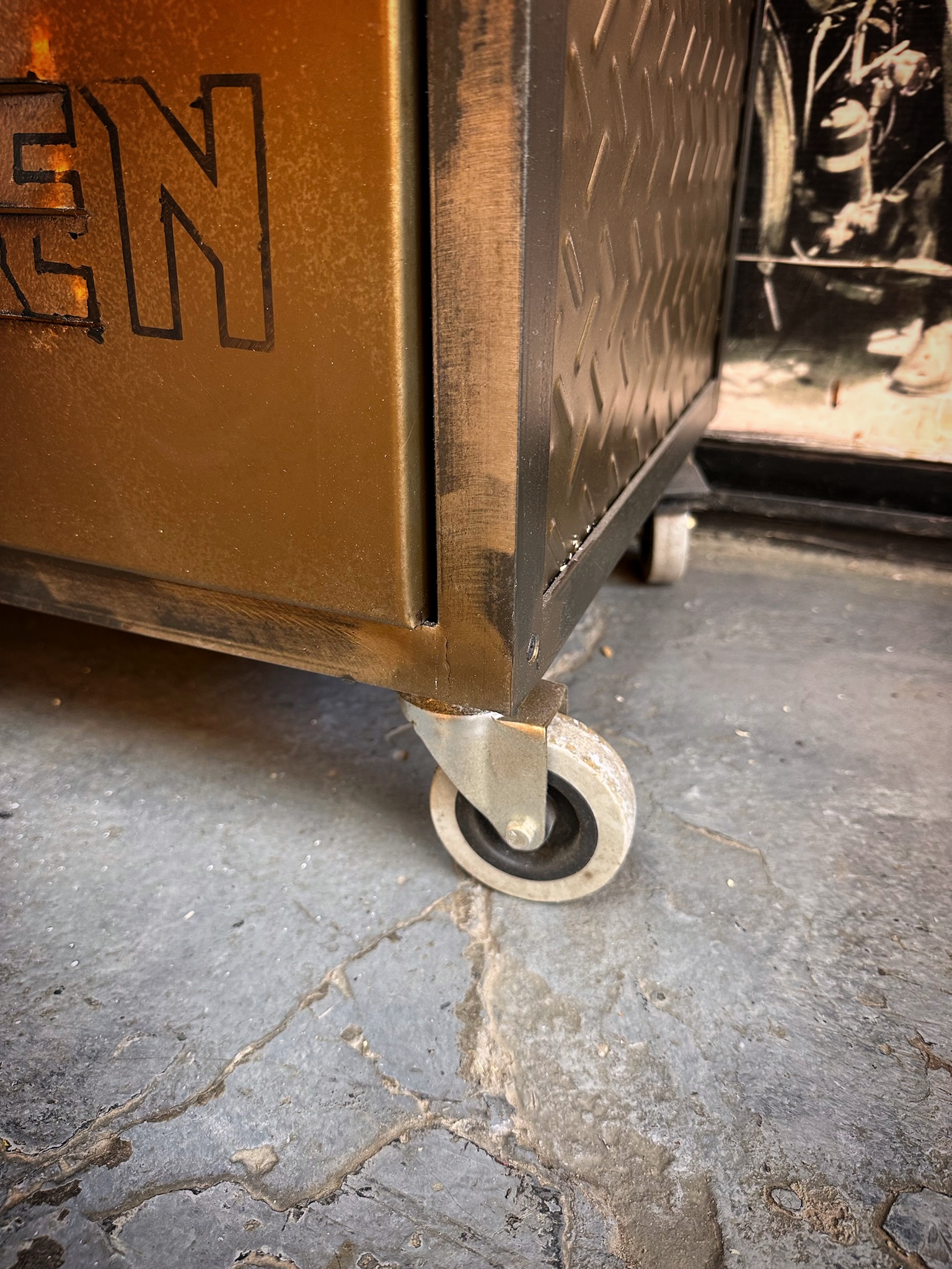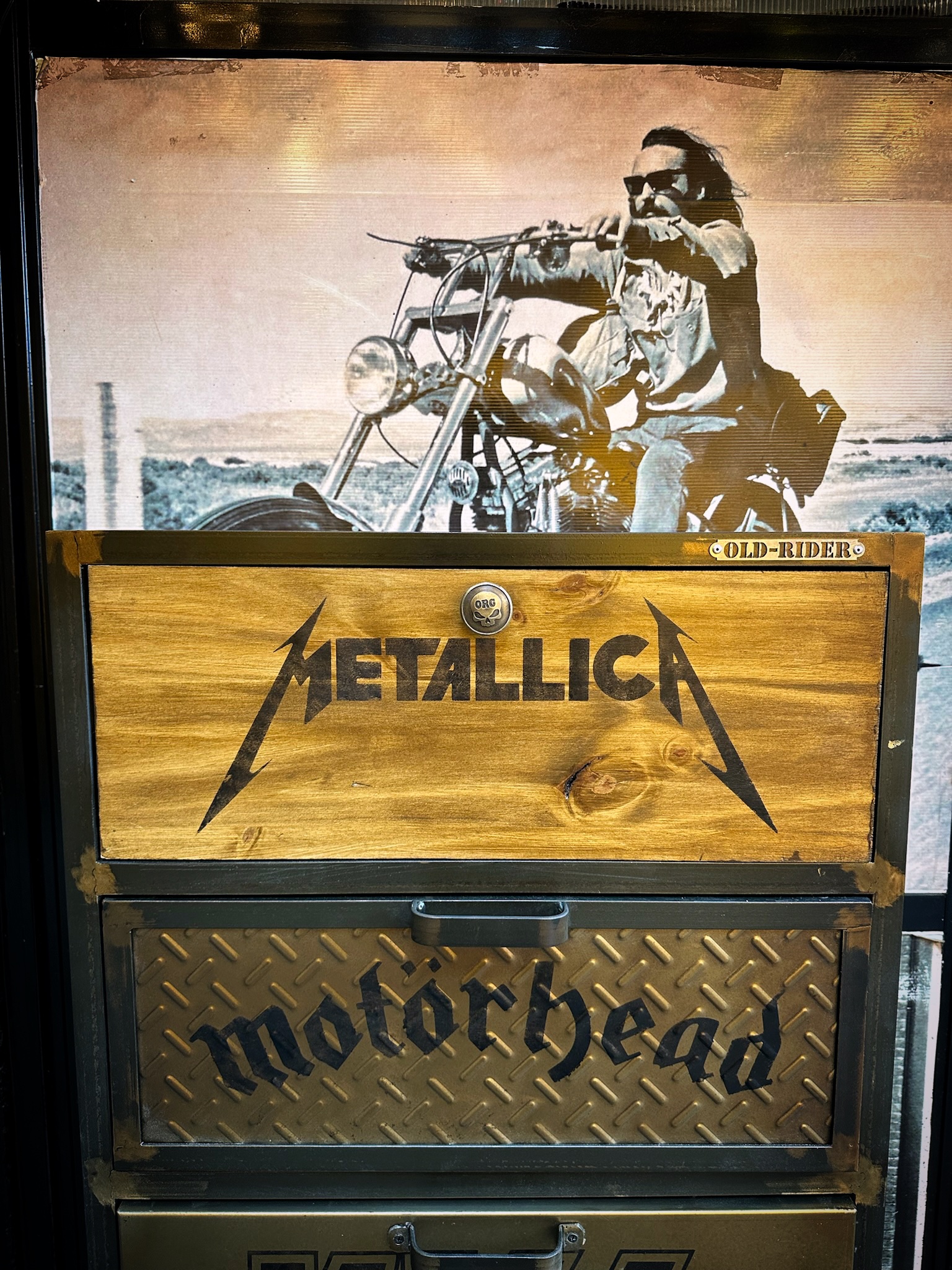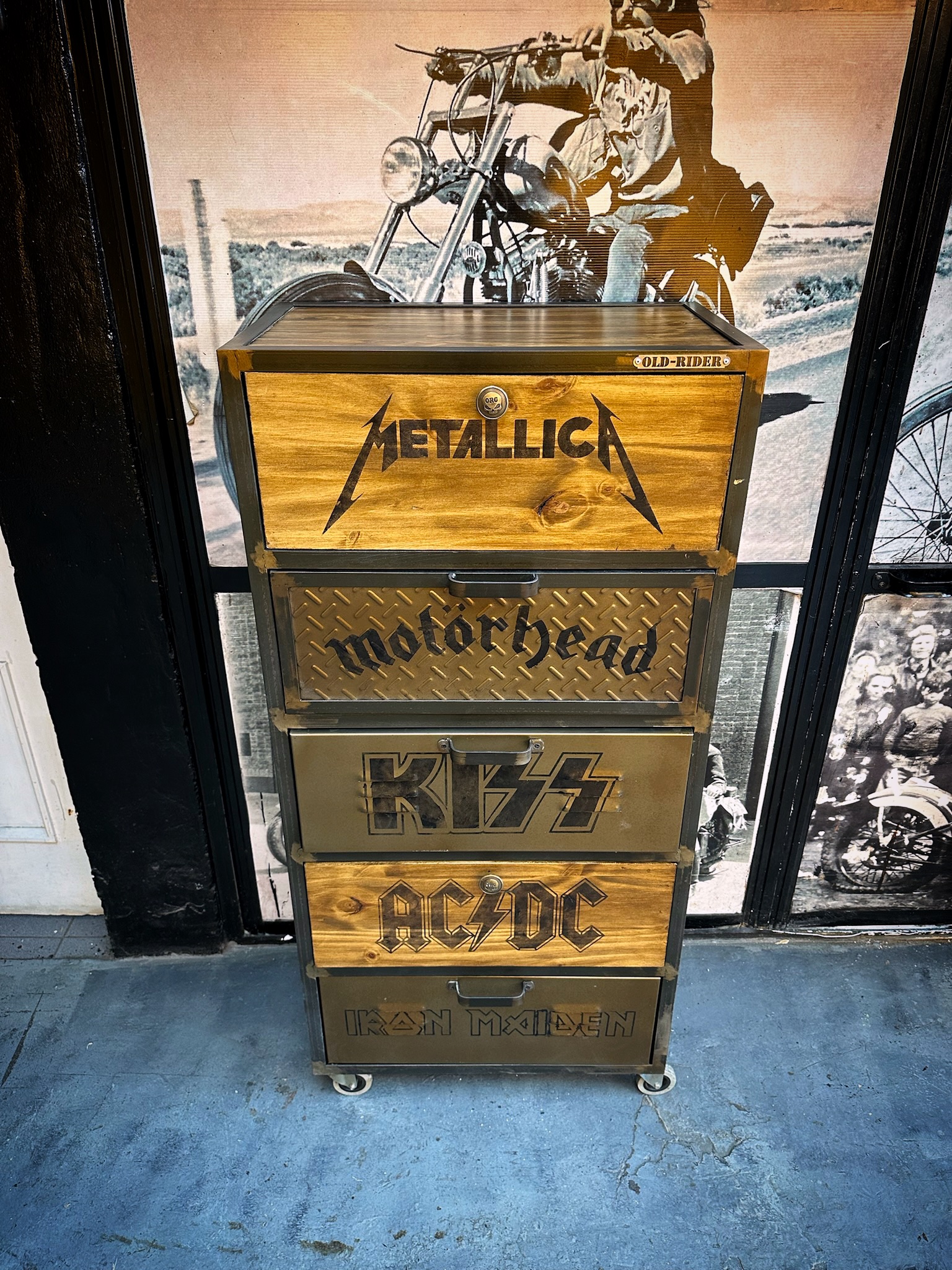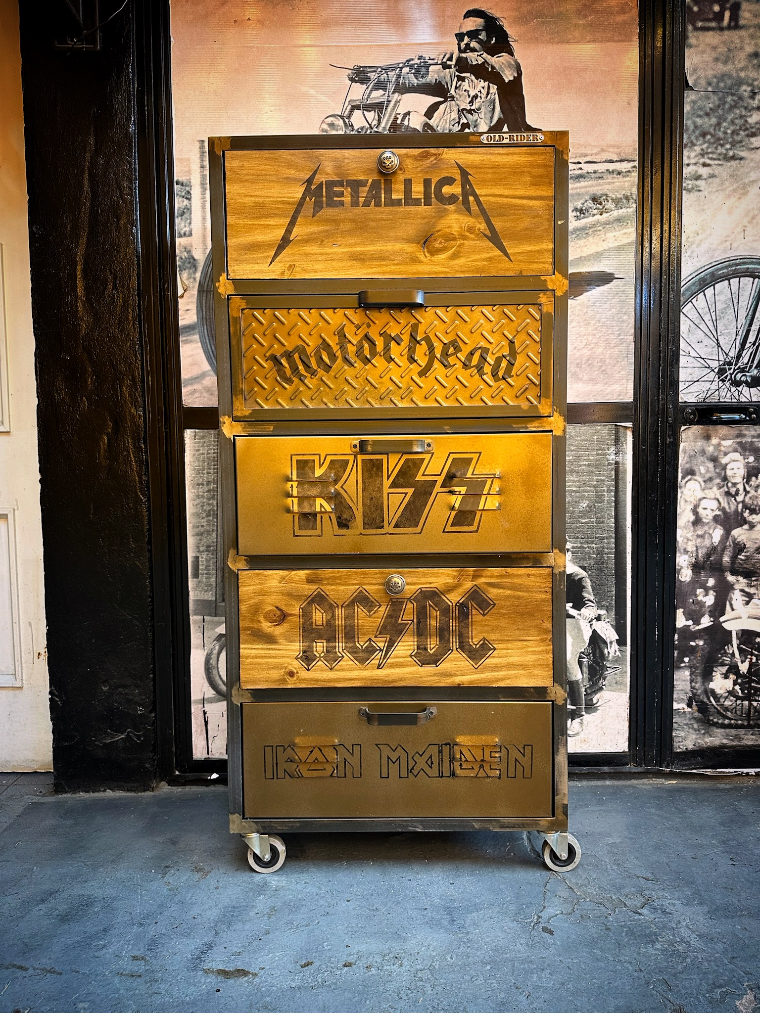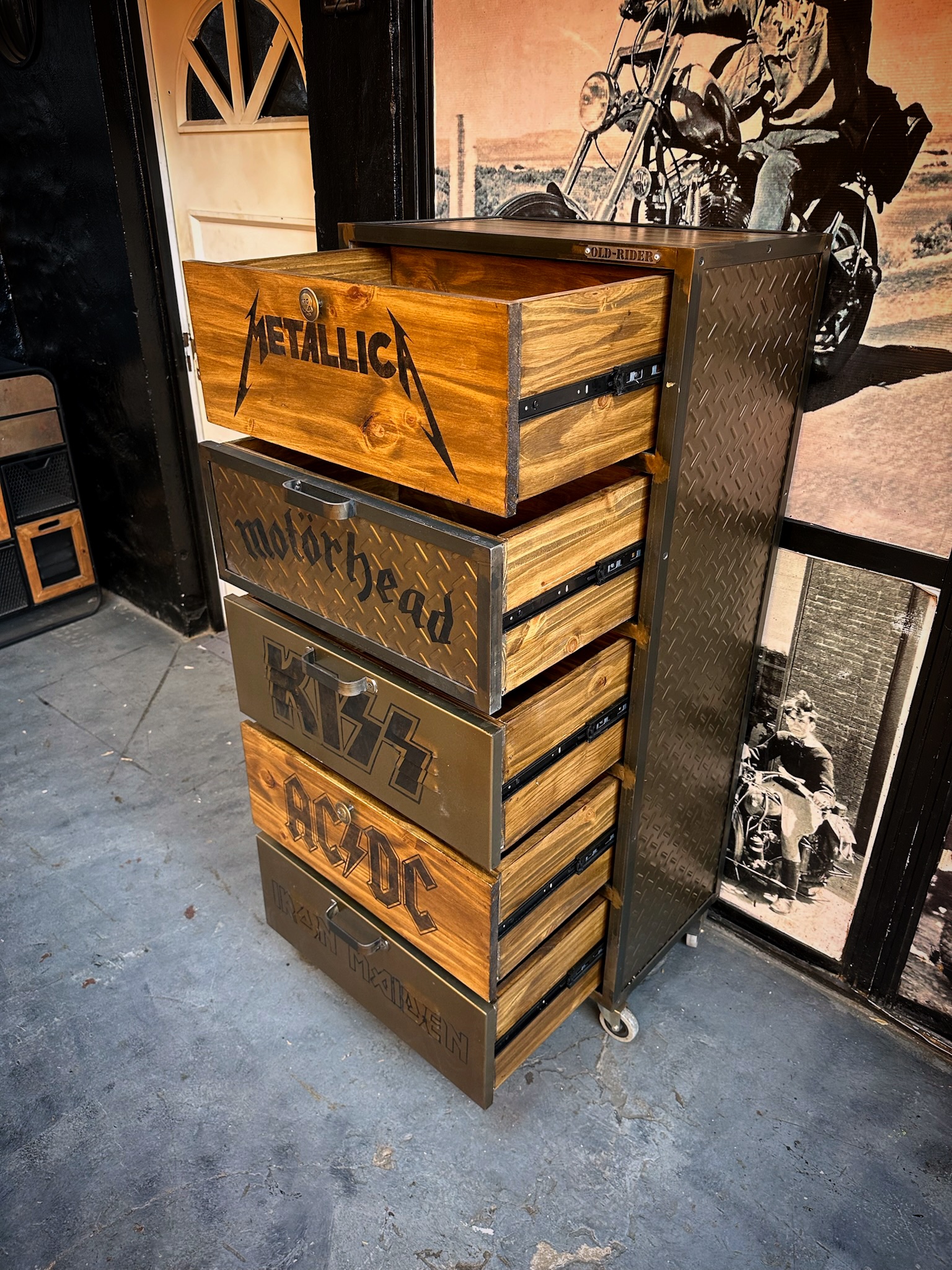 Cajonera de hierro, chapa y madera, logos de bandas pintados, logos y medida a elección
