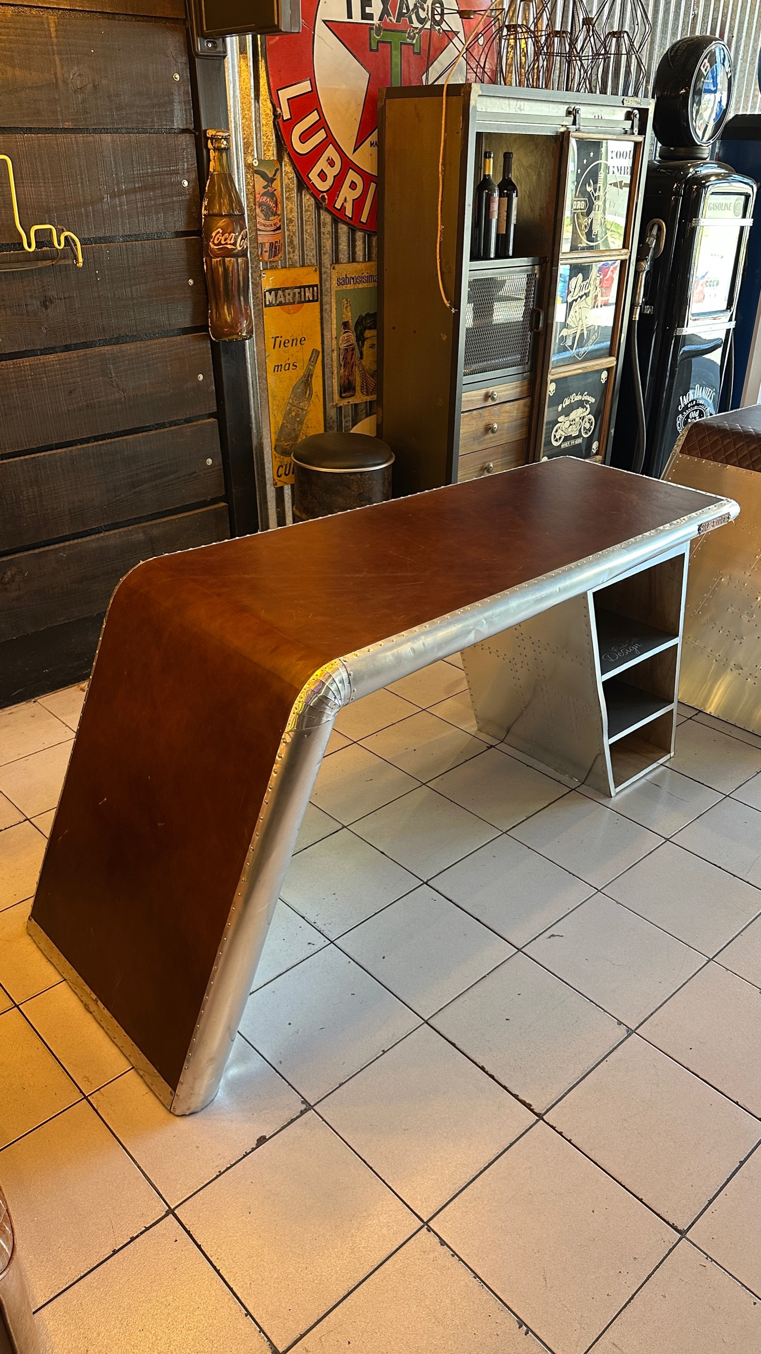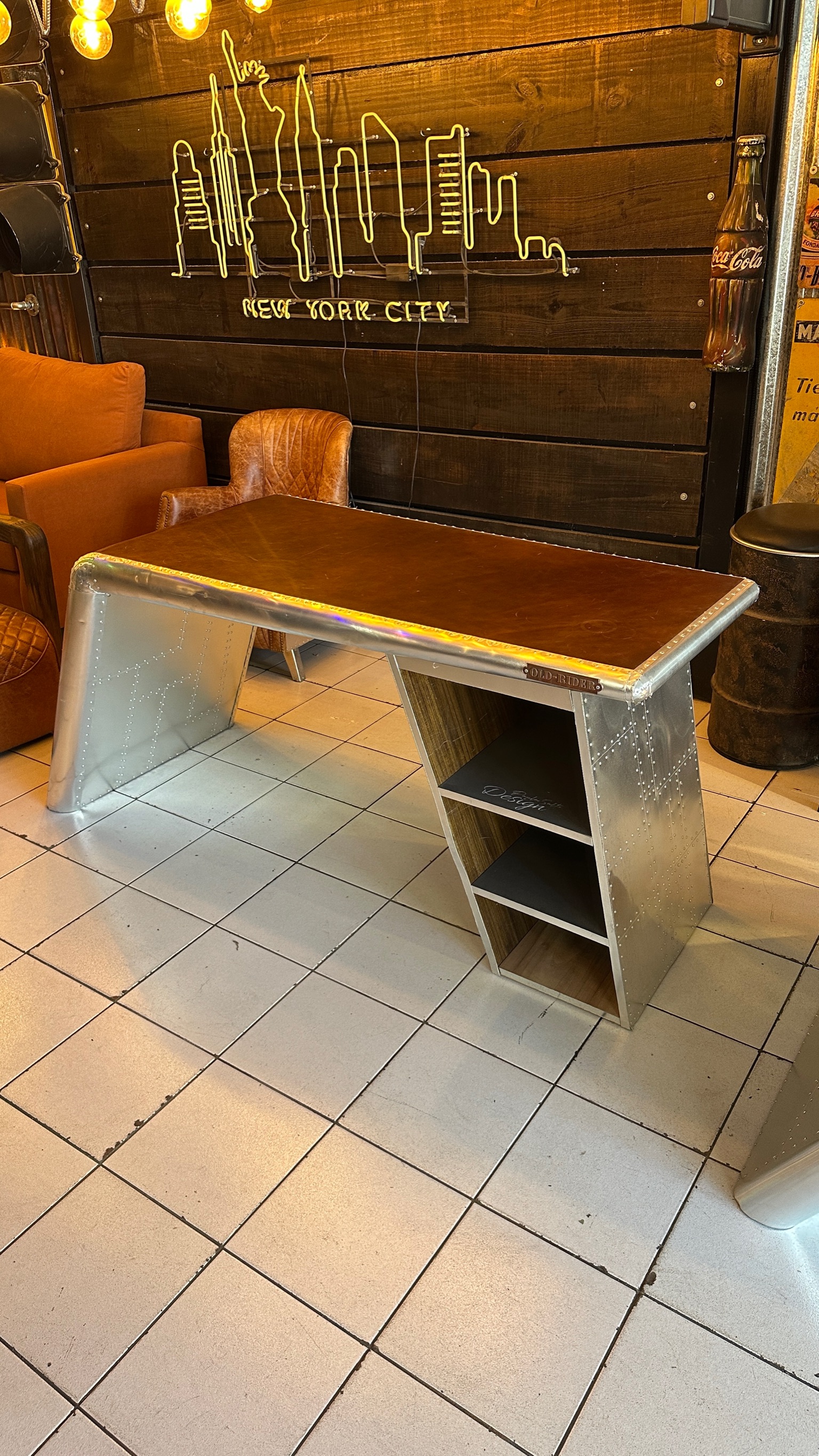 escritorio lineal aviator, hecho de aluminio y cuero, cuenta con cajones.