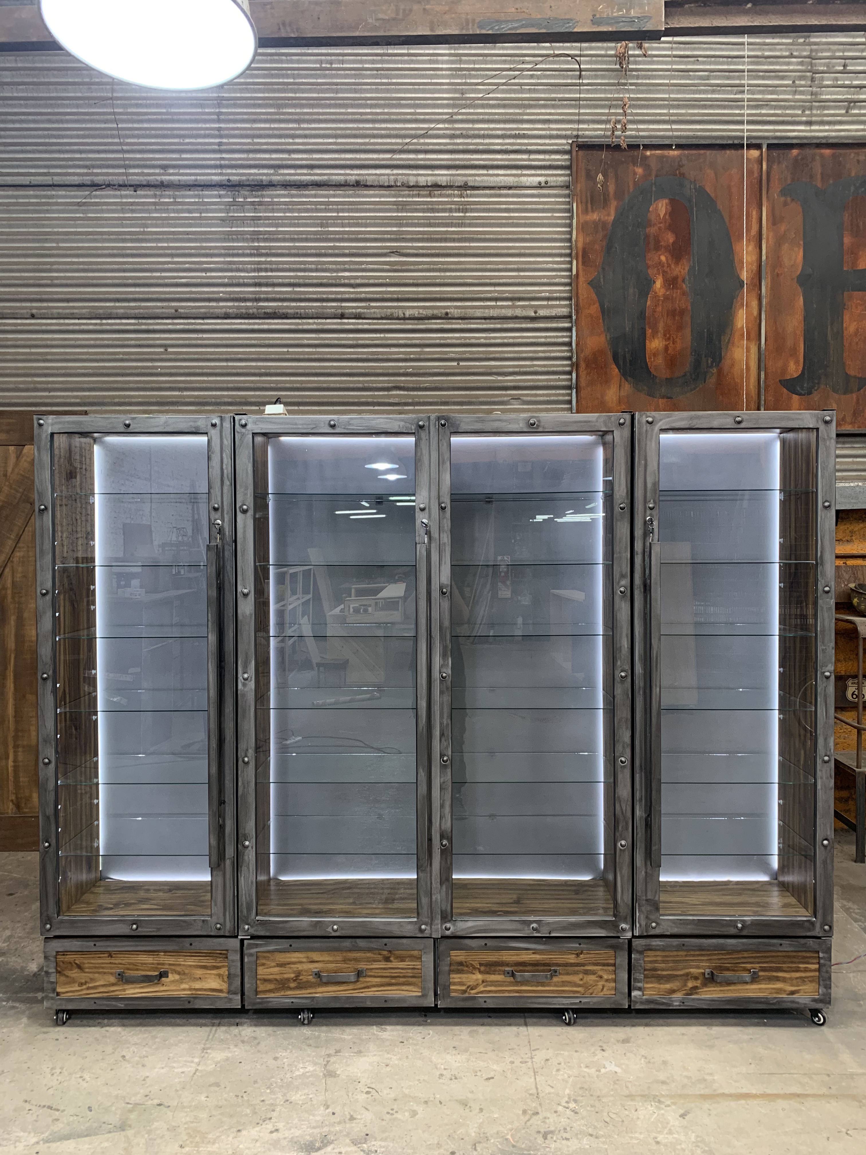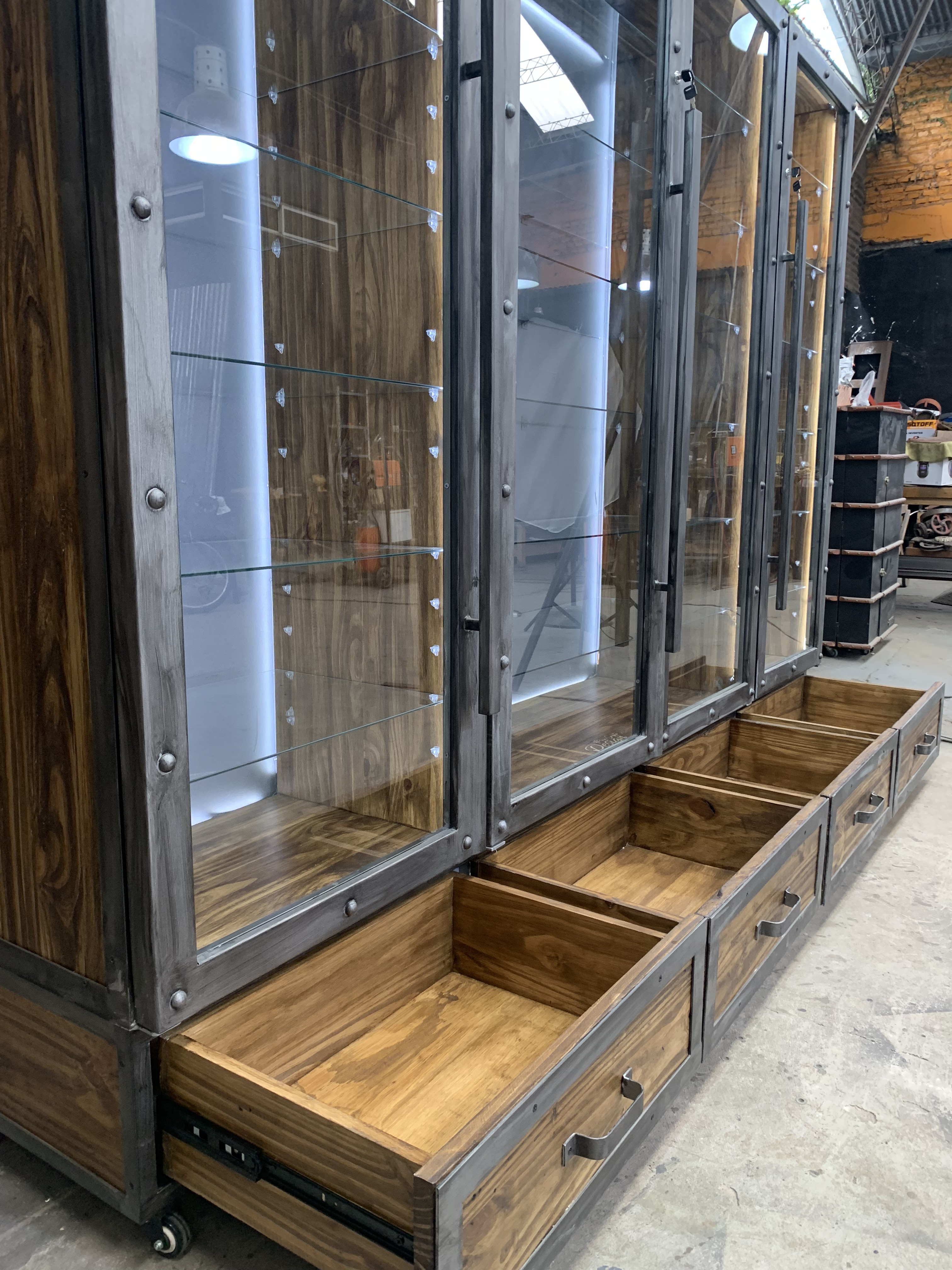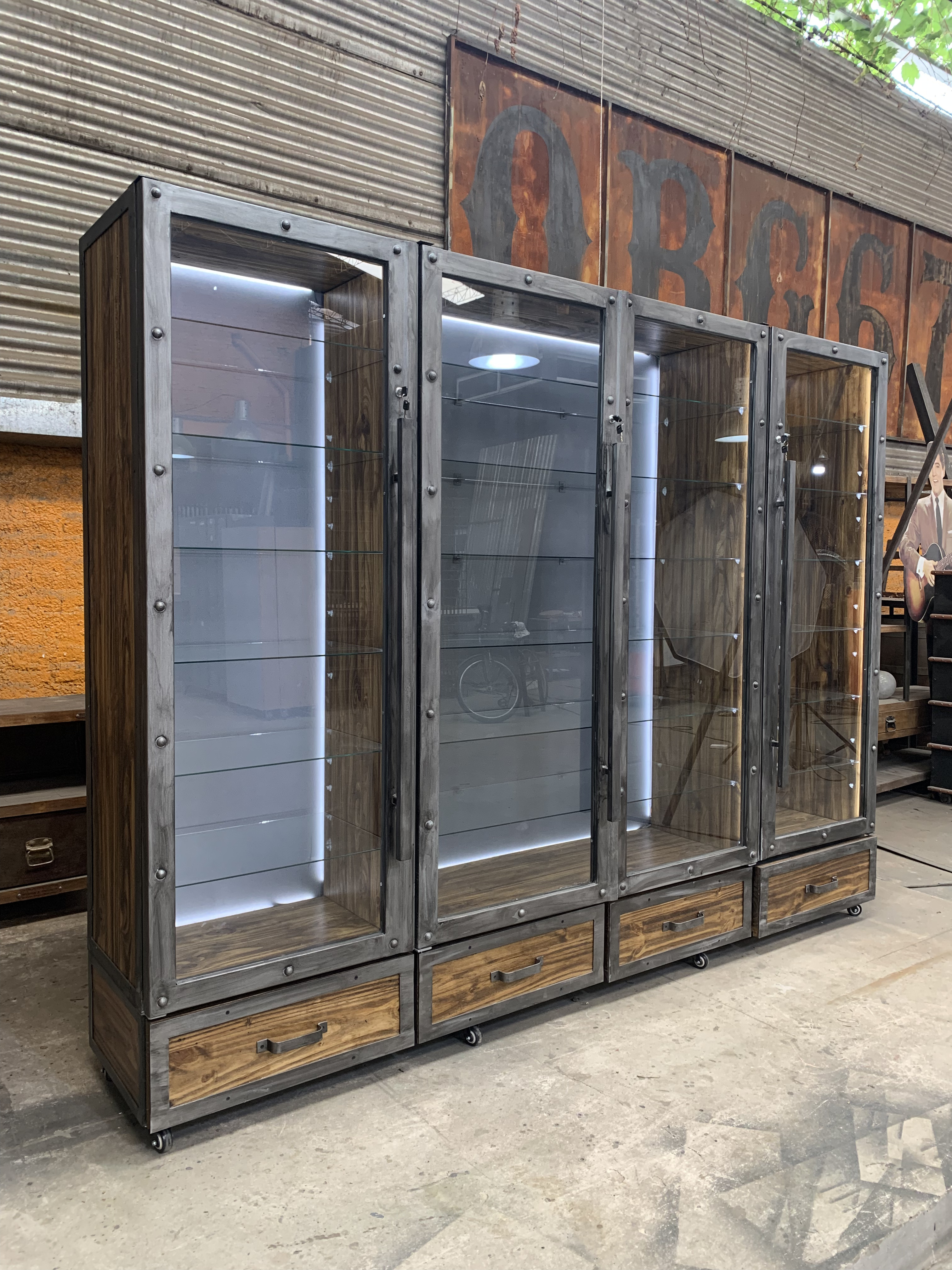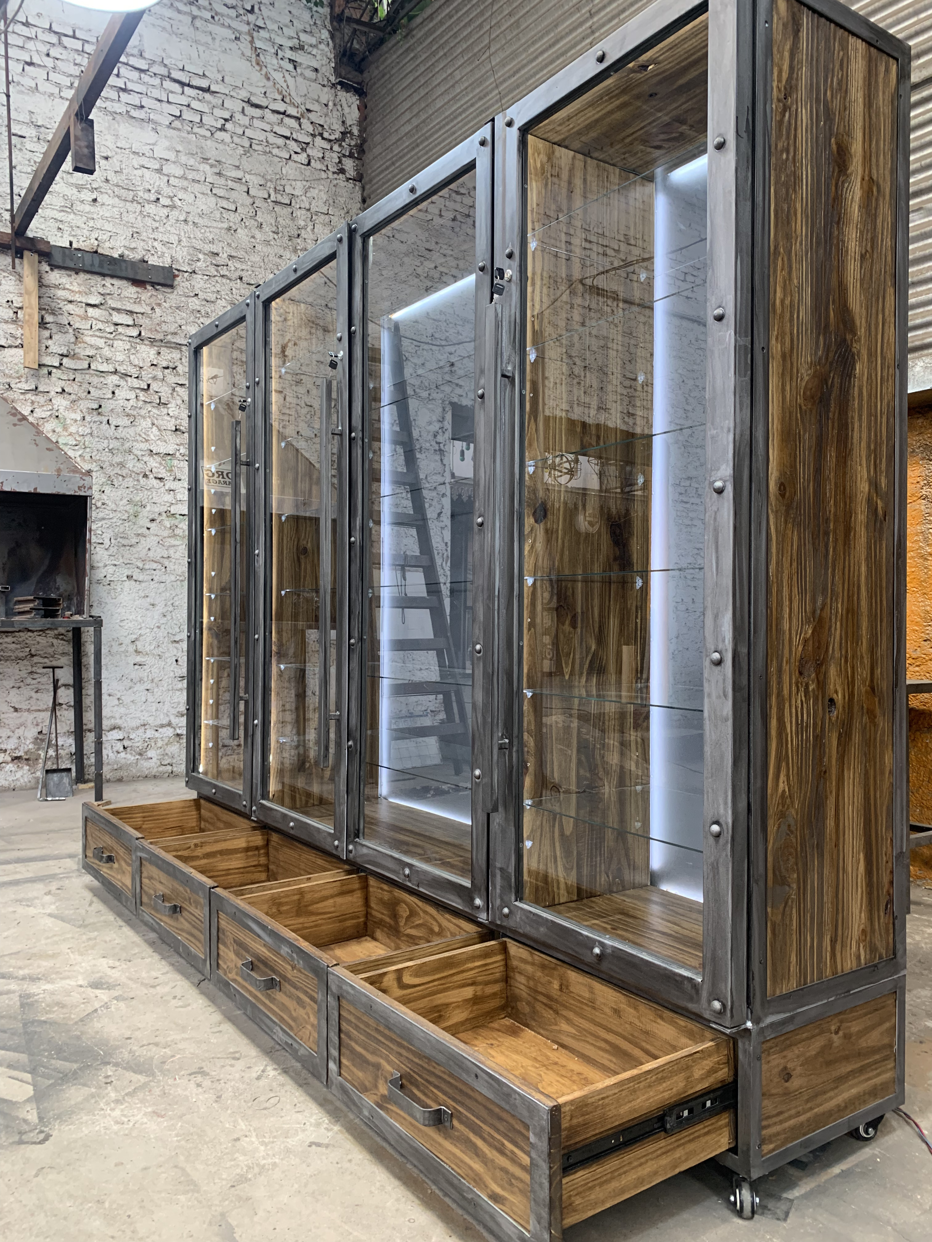 Vitrina cuerpo de acero con interior de chapa y madera, cuenta con luces led retroiluminado.