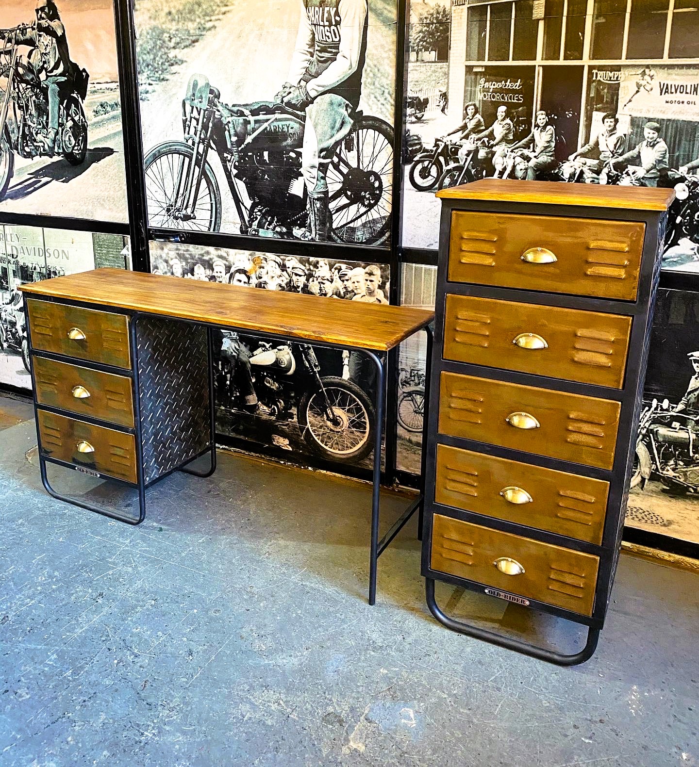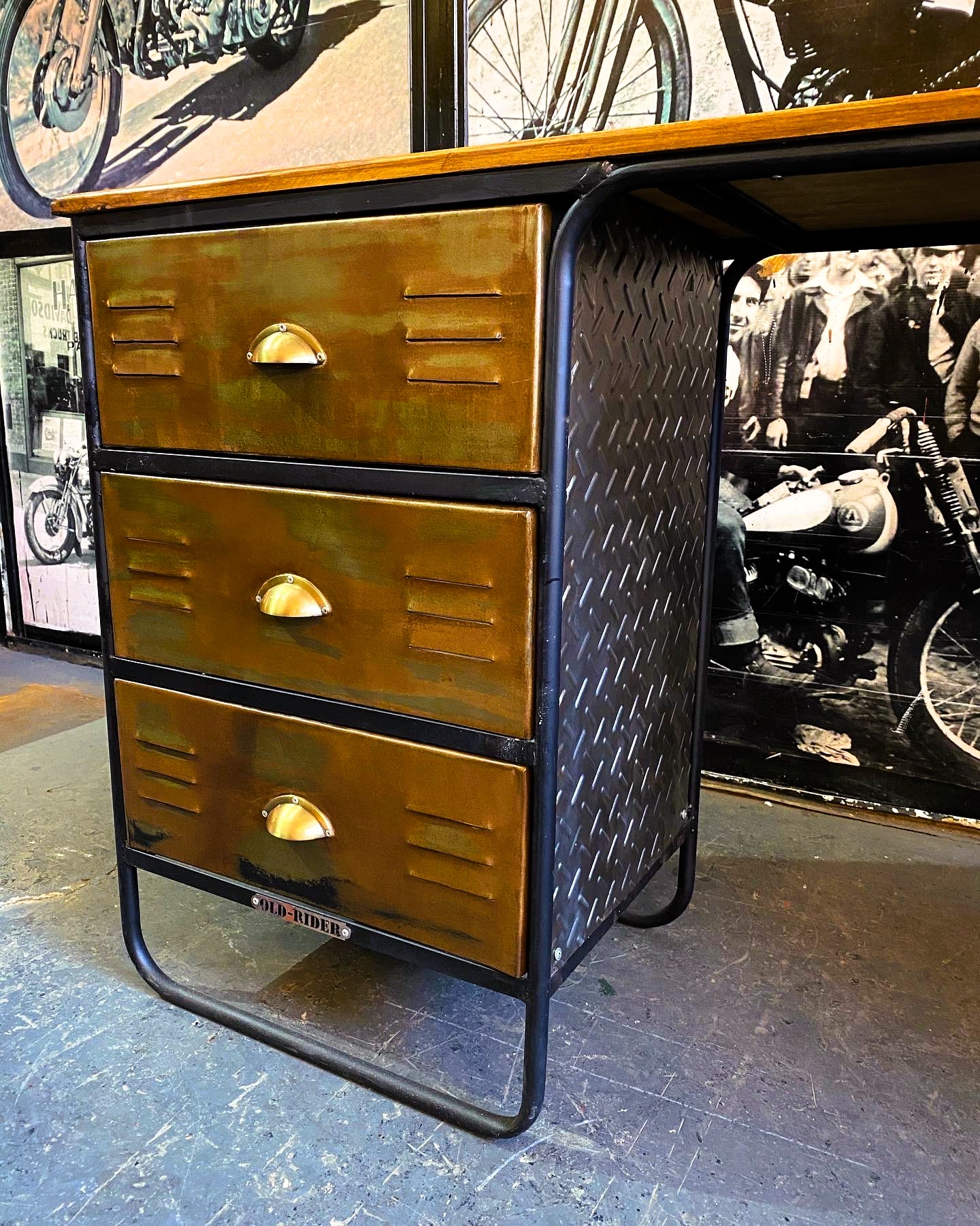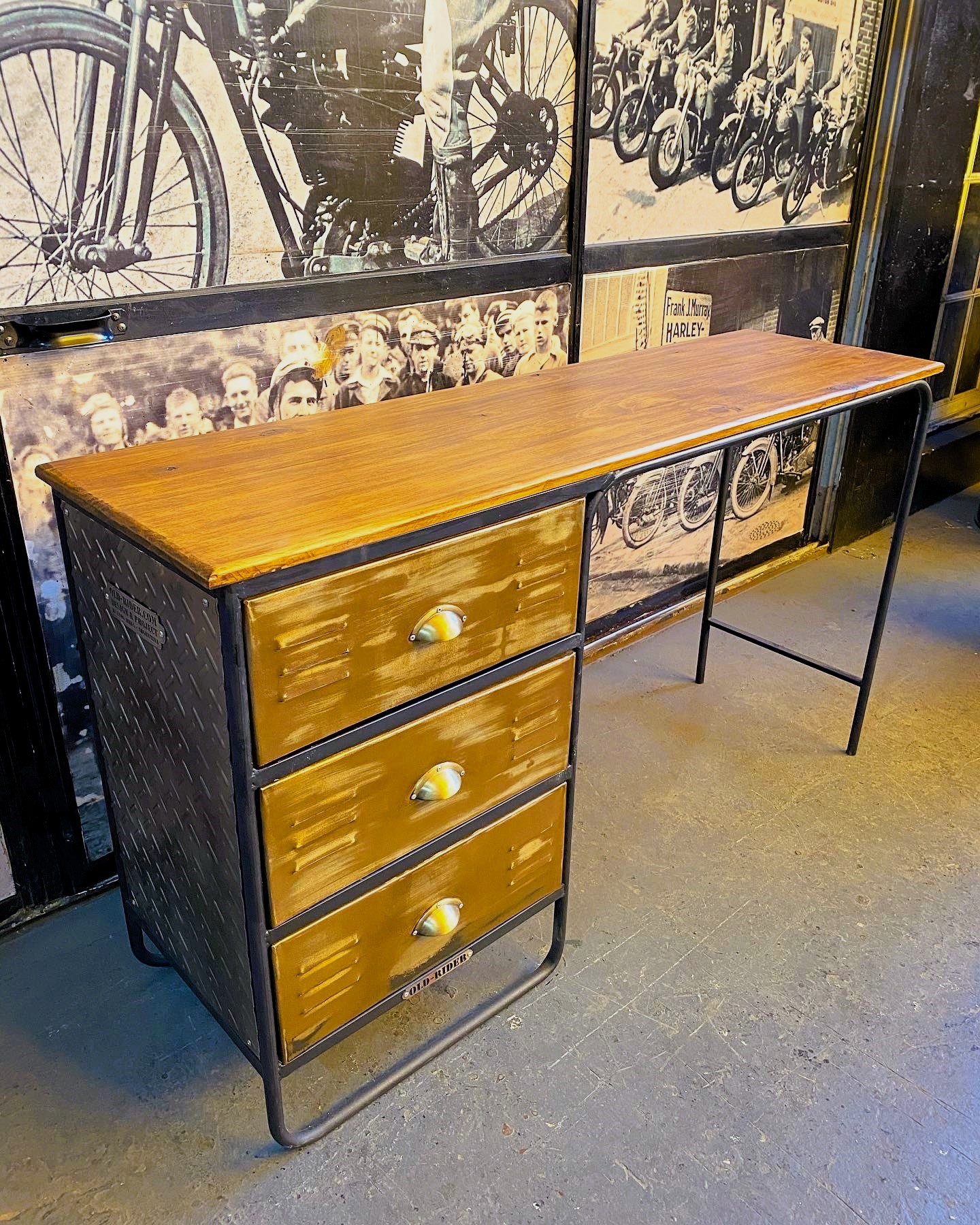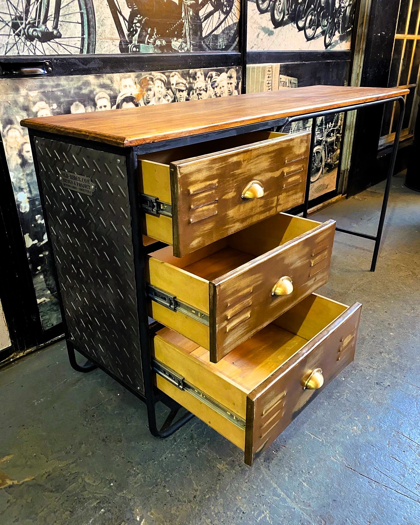 Escritorio de estudio locker con cajones de madera, bordes y patas de hierro.