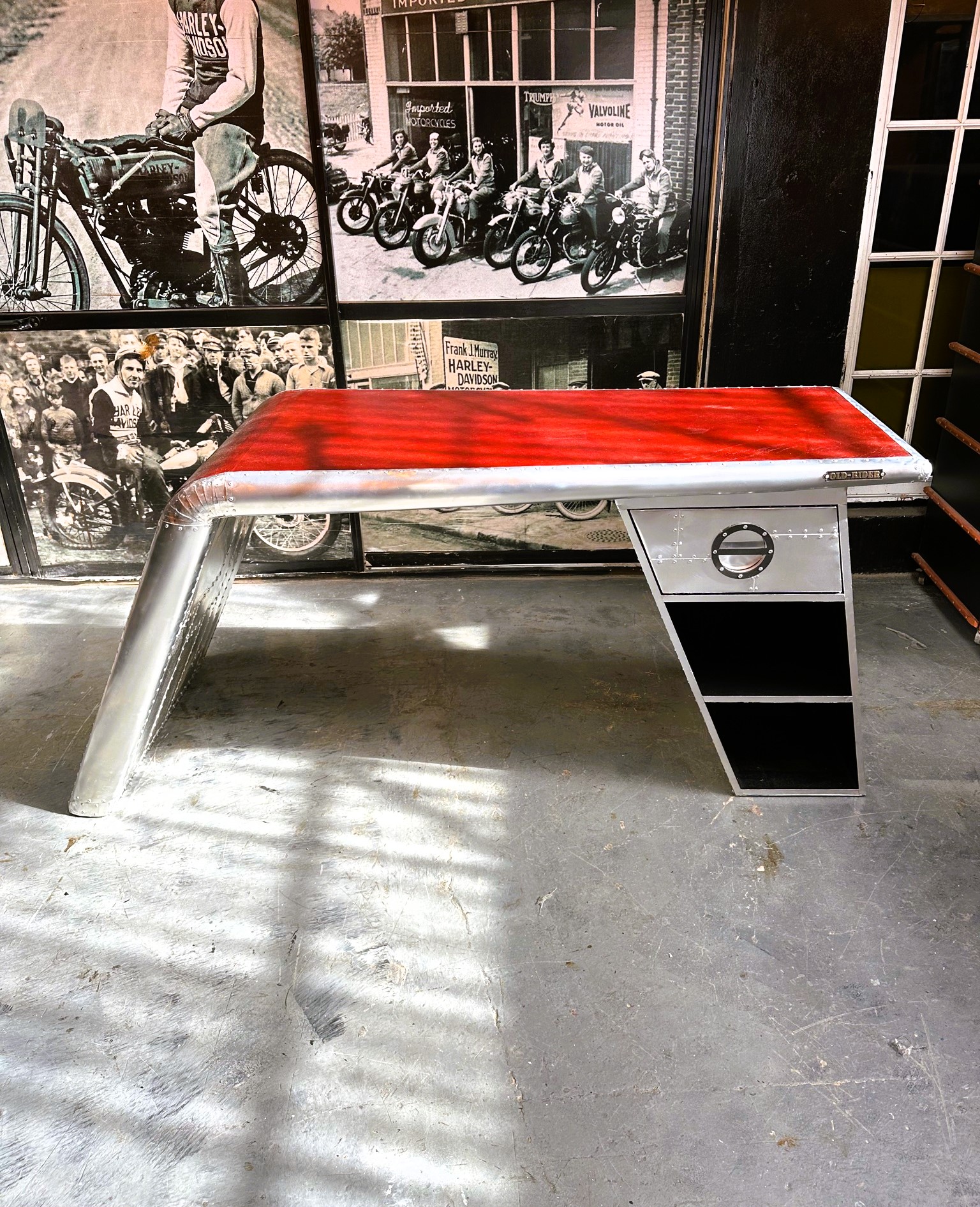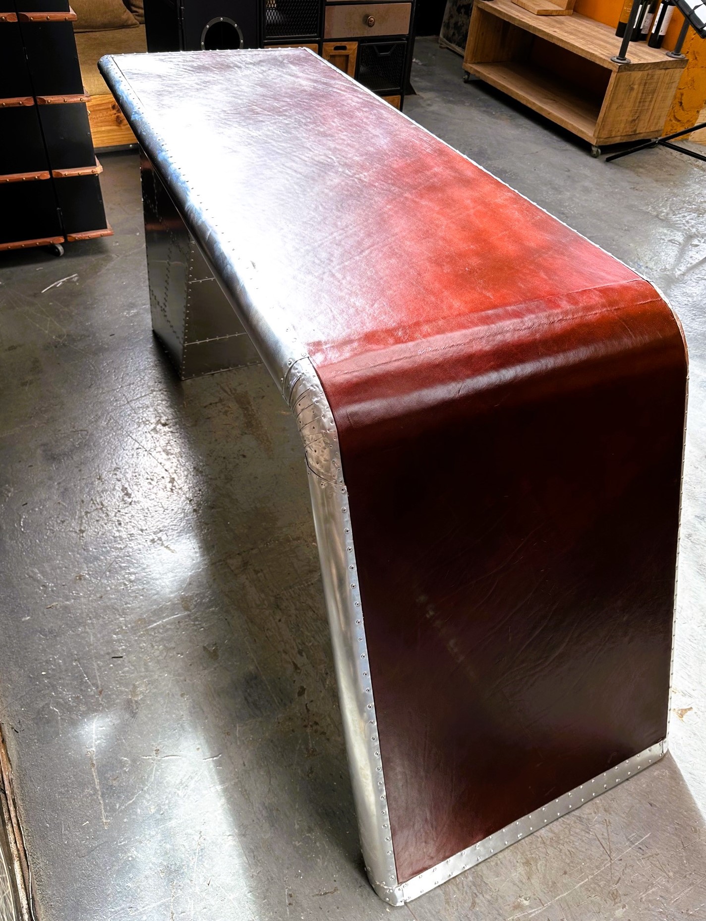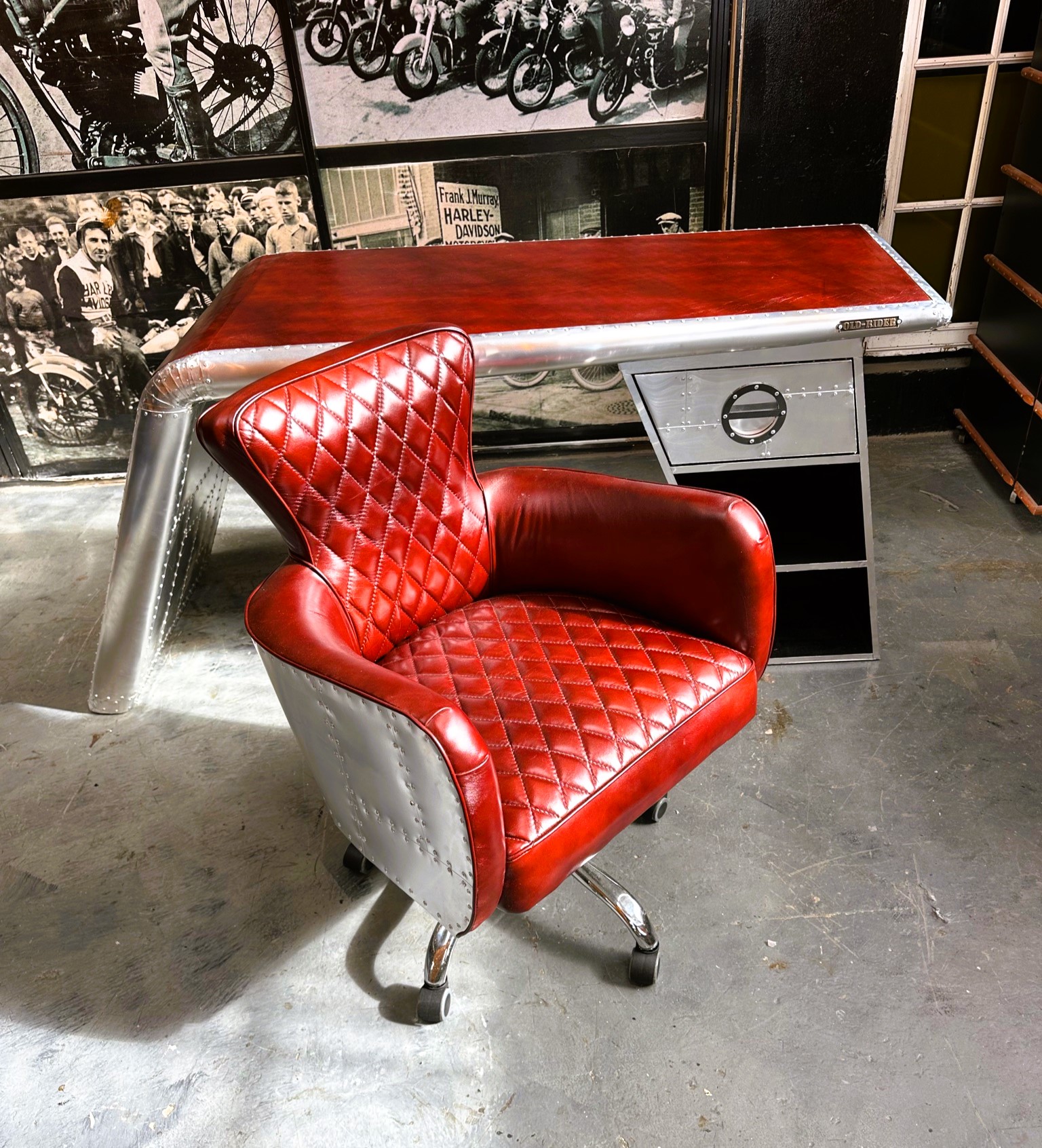 Conjunto escritorio sillón estilo aviator con cuero rojizo y exteriores de aluminio remachado.