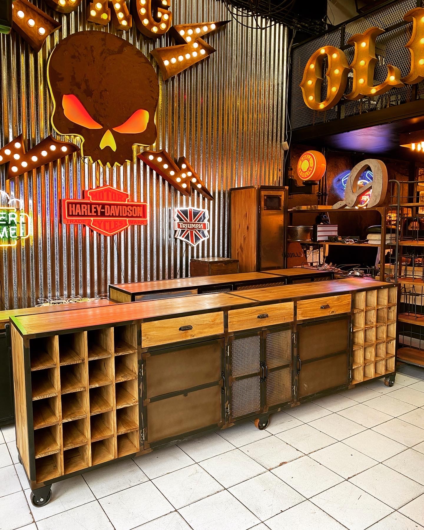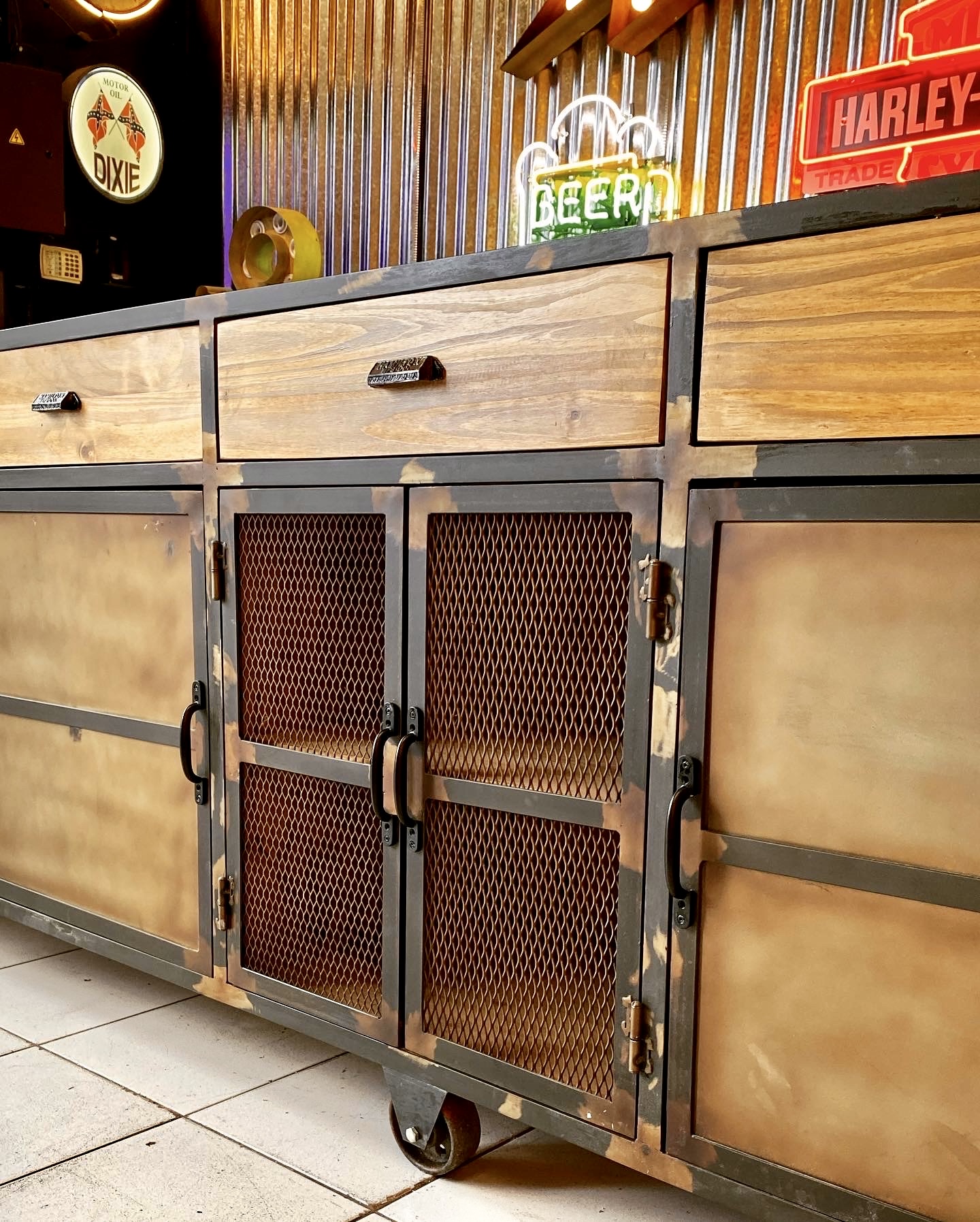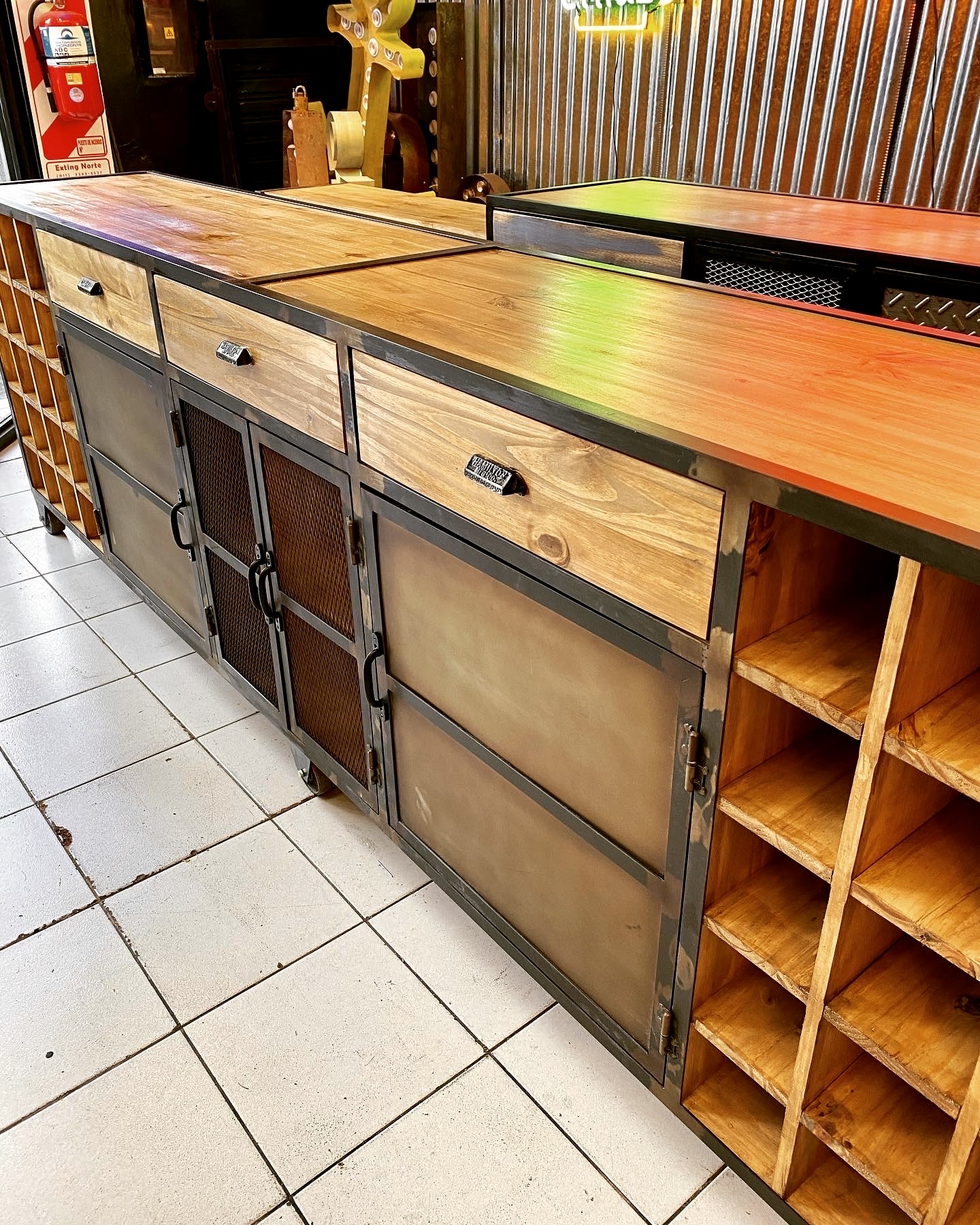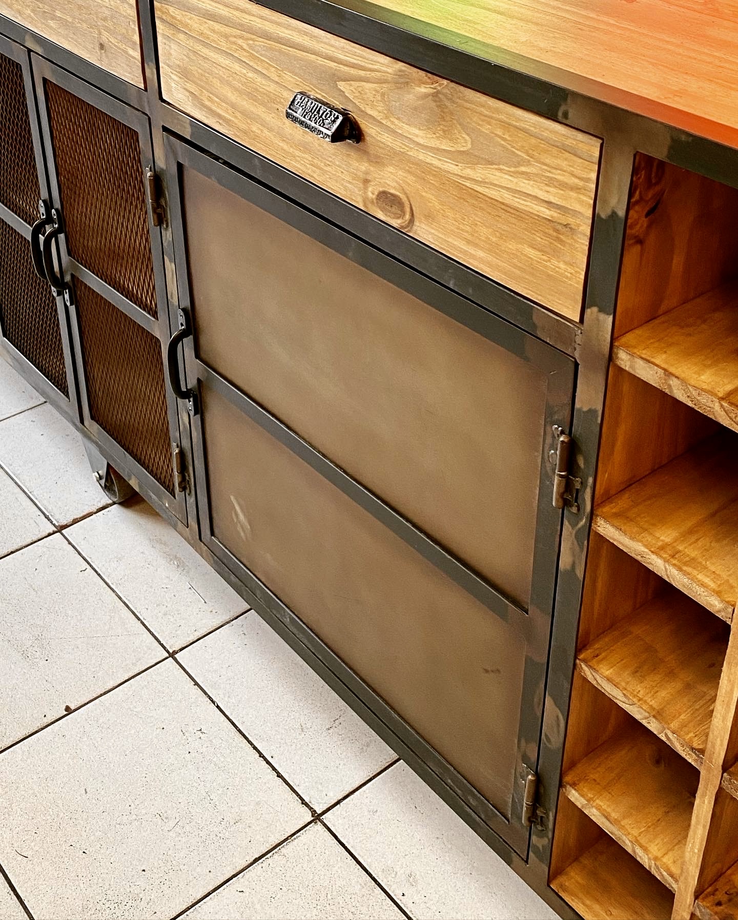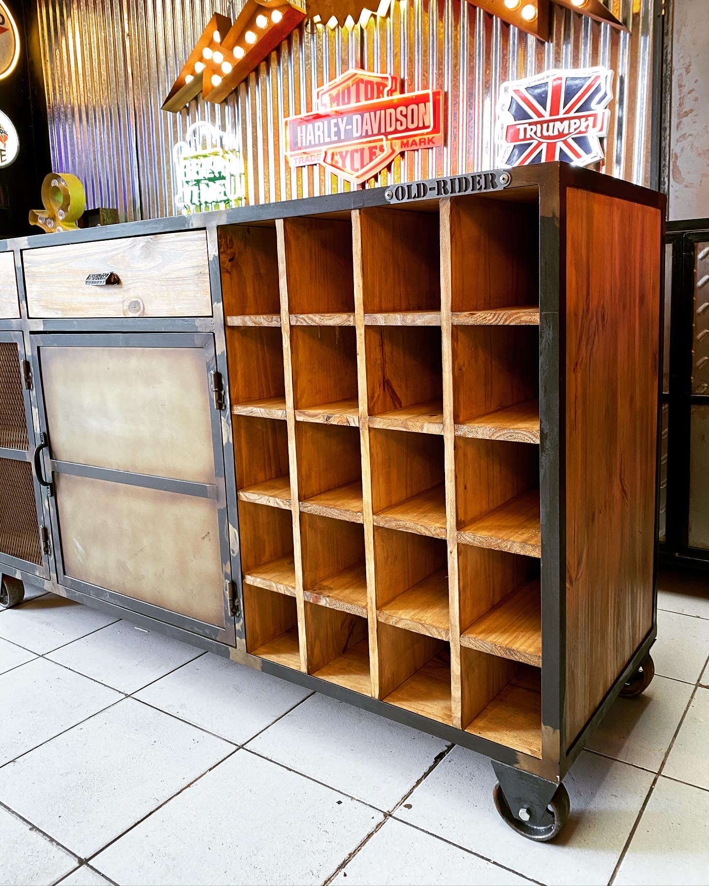 Estantería de madera y bordes y puertas enrejadas de hierro con cava en los laterales.