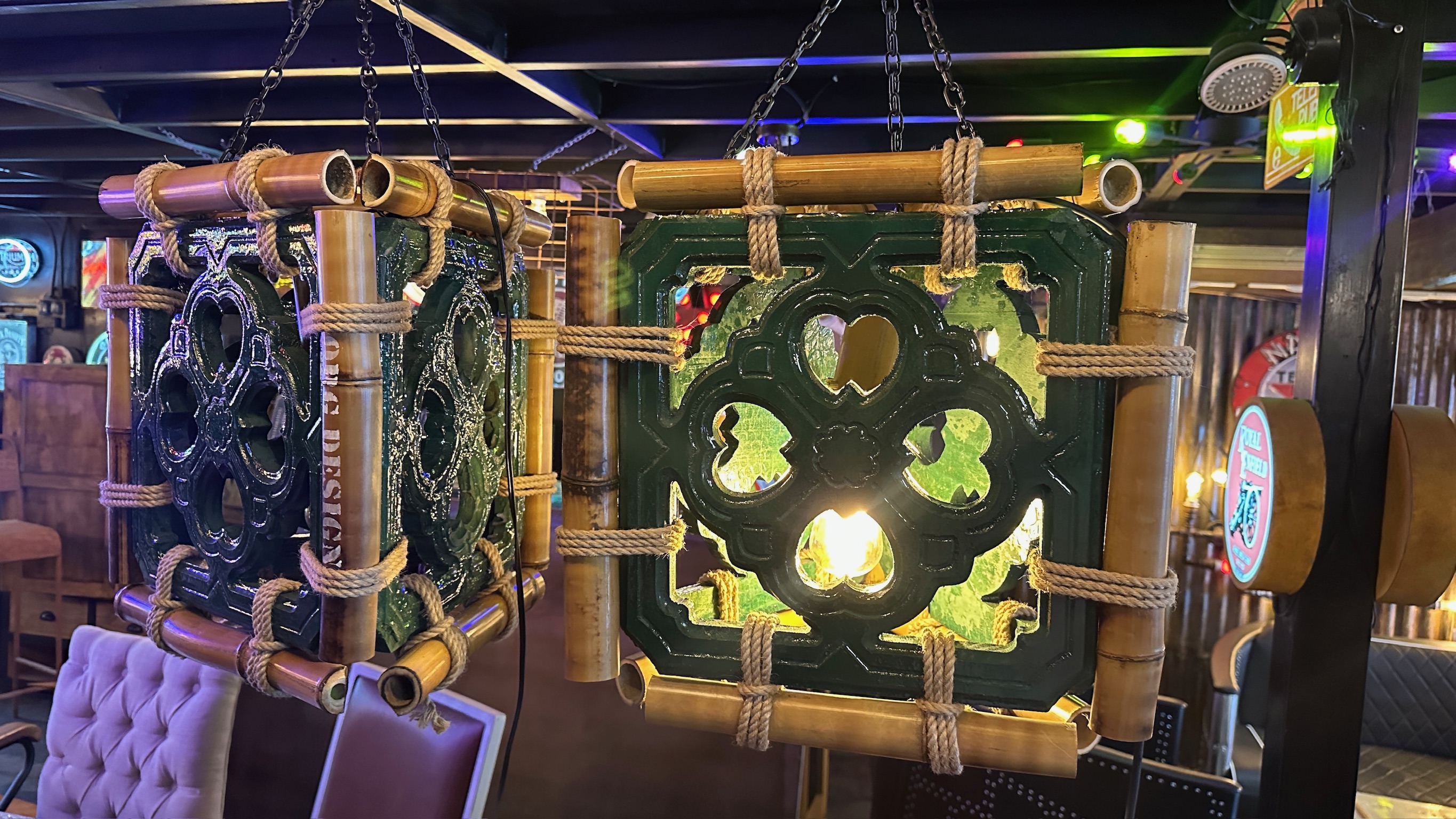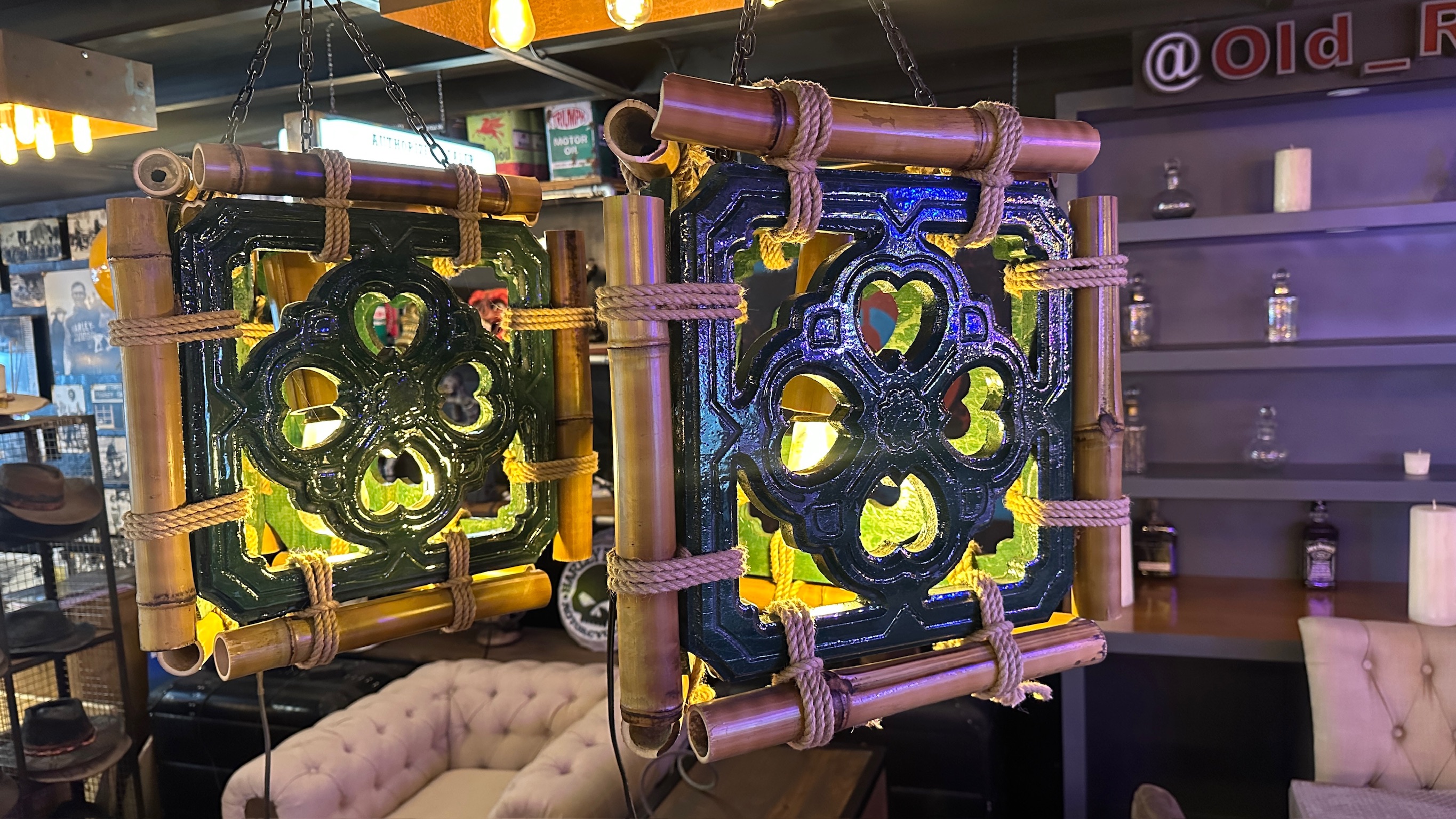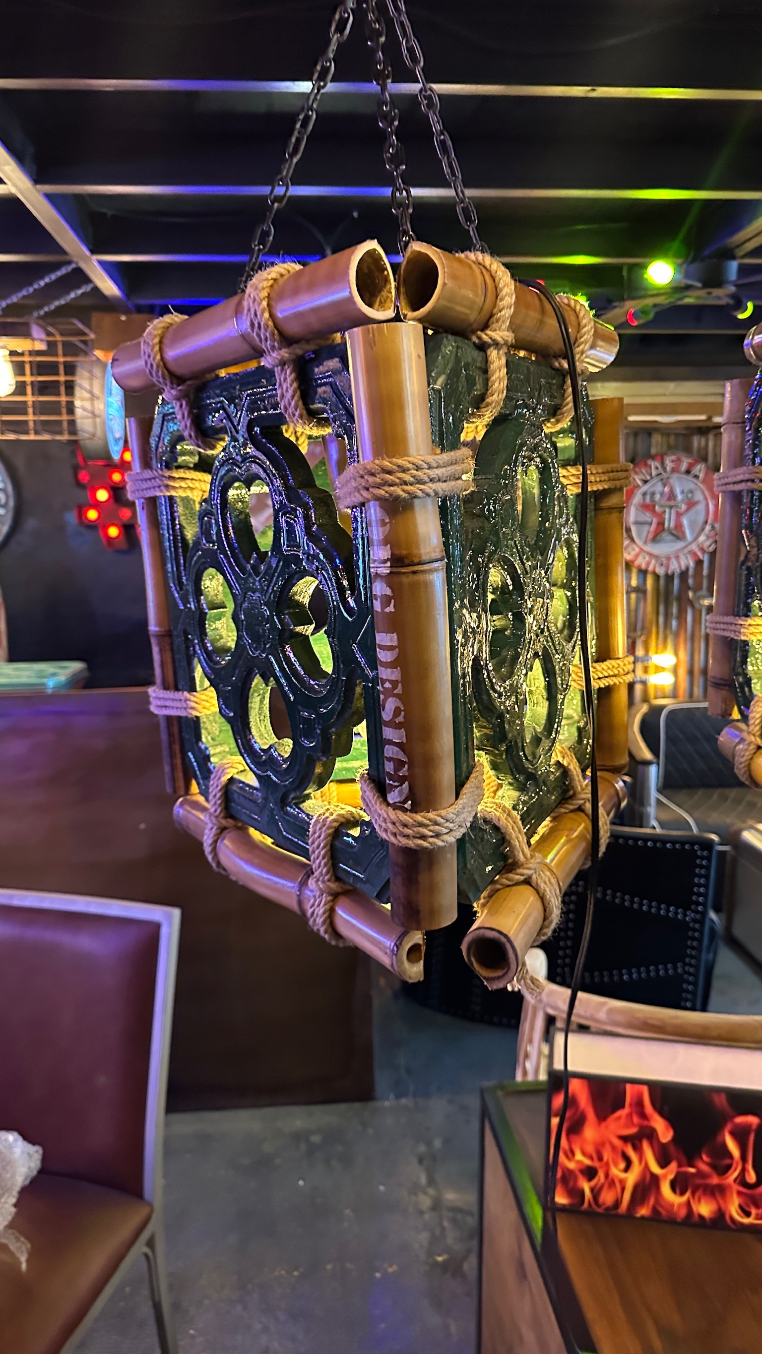 Iluminacion colgante Tiki, de caña de bambu y mosaico laqueado en resina.