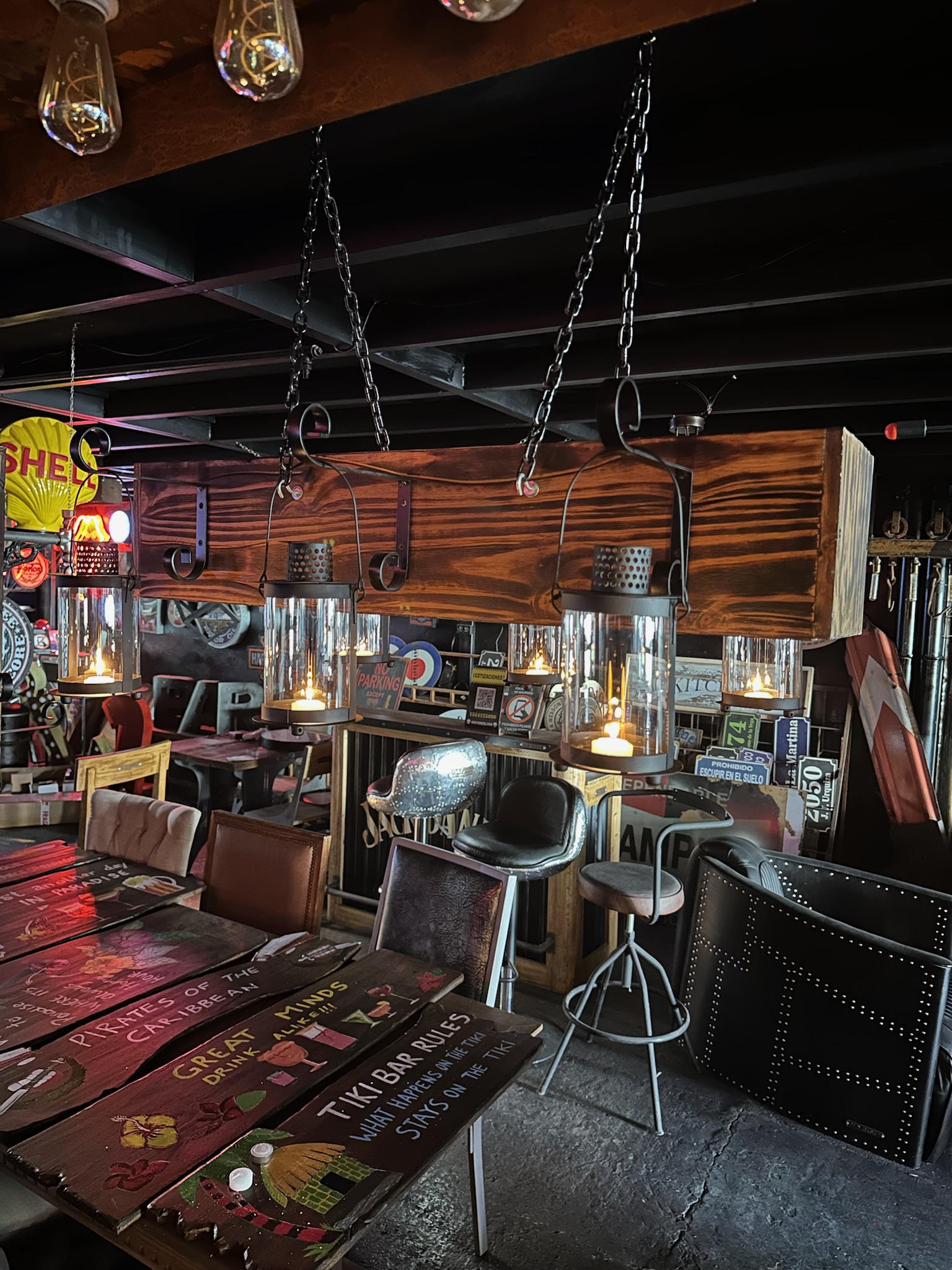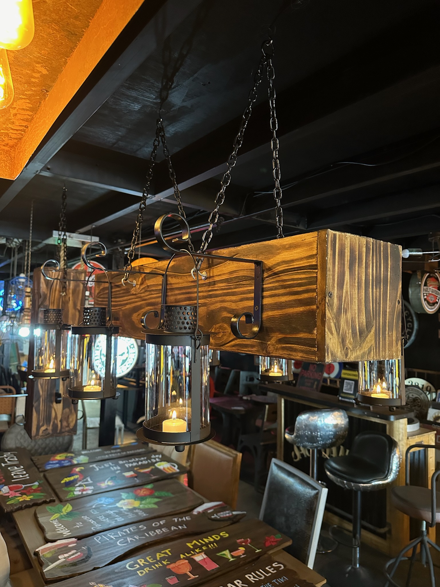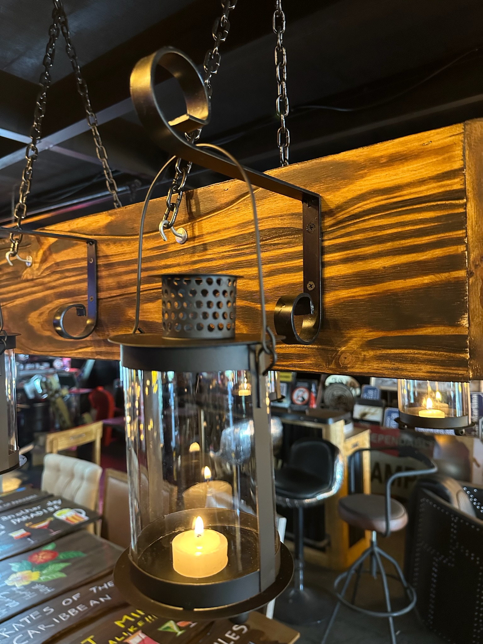Iluminación colgante de madera. y faroles para velas.