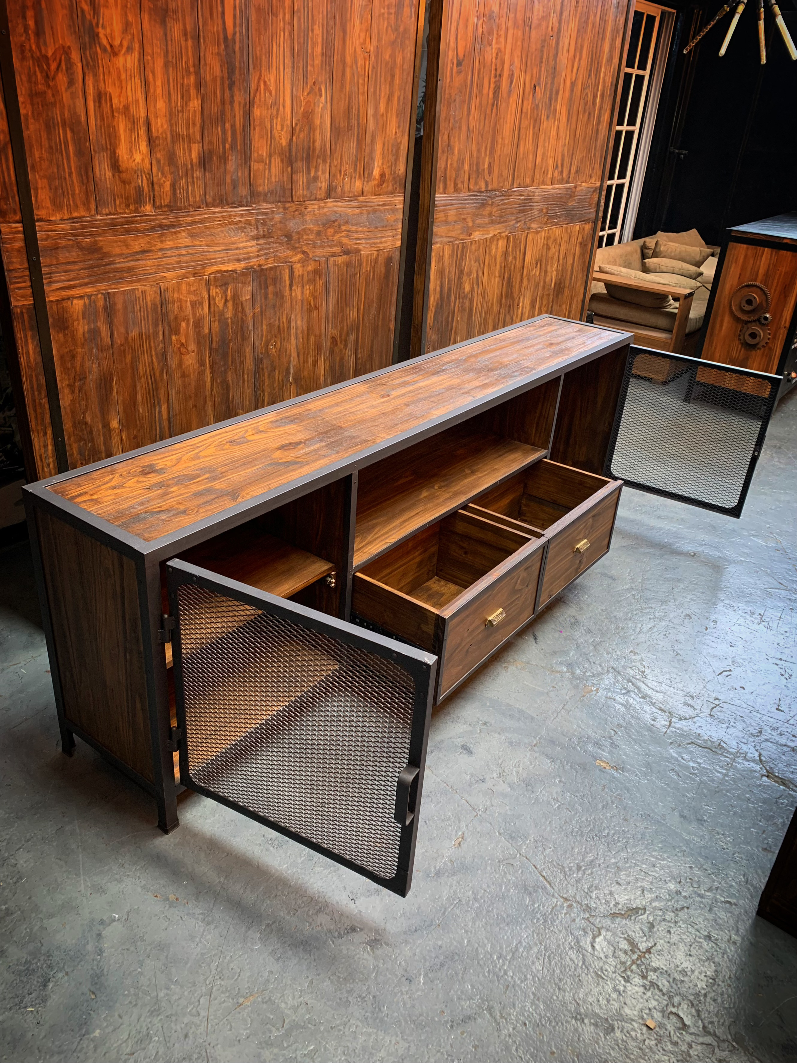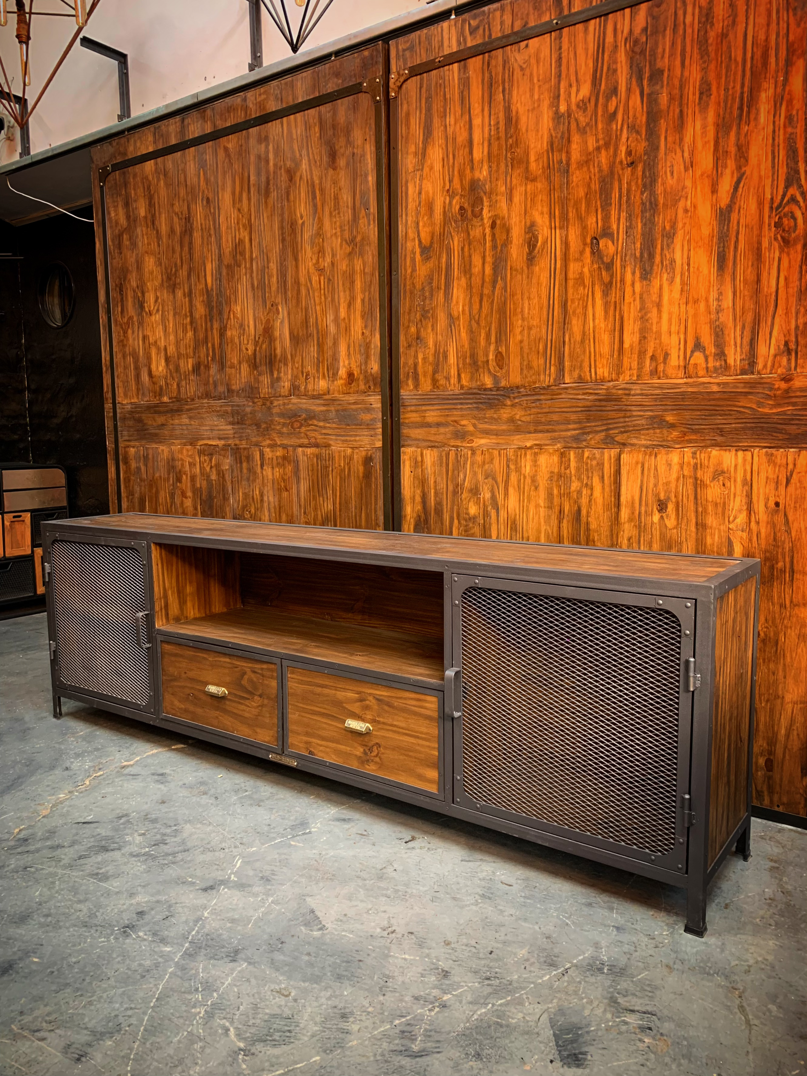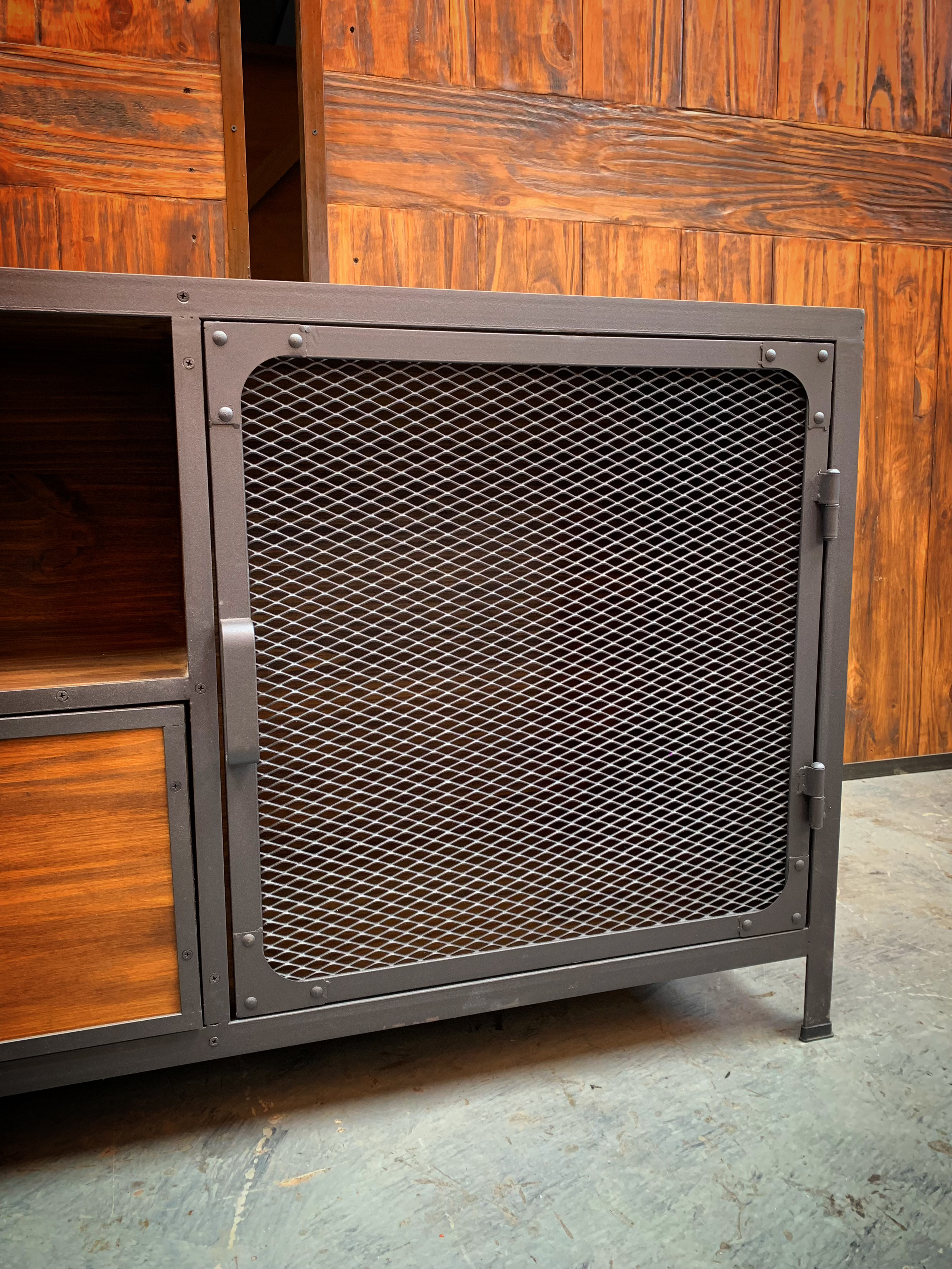 Mueble de TV, escructura hierro, madera. metal desplegado en puertas.