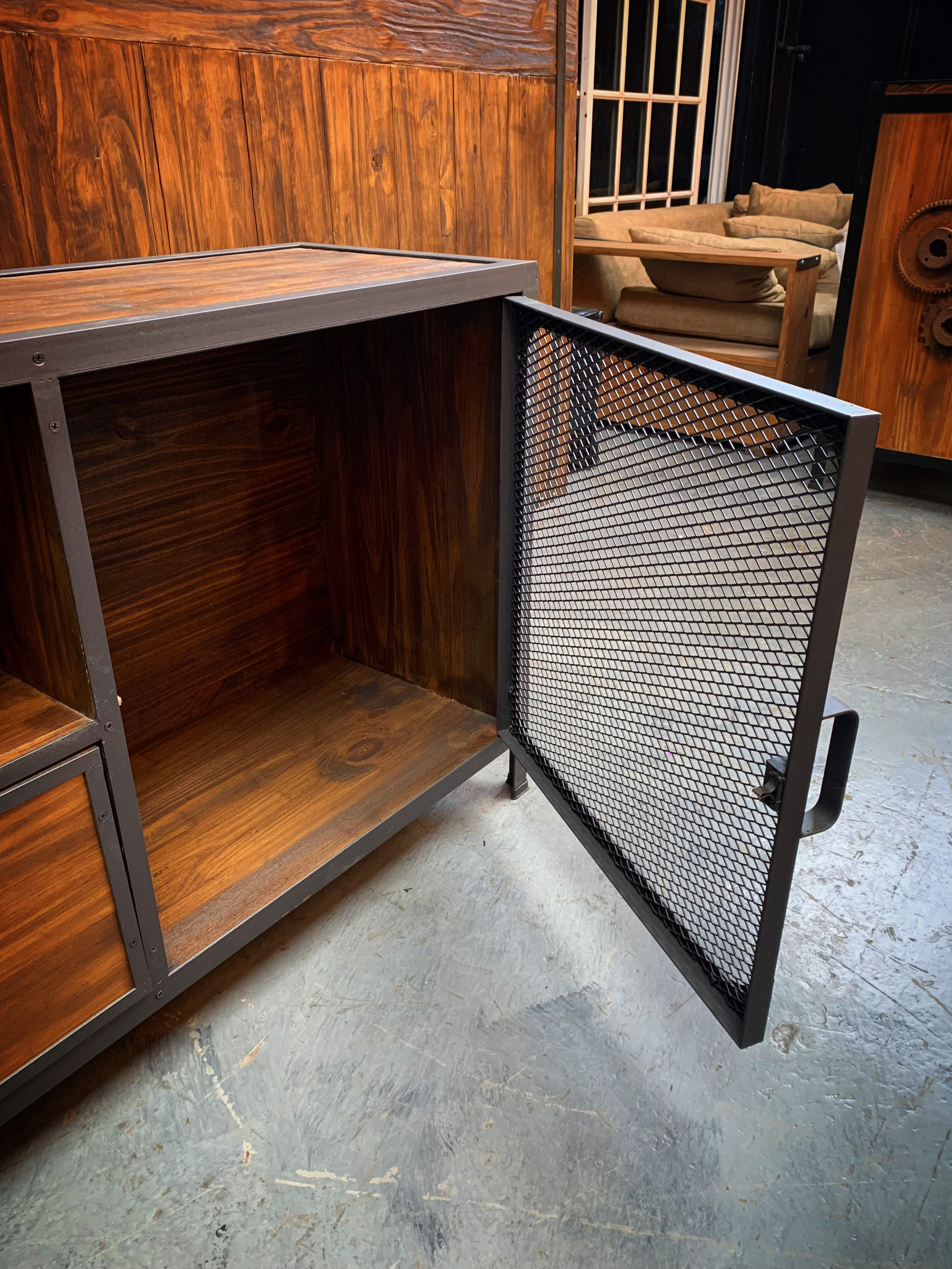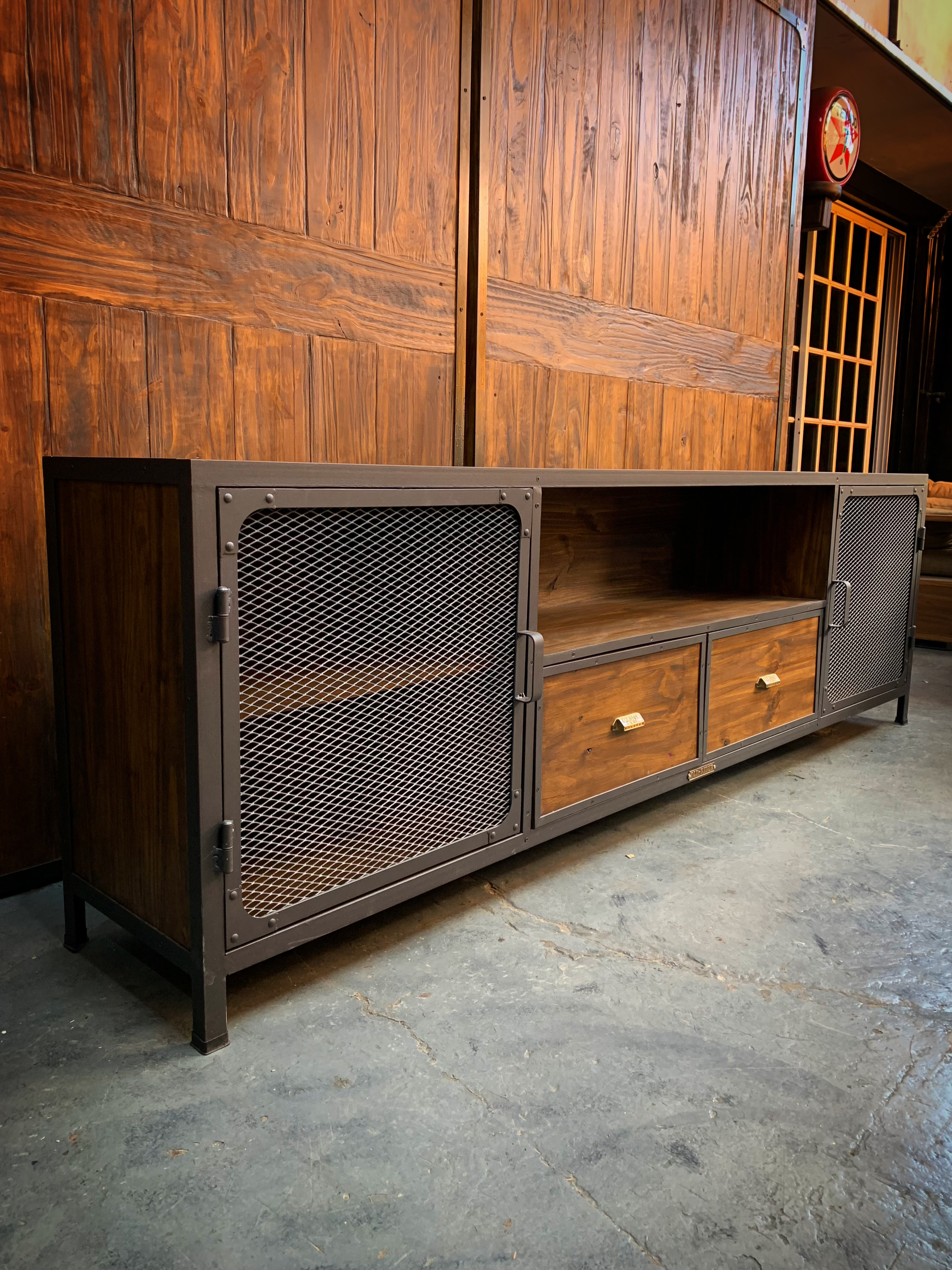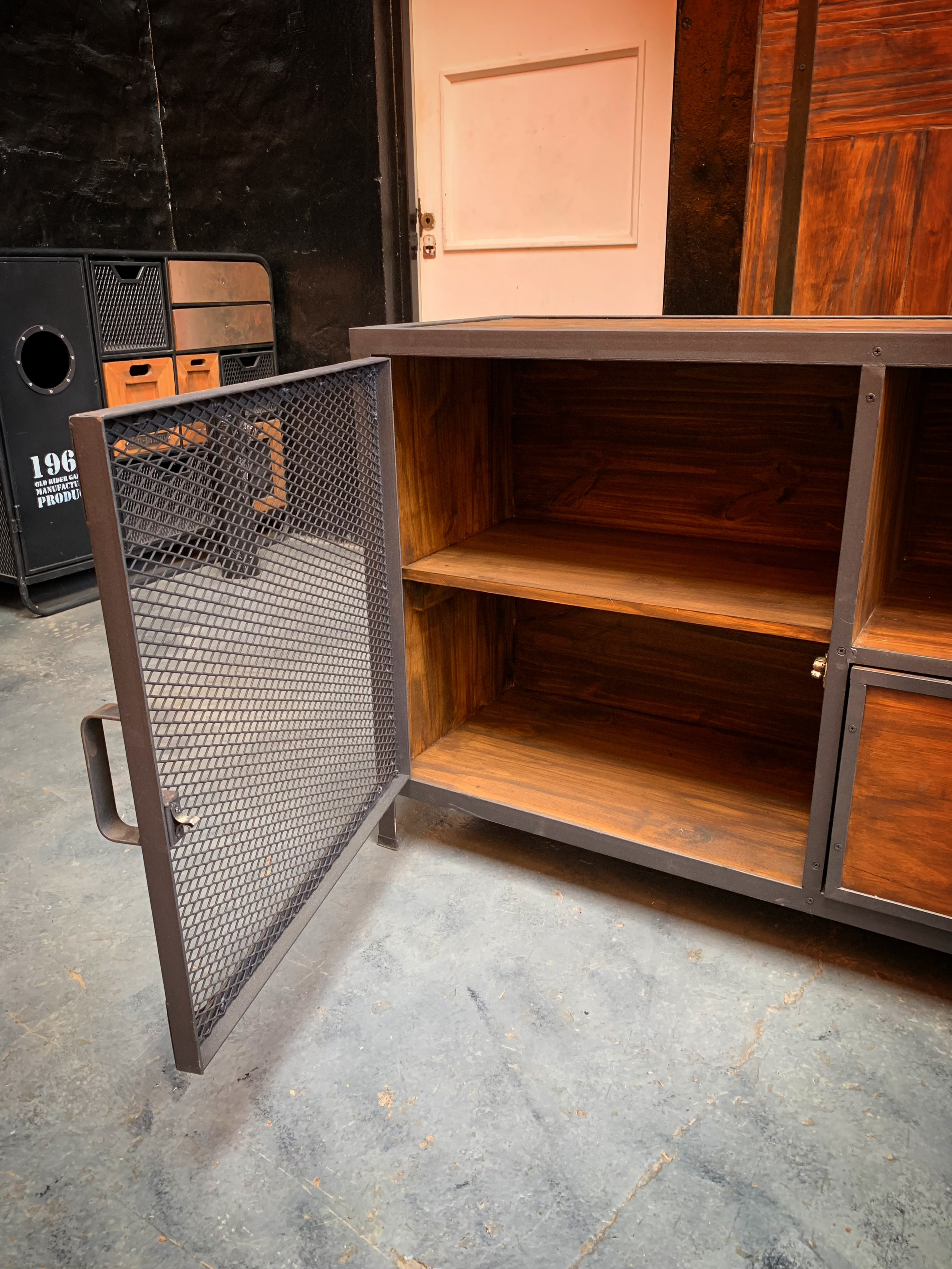 Mueble de TV, escructura hierro, madera. metal desplegado en puertas.