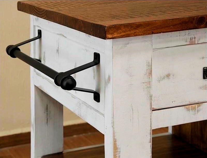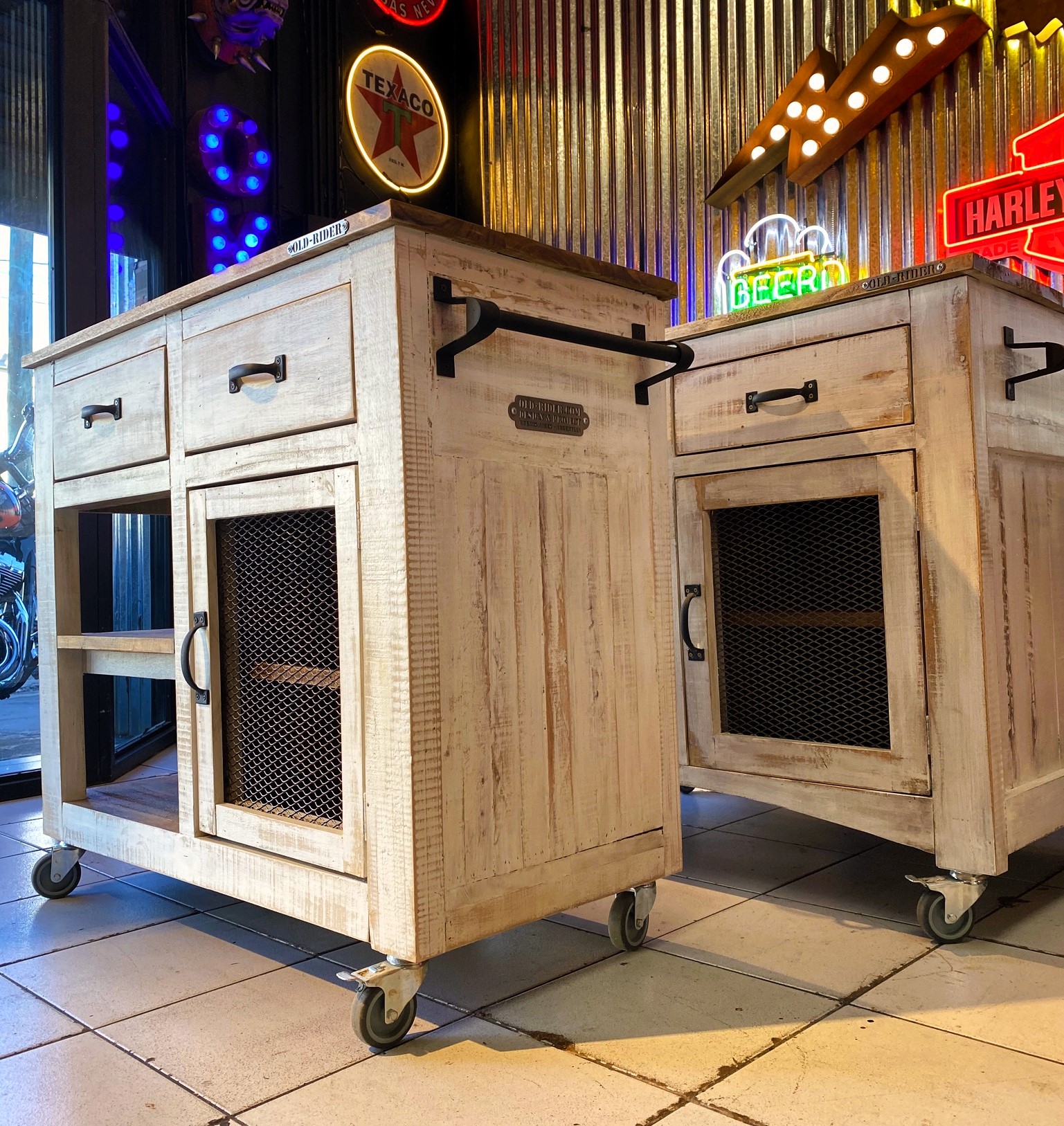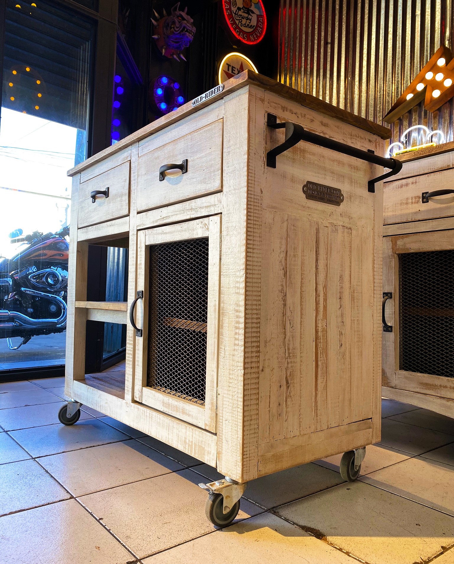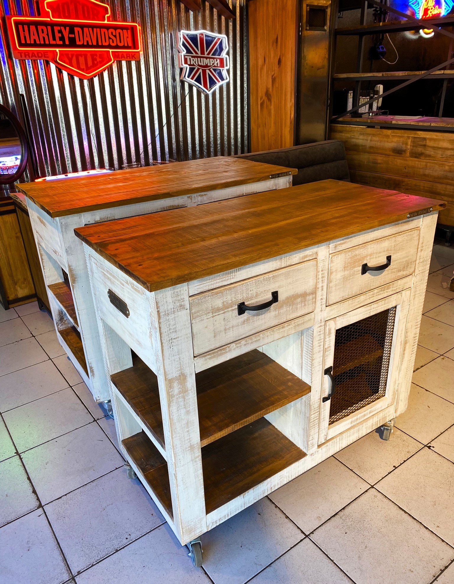 Isla carro con madera color a elección, estantes , cajones y puerta de chapa