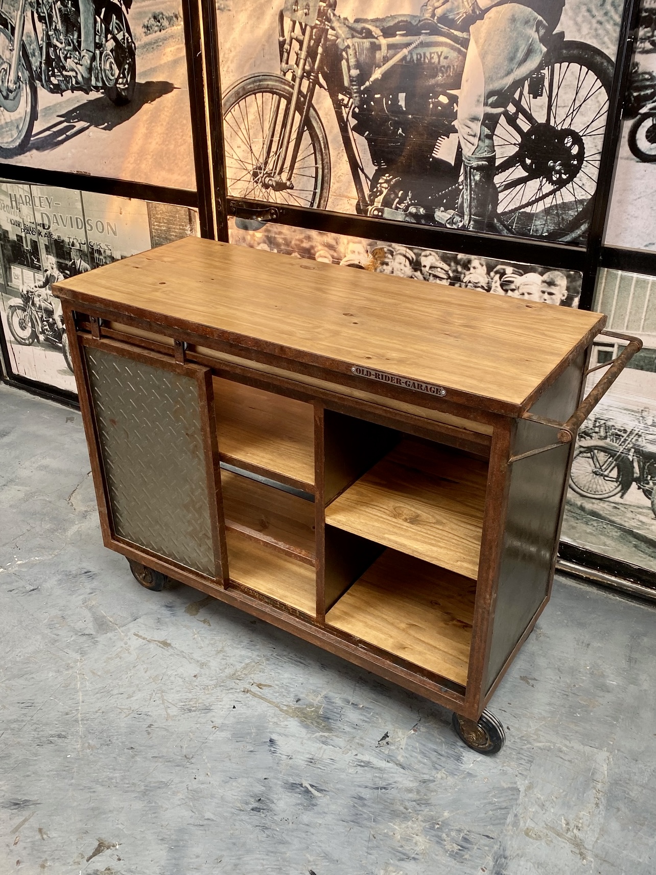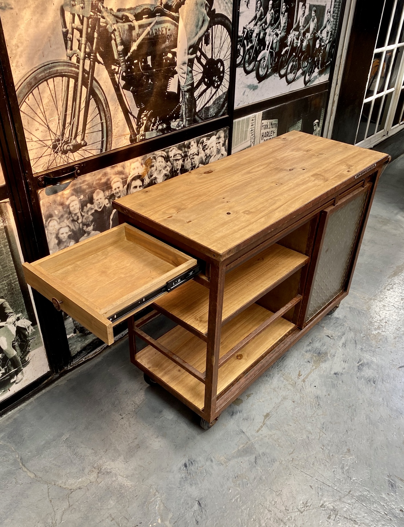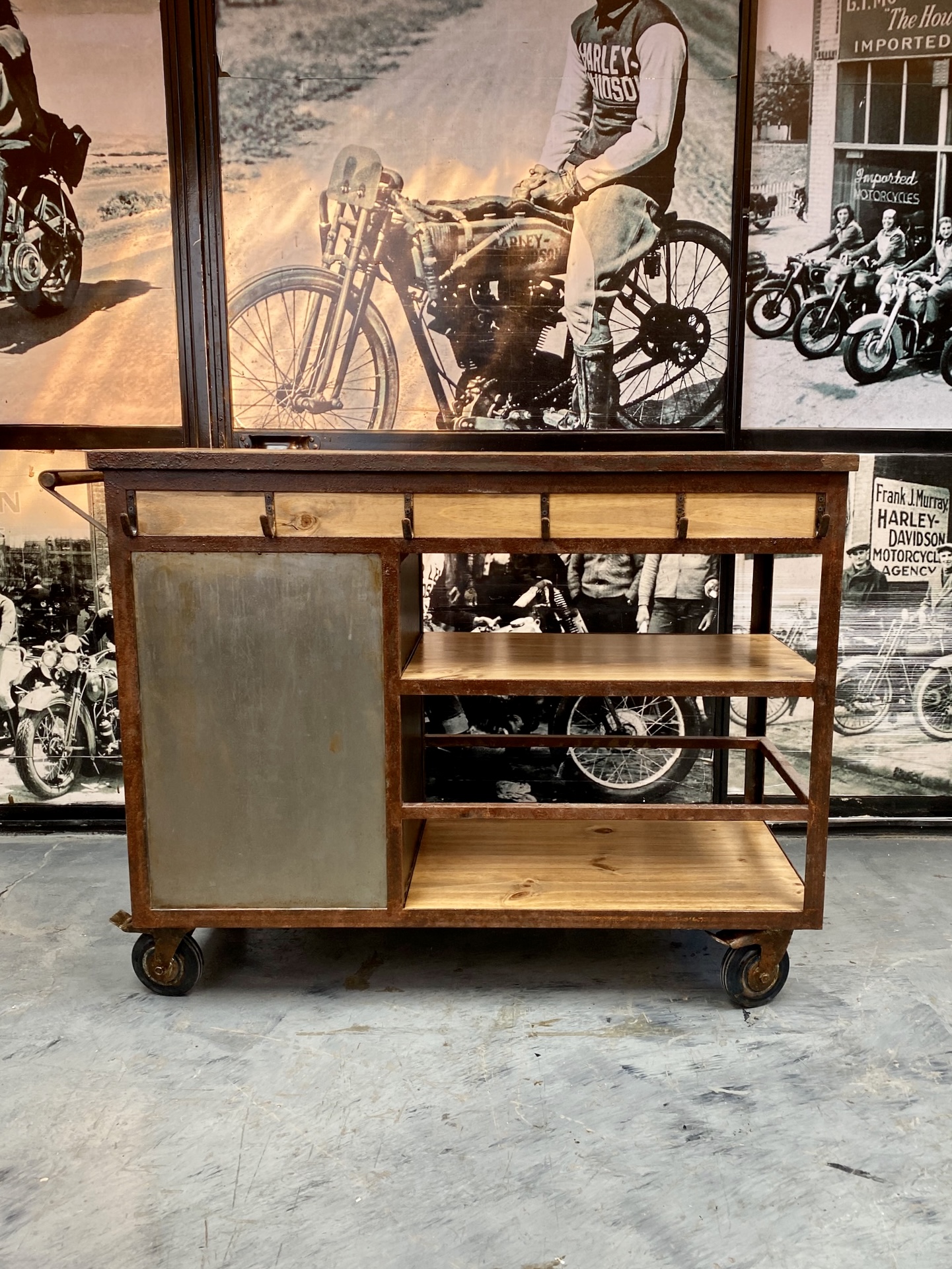 Isla carro con madera lisa, chapa, manija y ganchos de acero oxid, puertita granero y cajón lateral.
