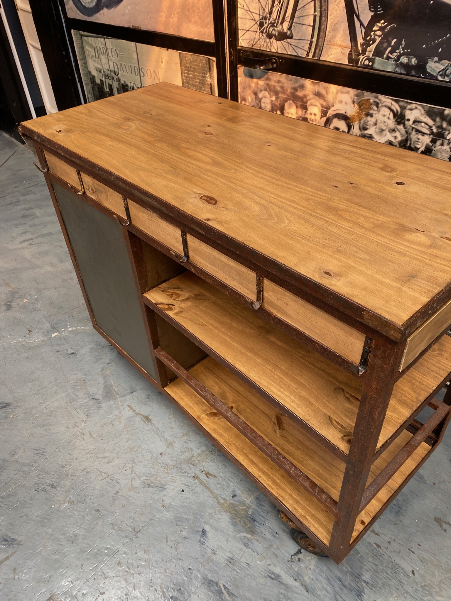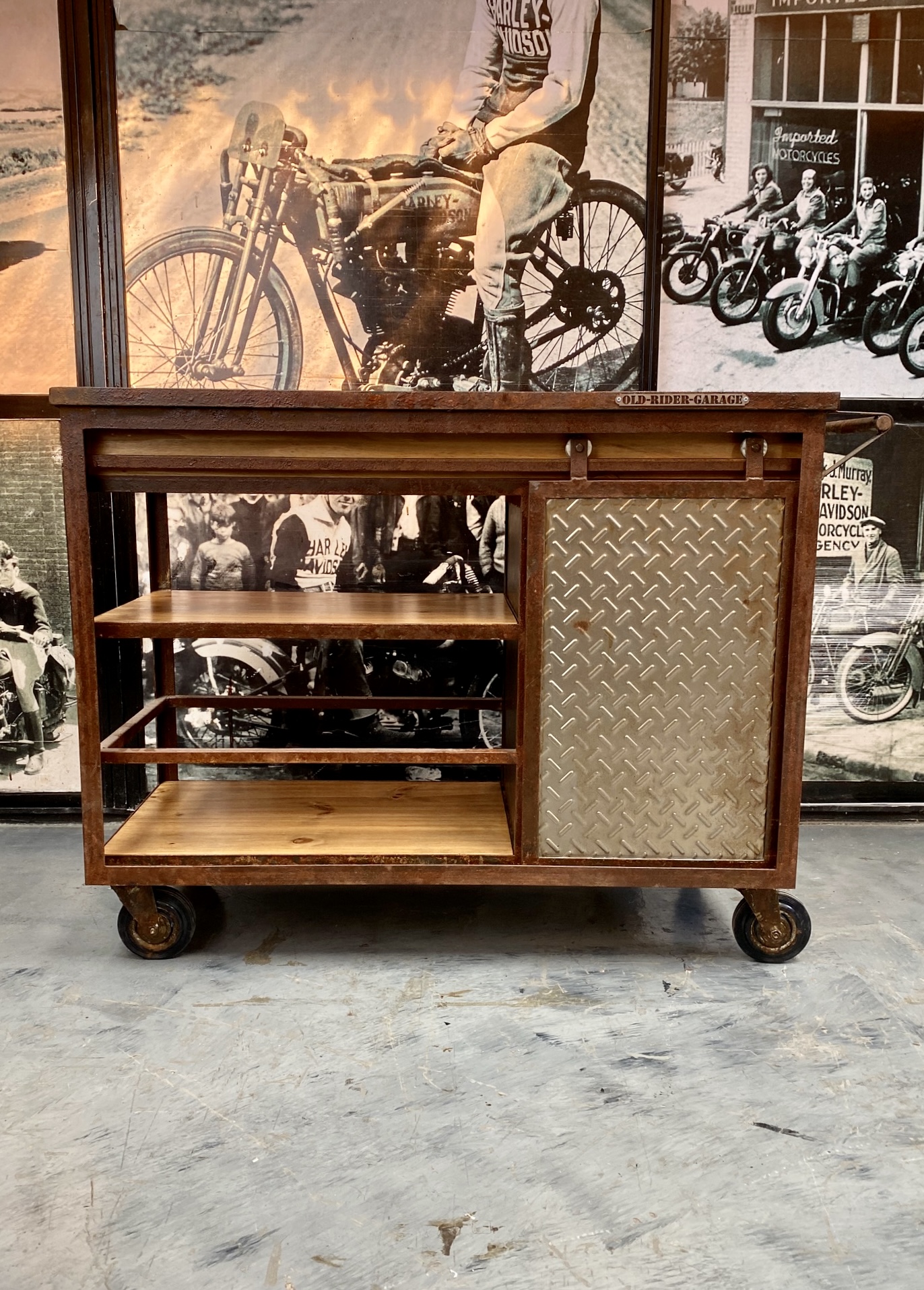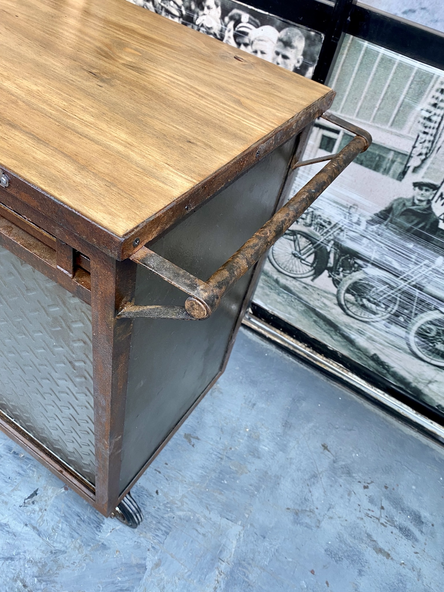 Isla carro con madera lisa, chapa, manija y ganchos de acero oxid, puertita granero y cajón lateral.