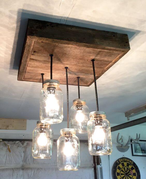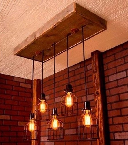 Iluminación colgante de madera con botellas, frascos y jaula de alambre. totalmente personalizable.