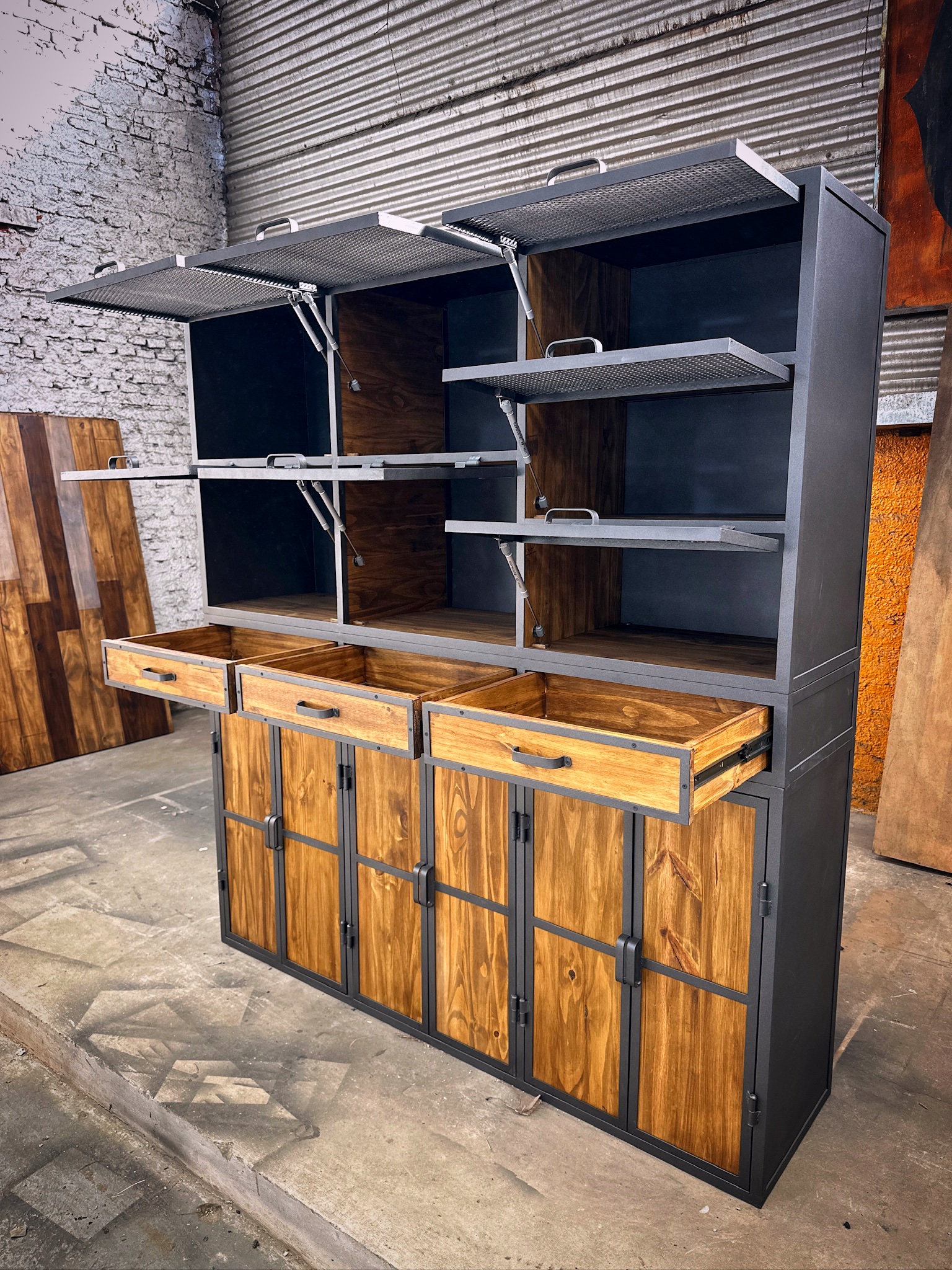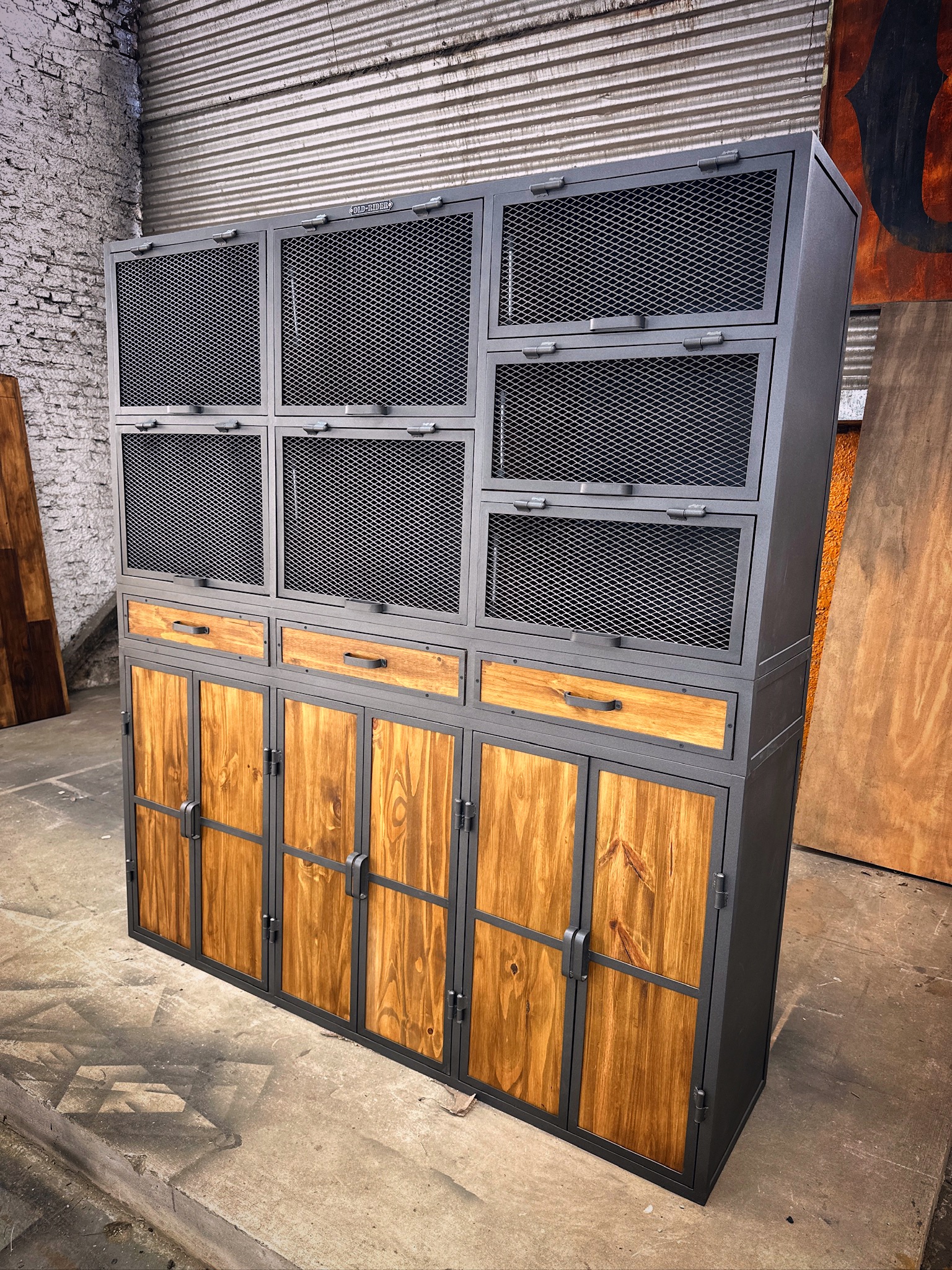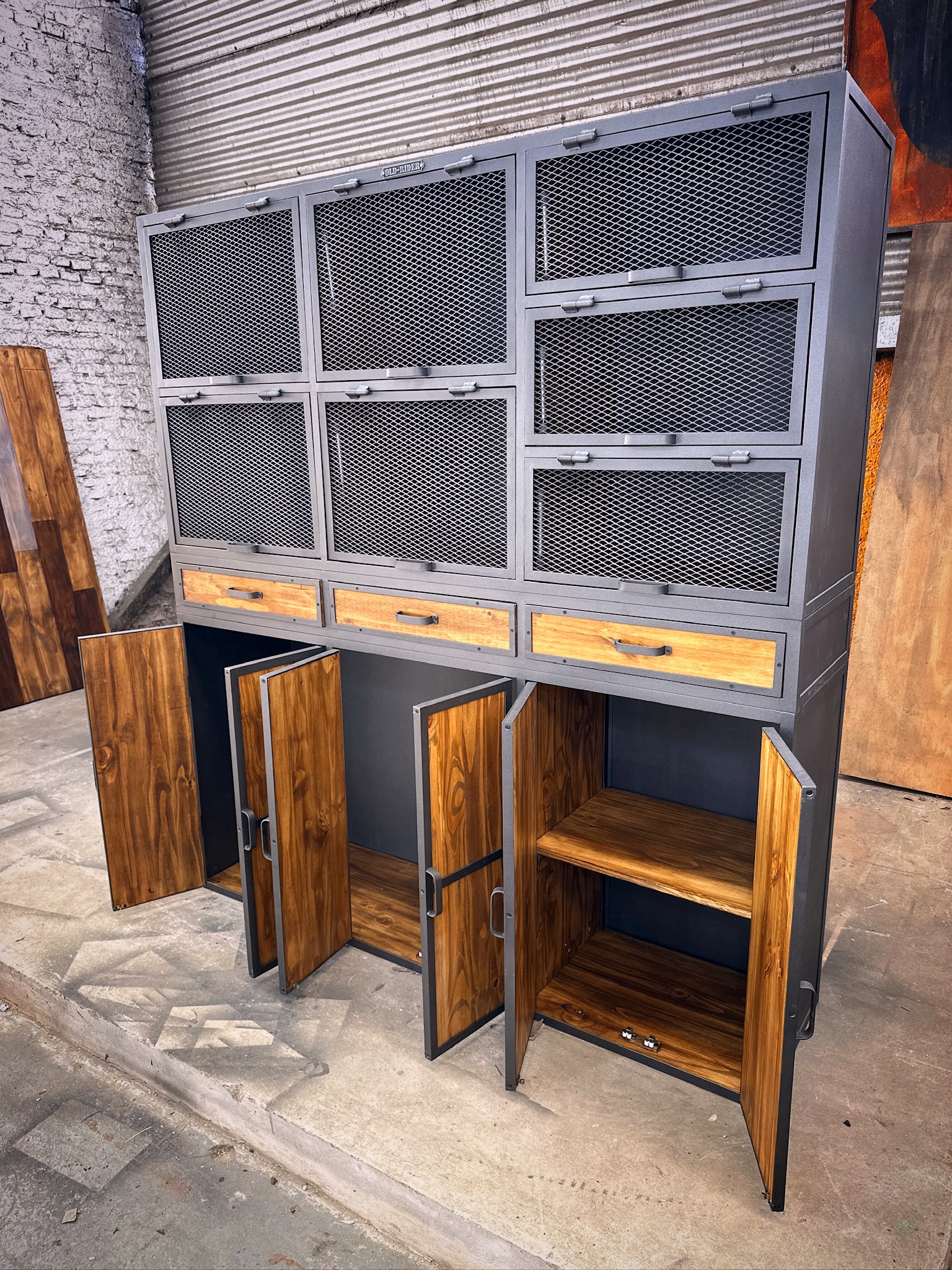 Mueble industrial, estilo locker, puertas de metal desplegado y madera