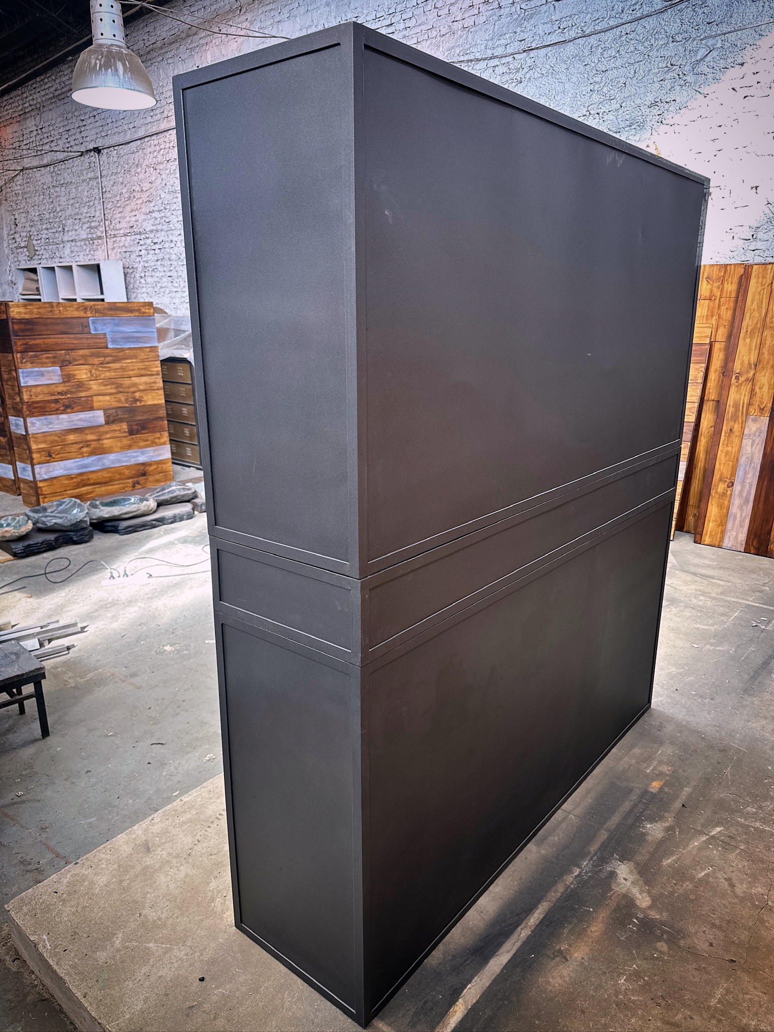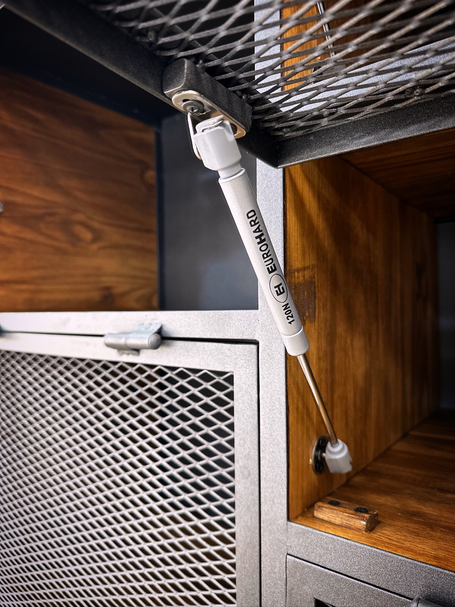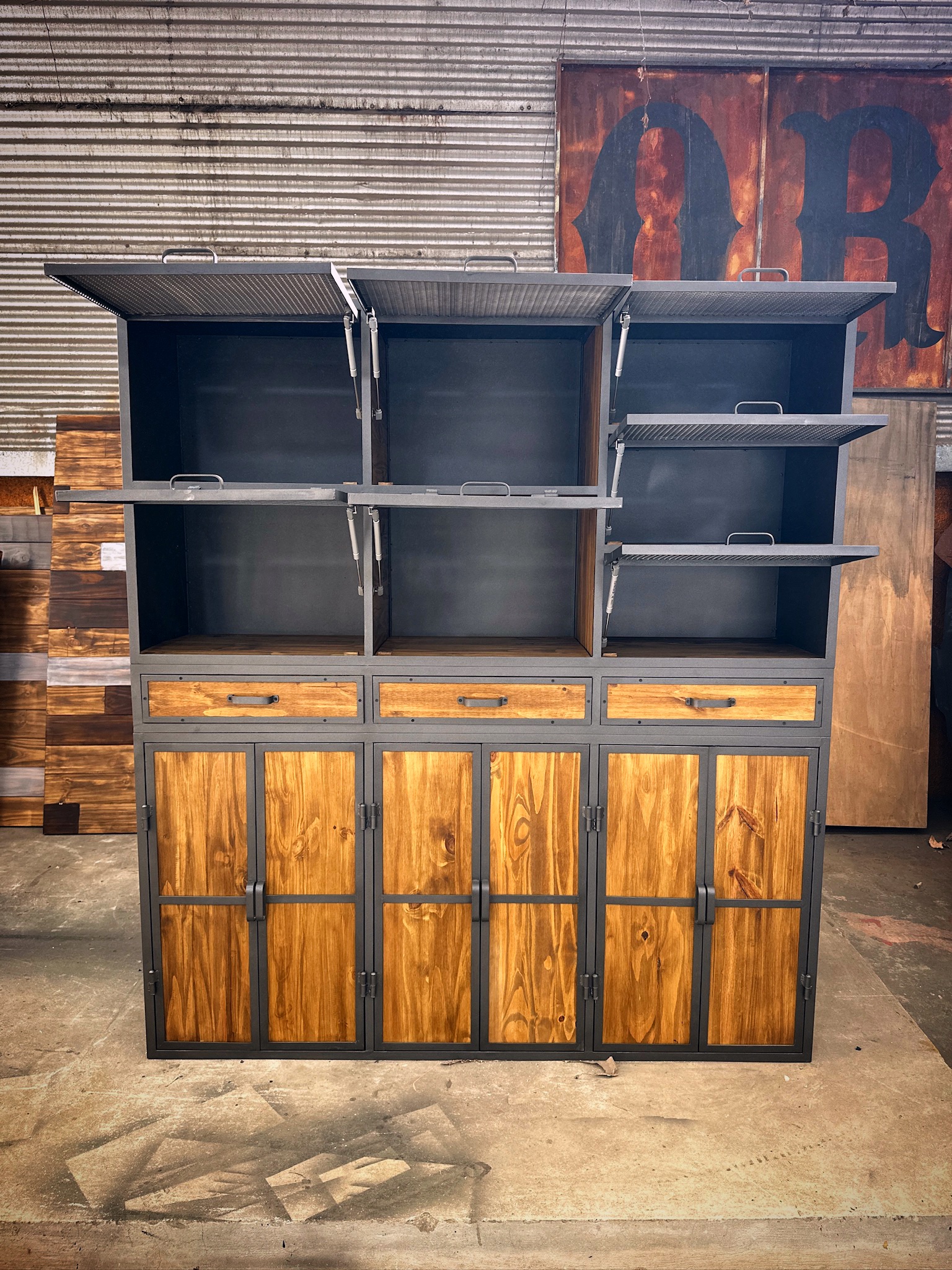 Mueble industrial, estilo locker, puertas de metal desplegado y madera