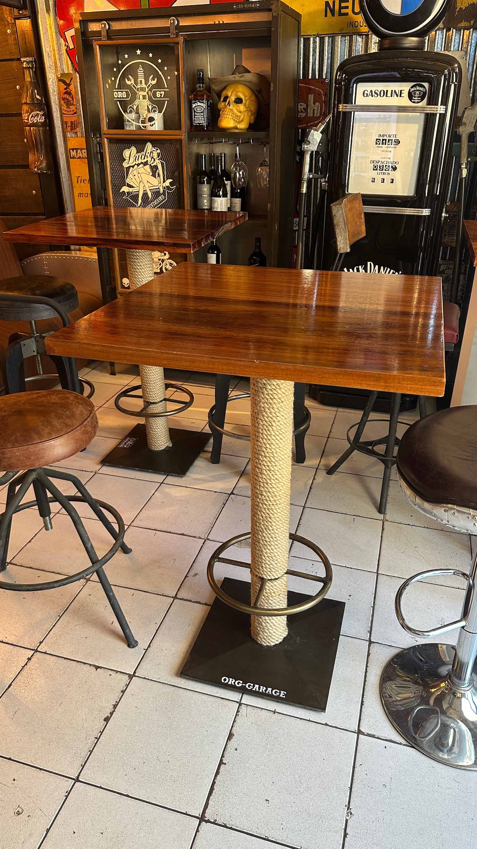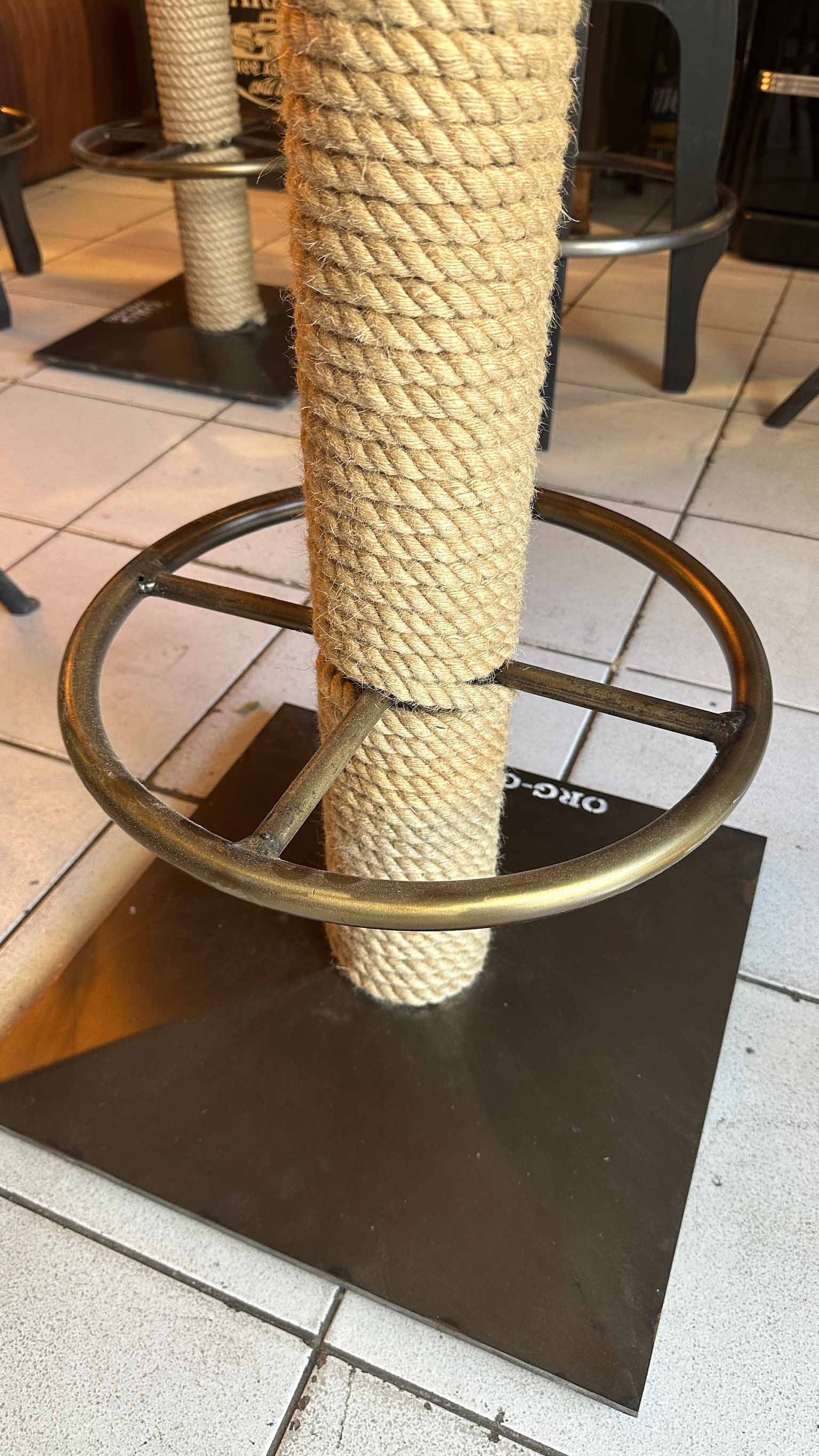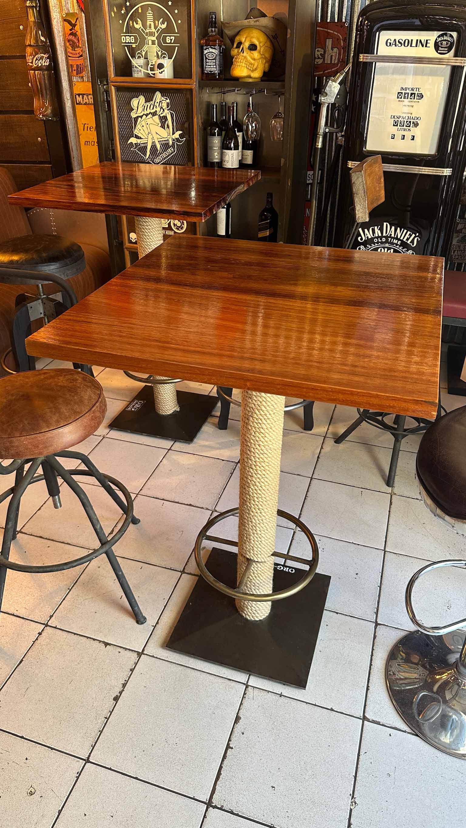 Mesa alta, madera timbó, detalle de soga, pata de hierro