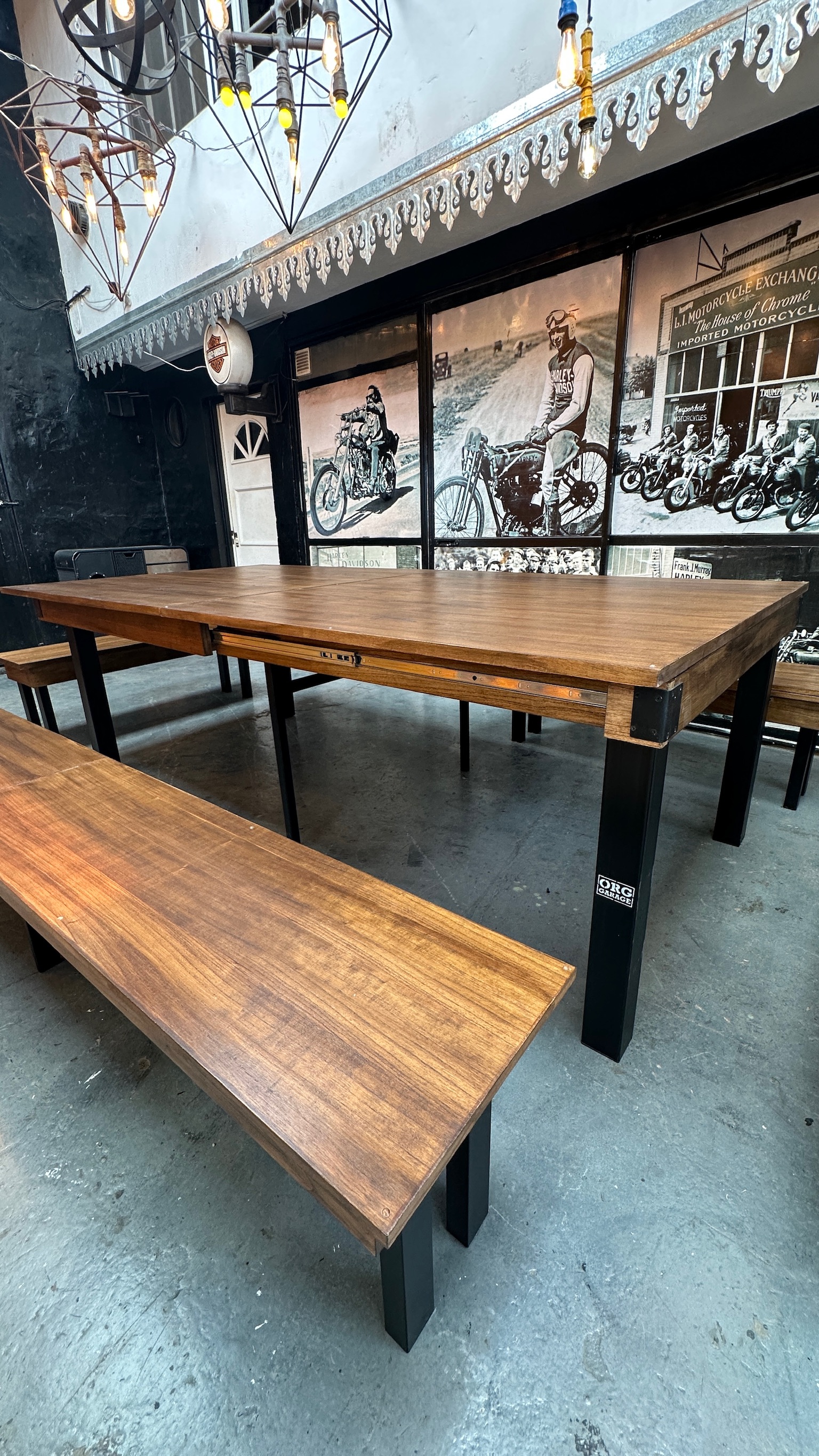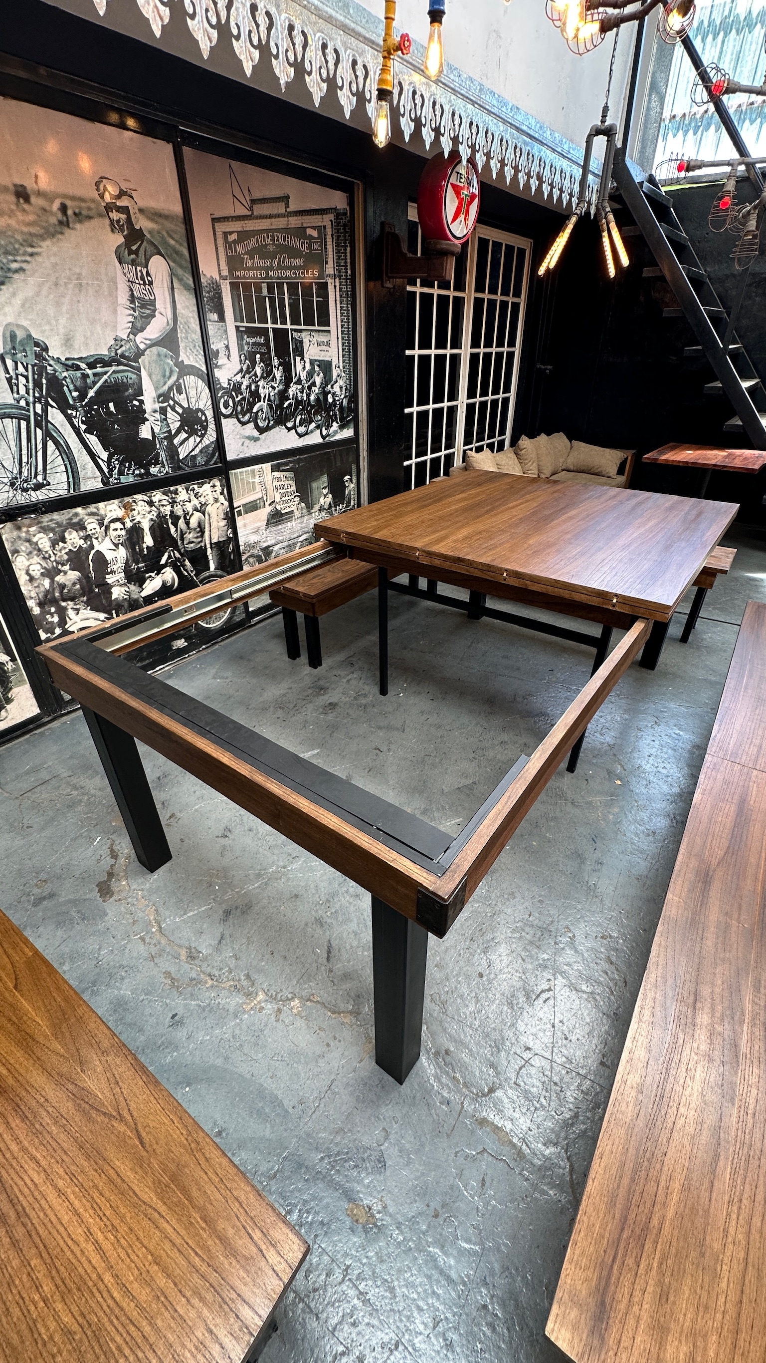 Mesa extensible madera, patas de hierro.