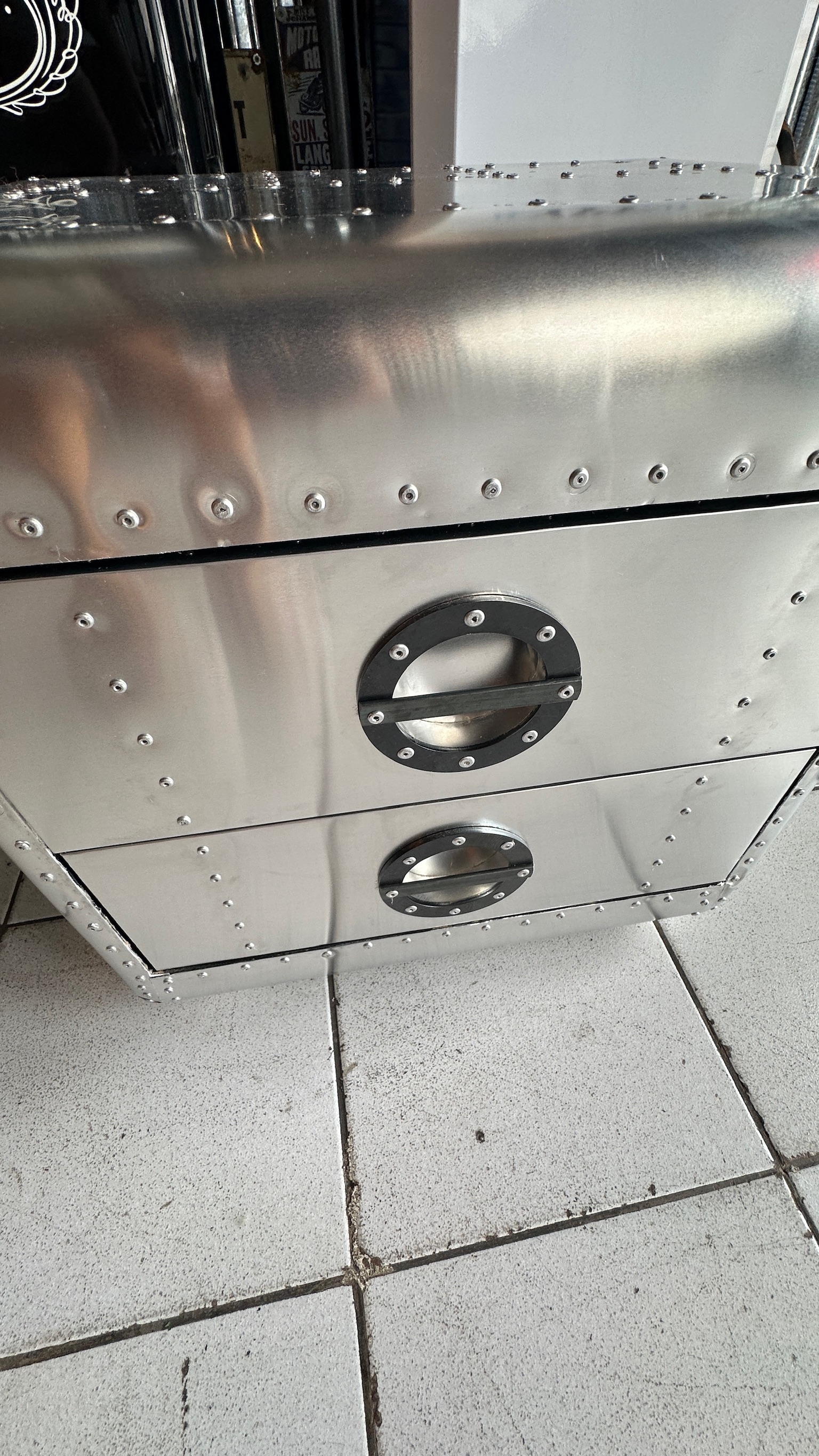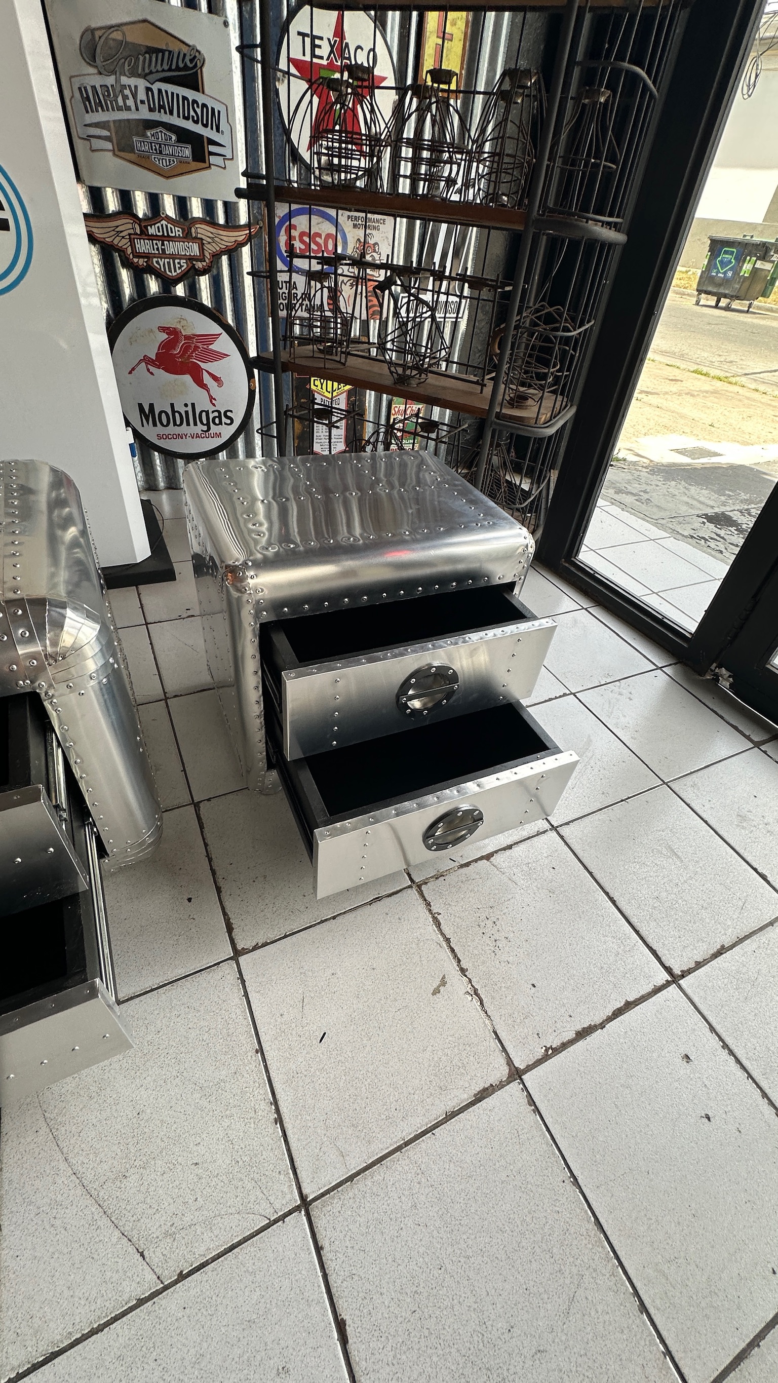 Mesa de luz de la linea aviator, esta completamente rodeada con aluminio y cuenta con 2 cajones.