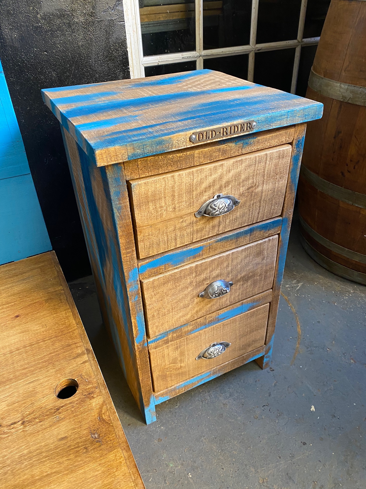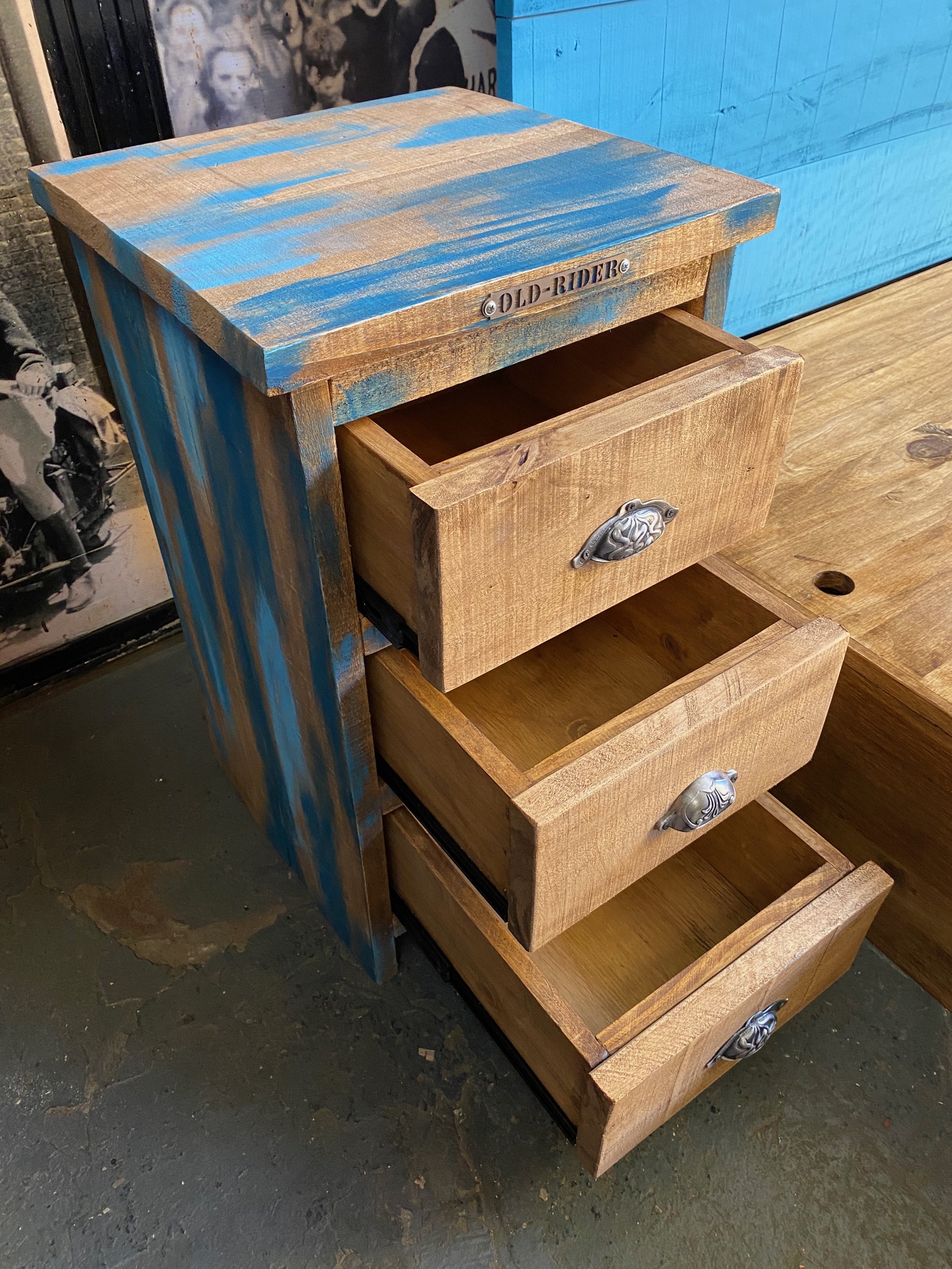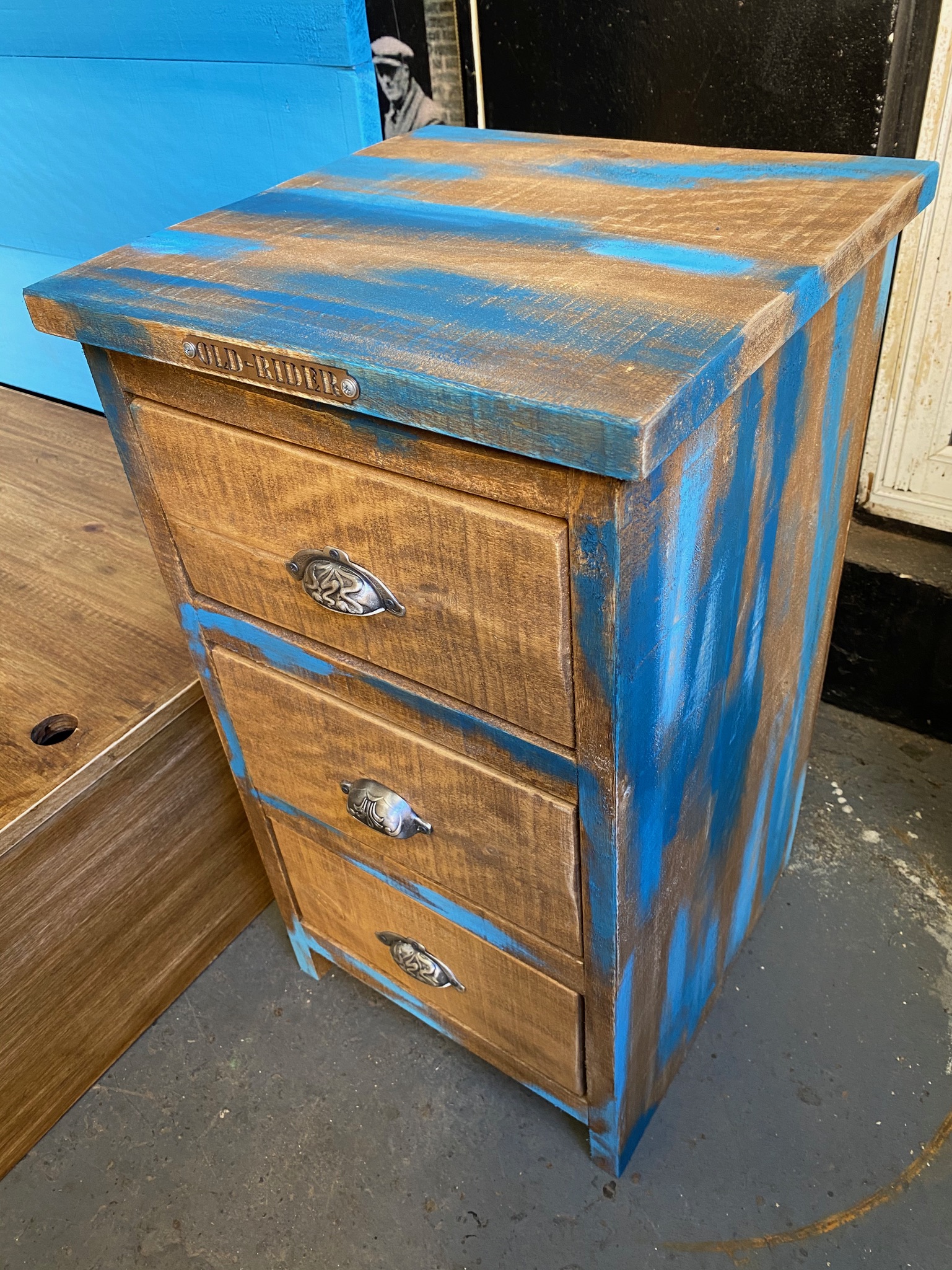 Mesita de luz de madera pintada con acabado en desgaste azul y tres cajones. Diseños personalizados.