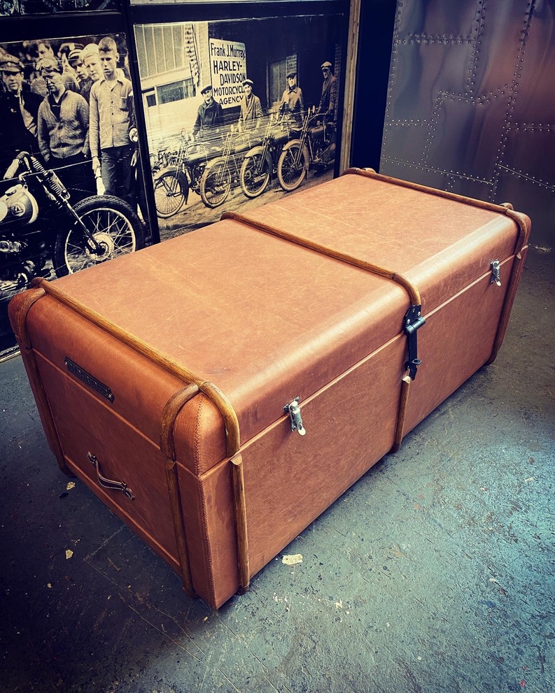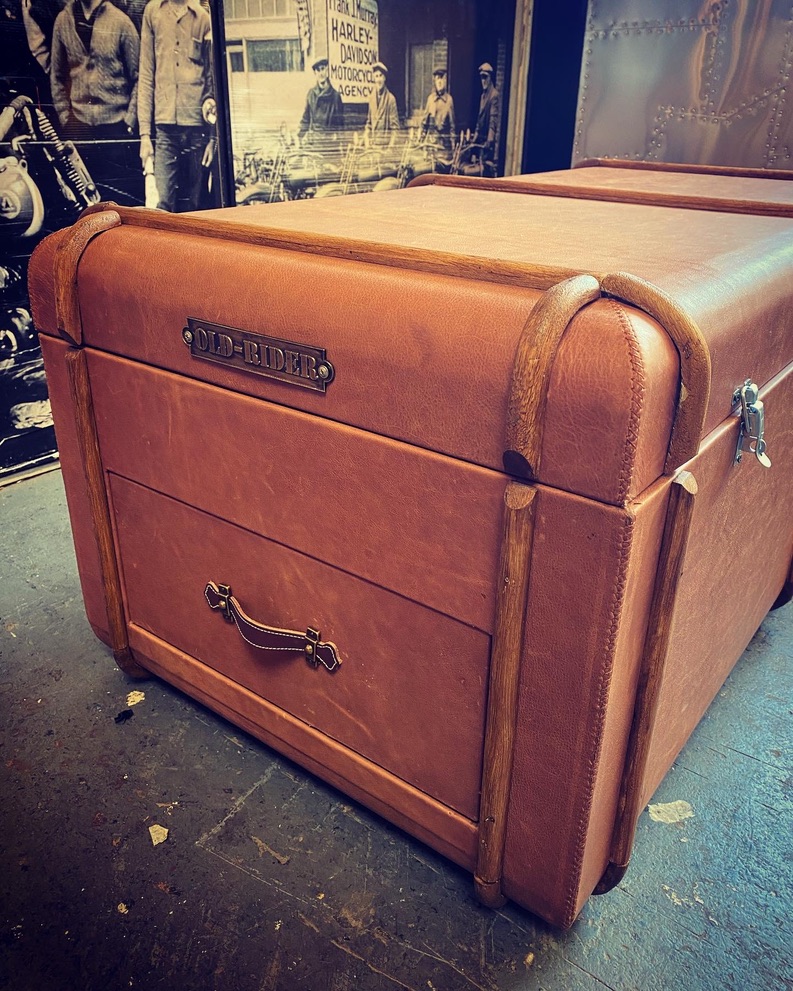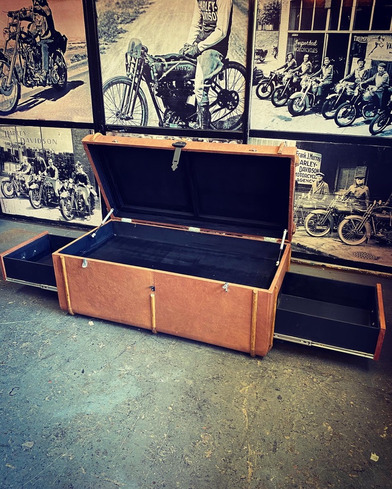 Mesa ratona tipo baul con cajones, tapizada en cuero vacuno.