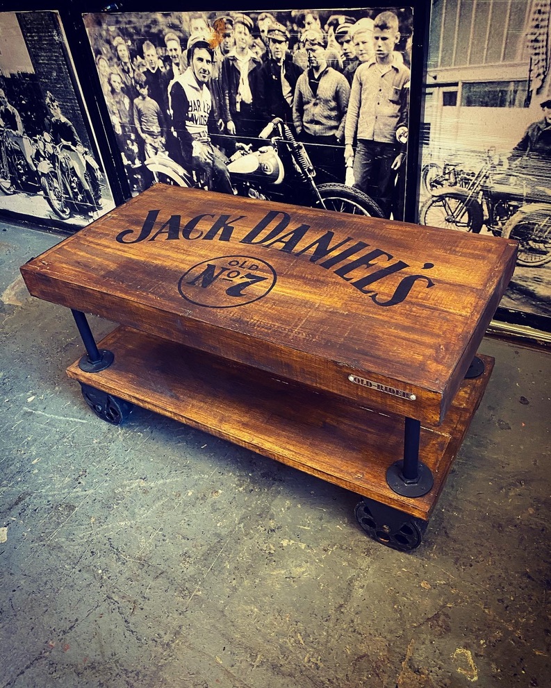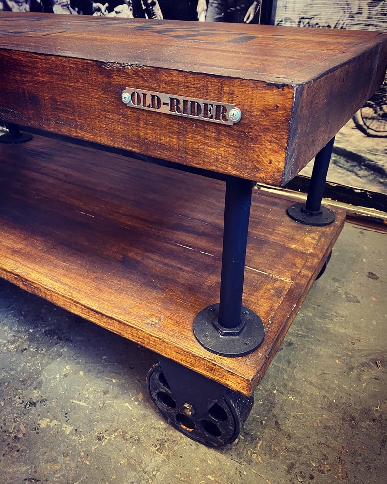 Mesa ratona madera, con caño de agua de hiero, con ruedas de metal artesanales.