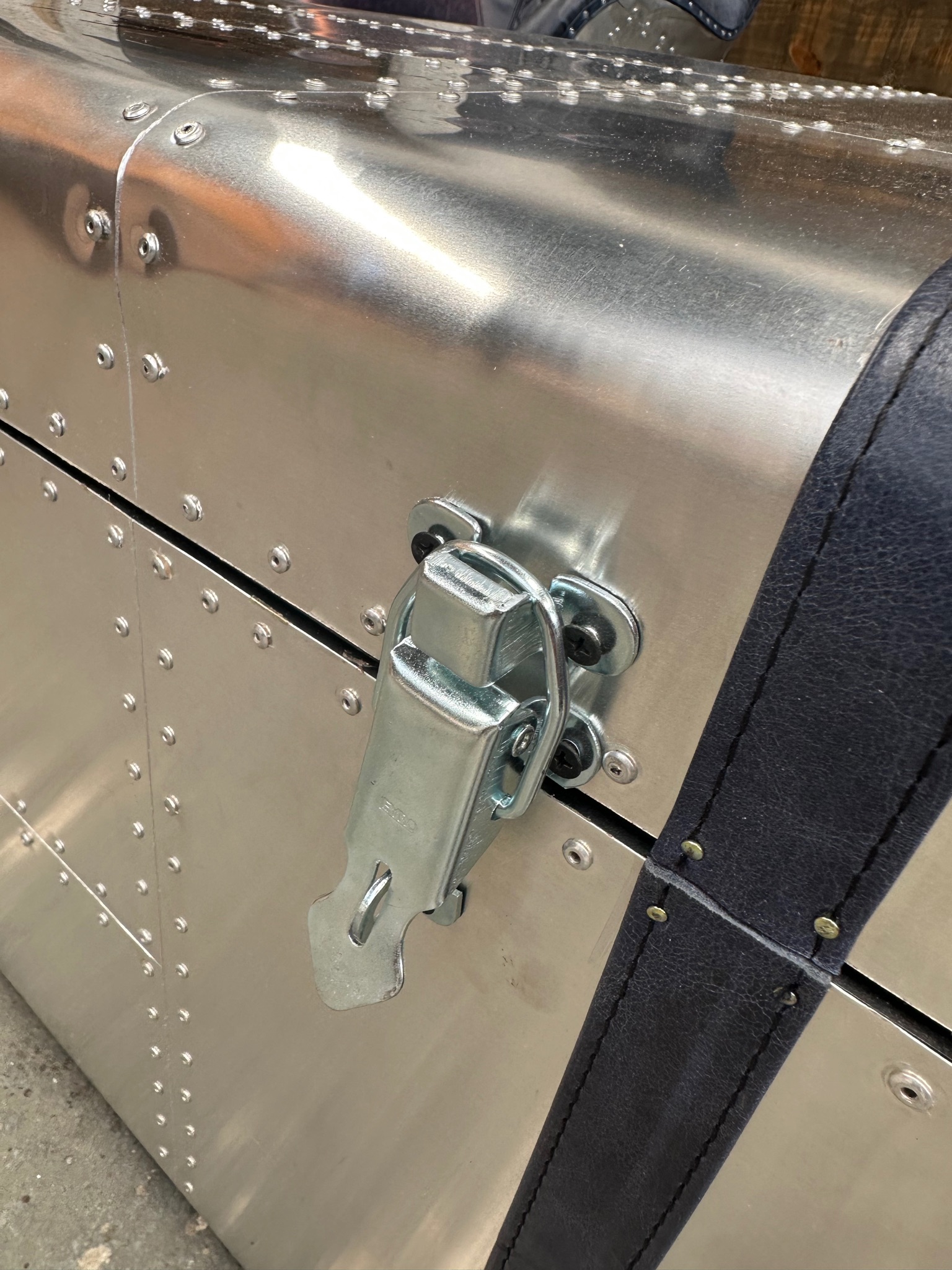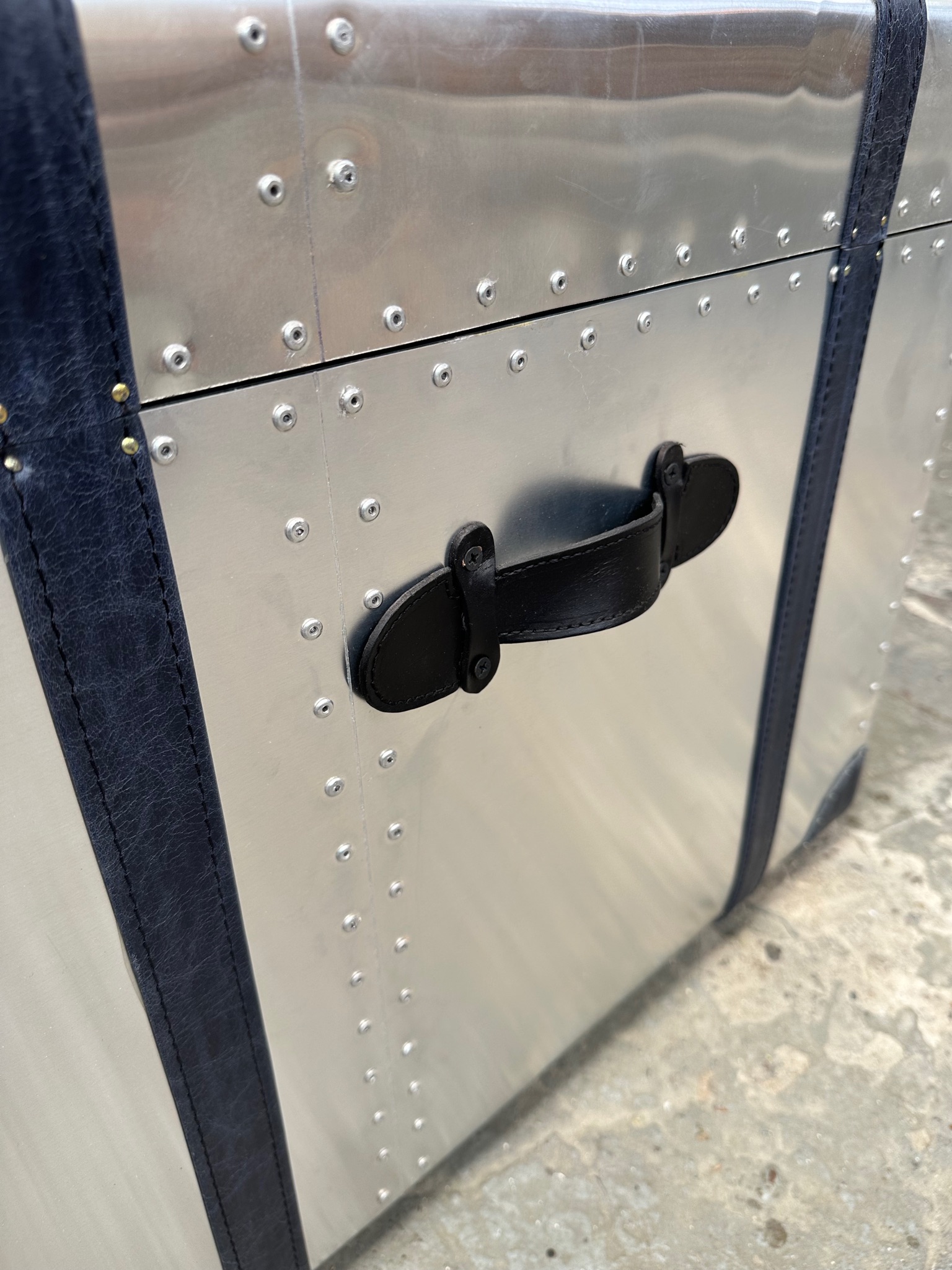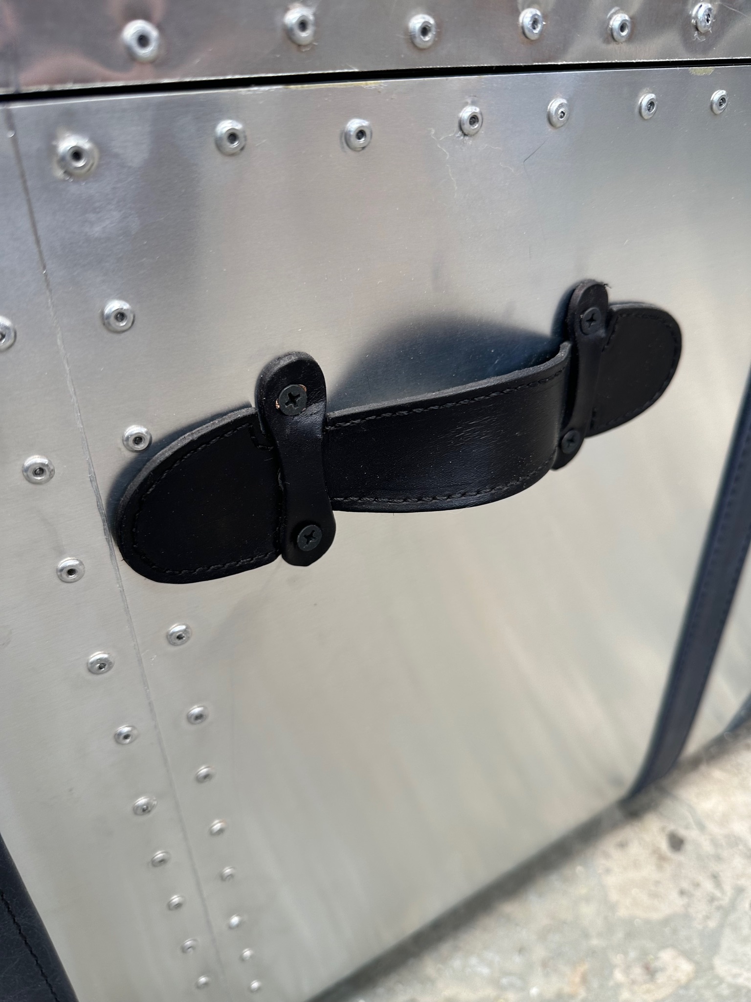 Mesa ratona de aluminio tipo baul, recubierto en aluminio, esquineros de cuero.