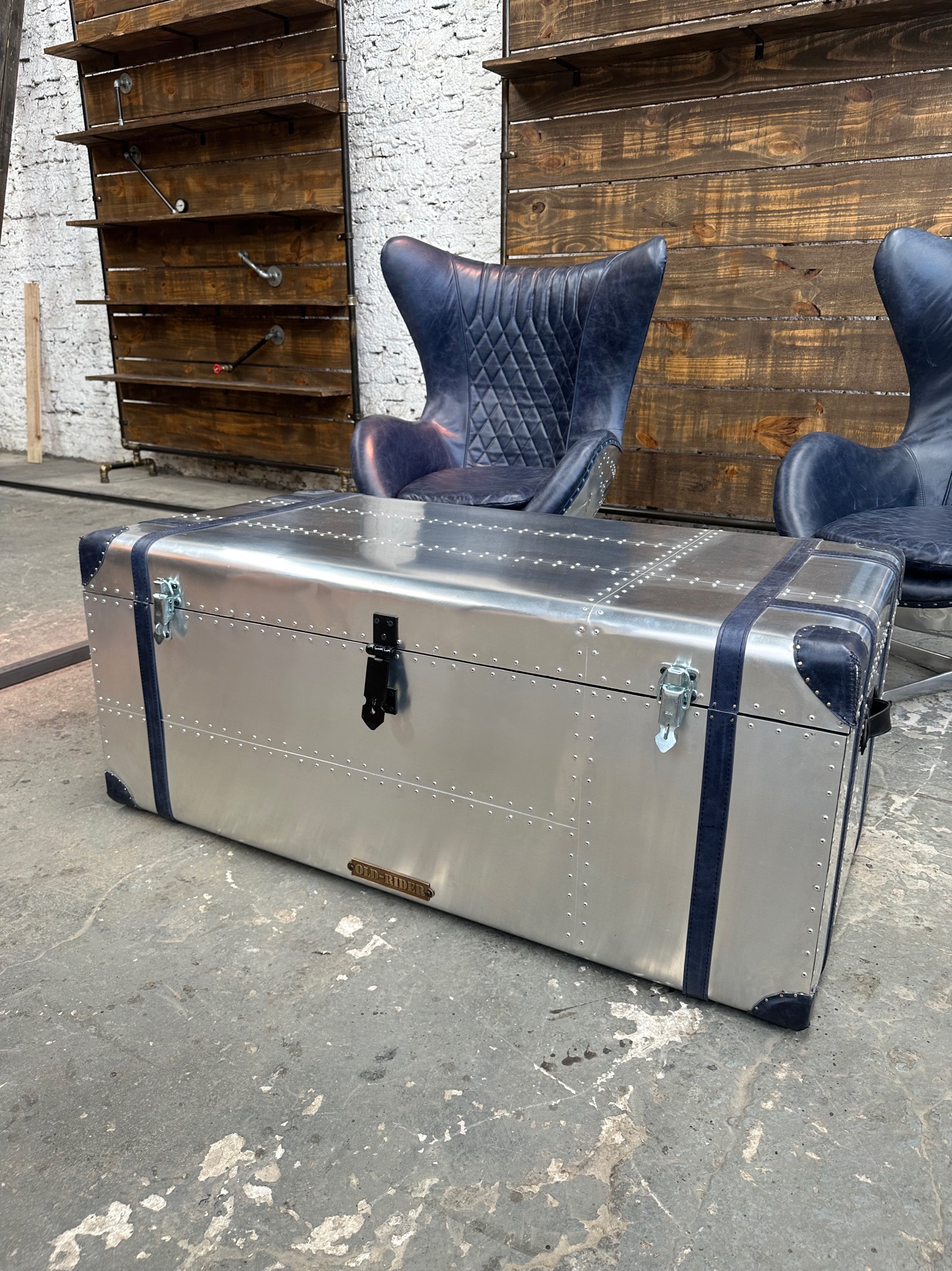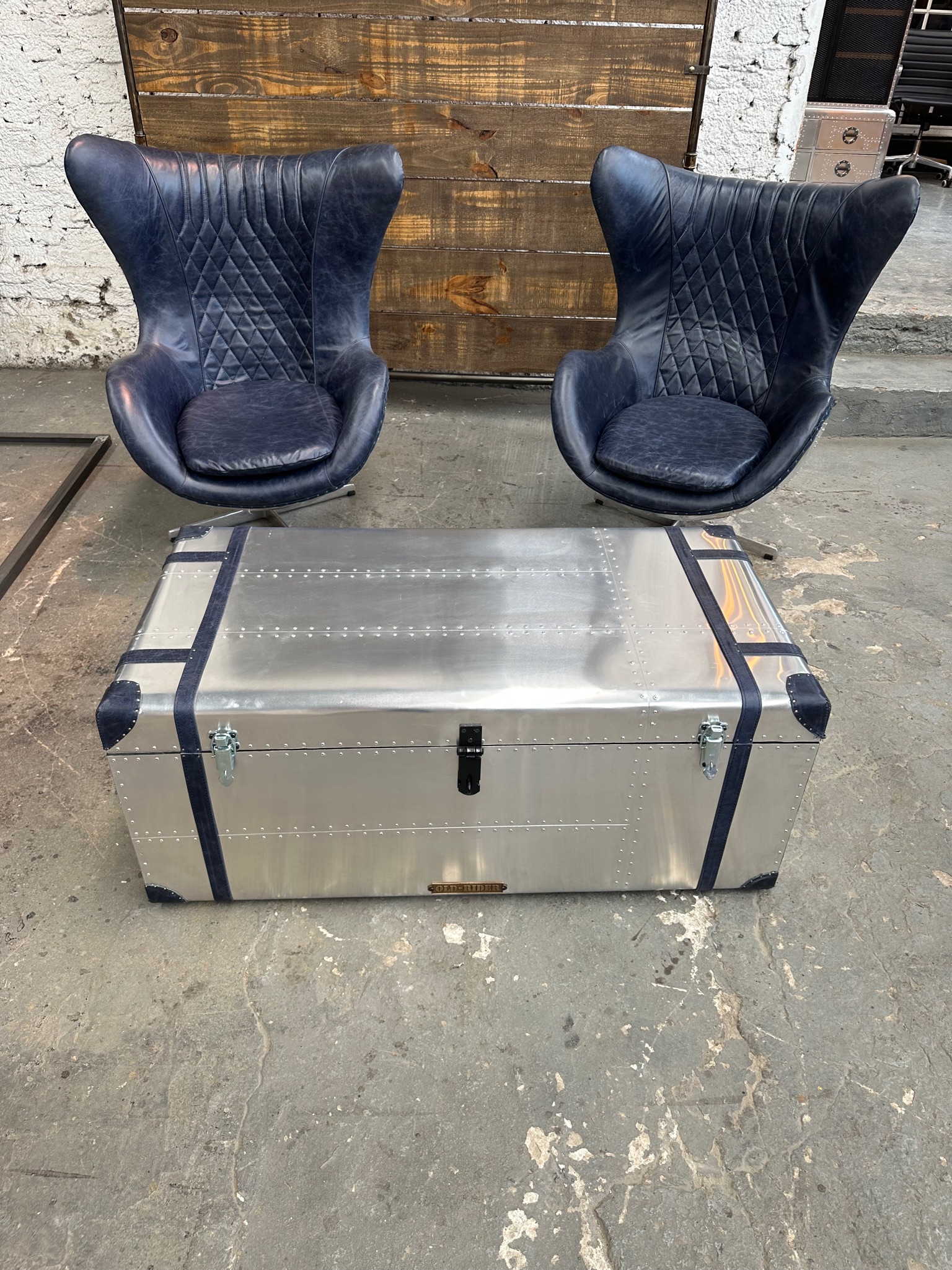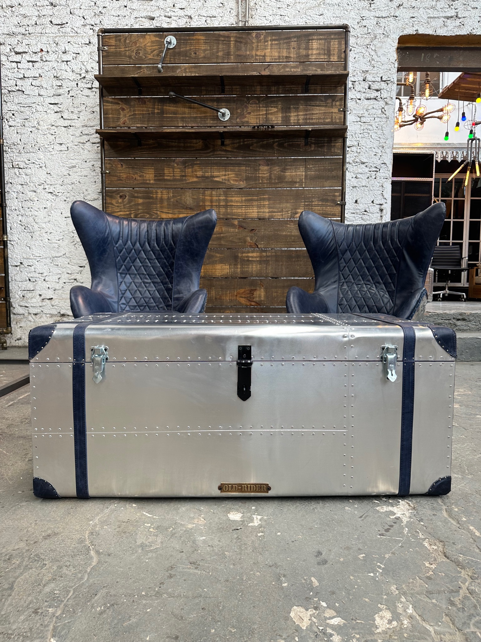 Mesa ratona de aluminio tipo baul, recubierto en aluminio, esquineros de cuero.
