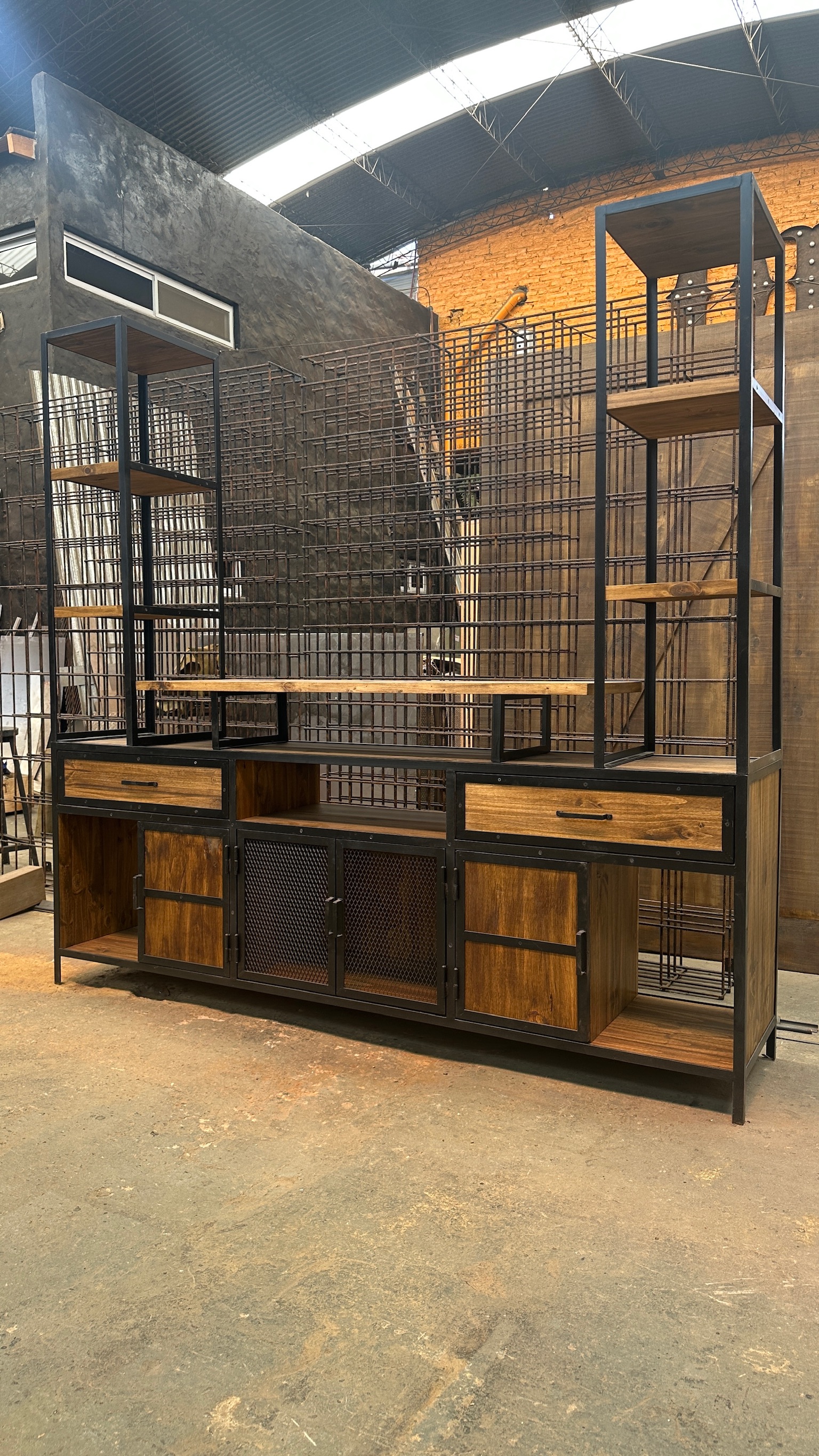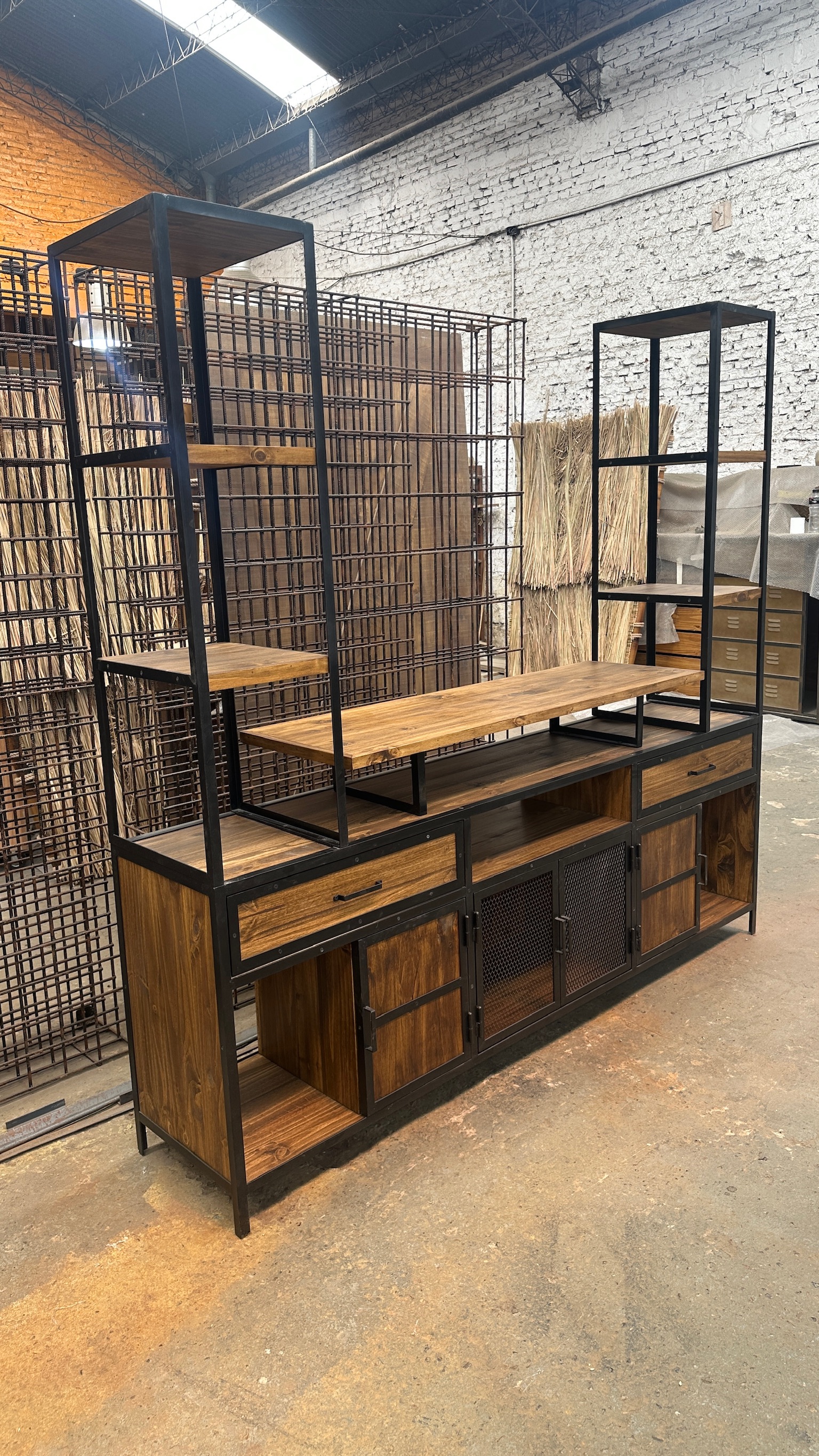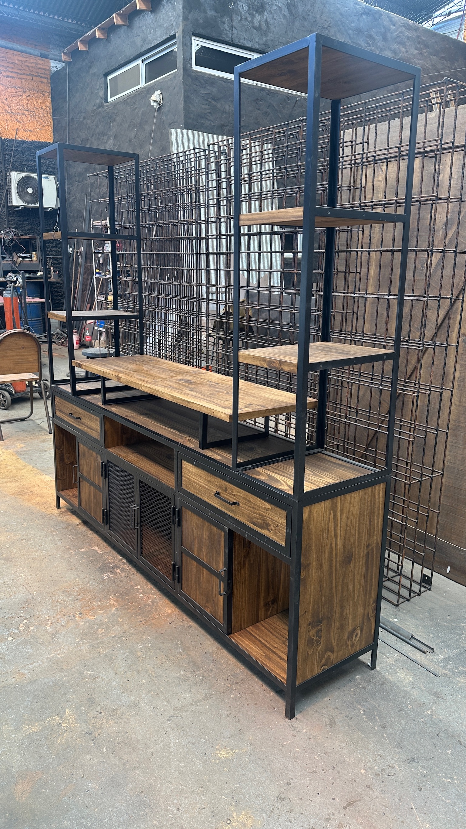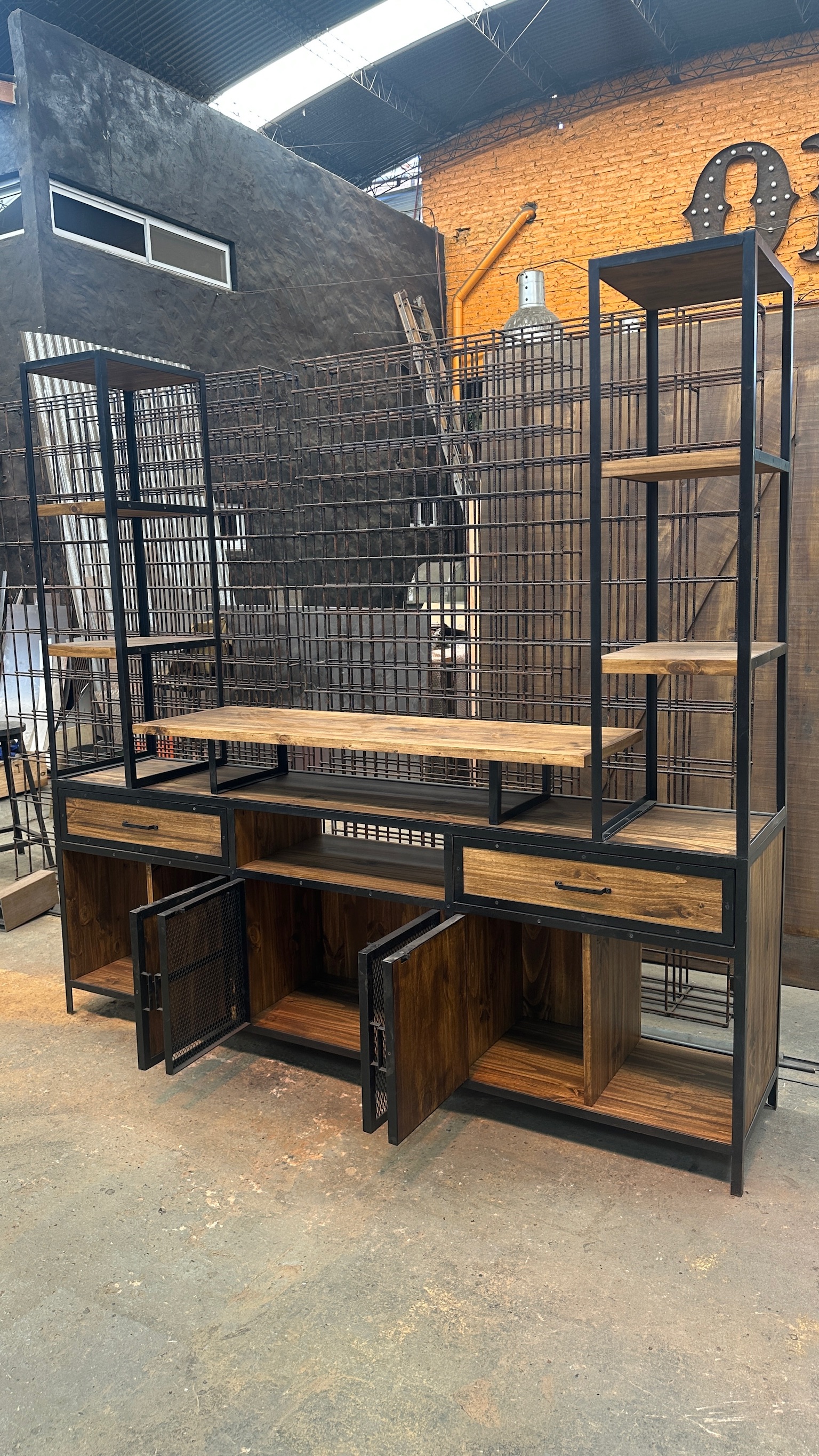 Mueble de TV madera y hierro con estanteria tipo torres en laterales, cajones y puertas.