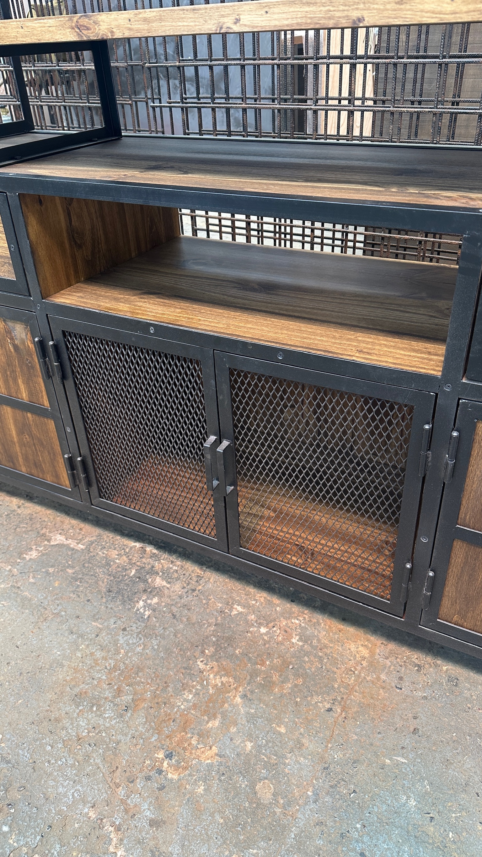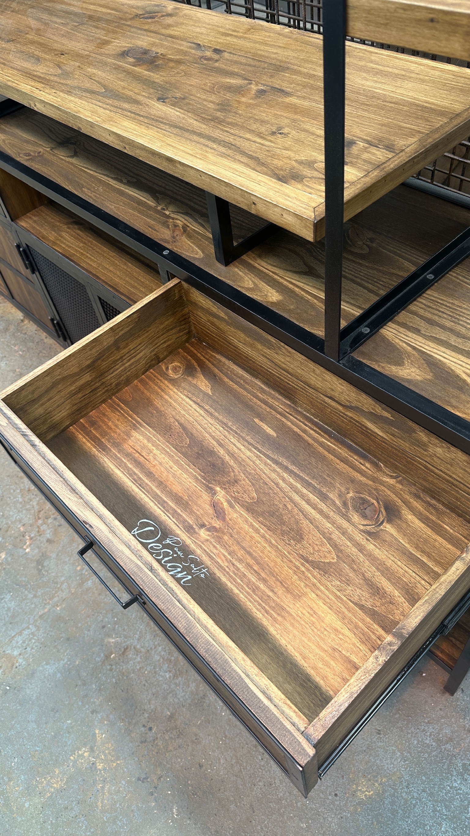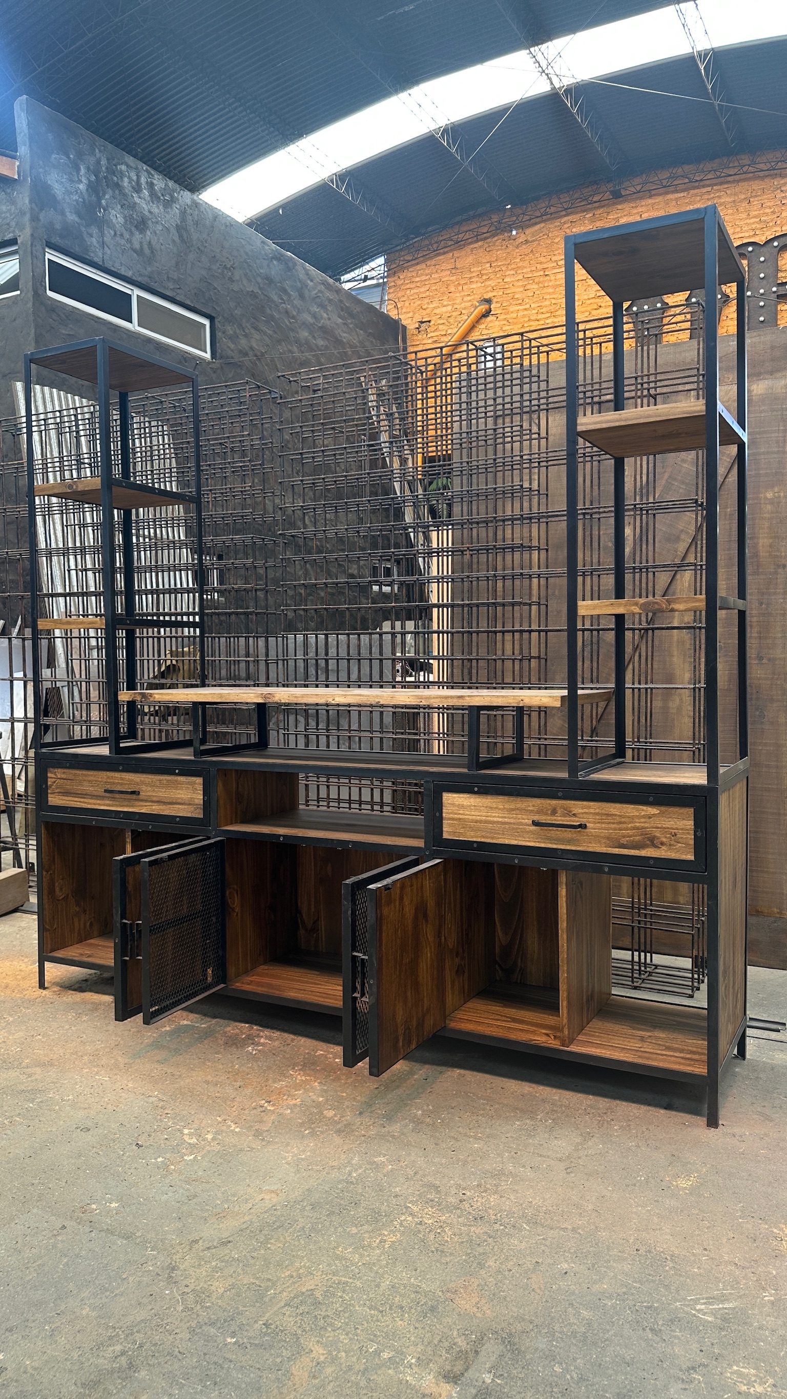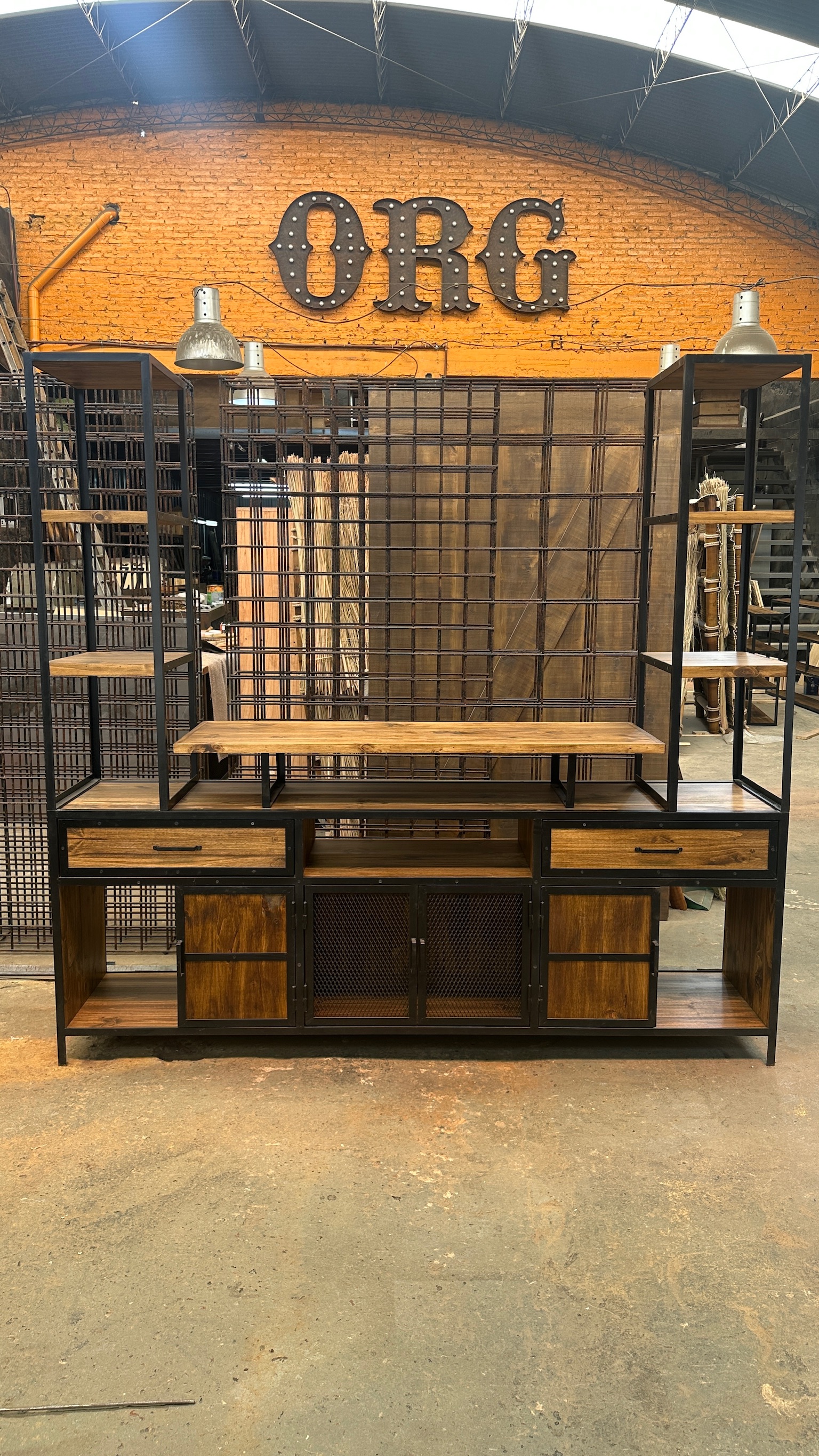 Mueble de TV madera y hierro con estanteria tipo torres en laterales, cajones y puertas.