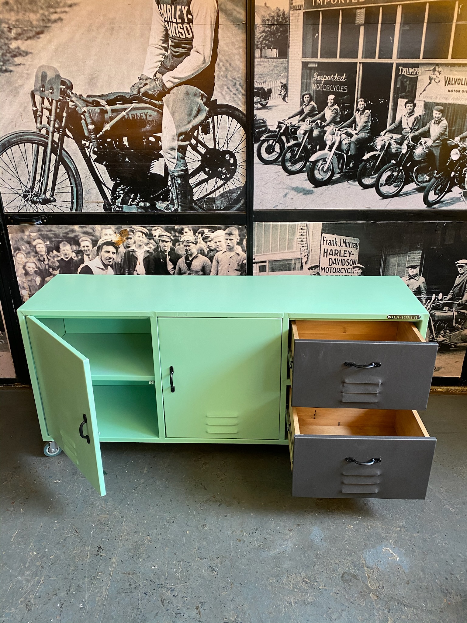 Mueble en chapa y madera con todo delatalles estilo locker con cajones y puertas.