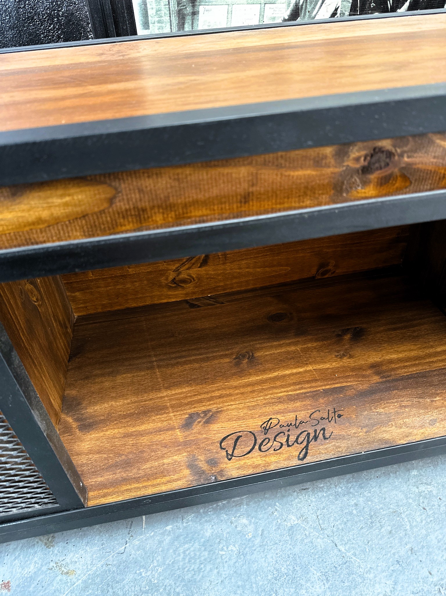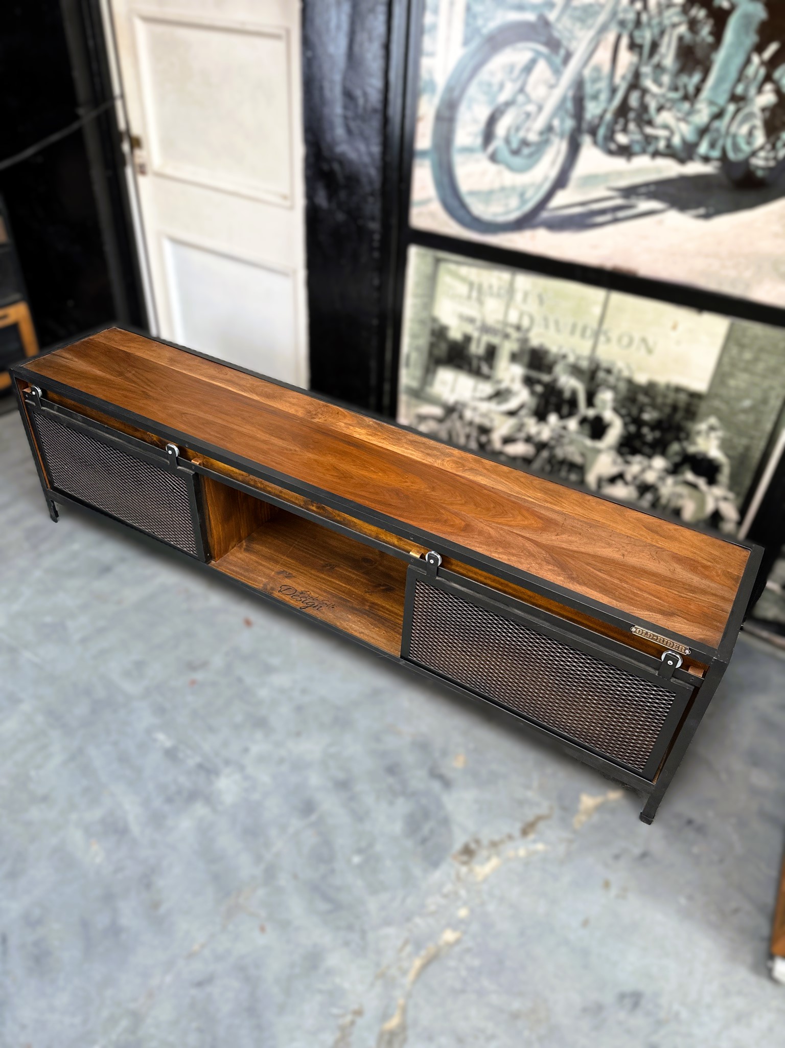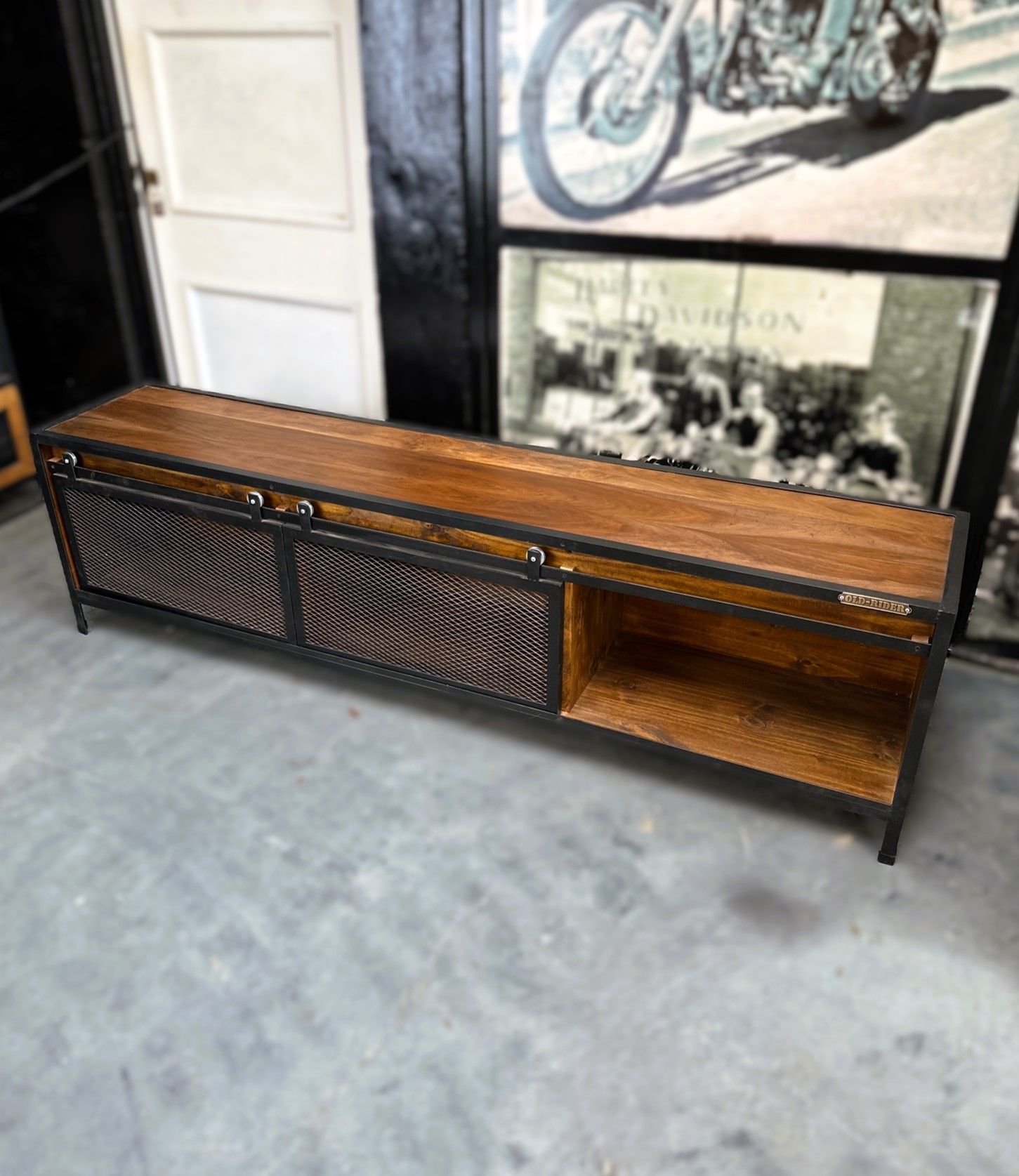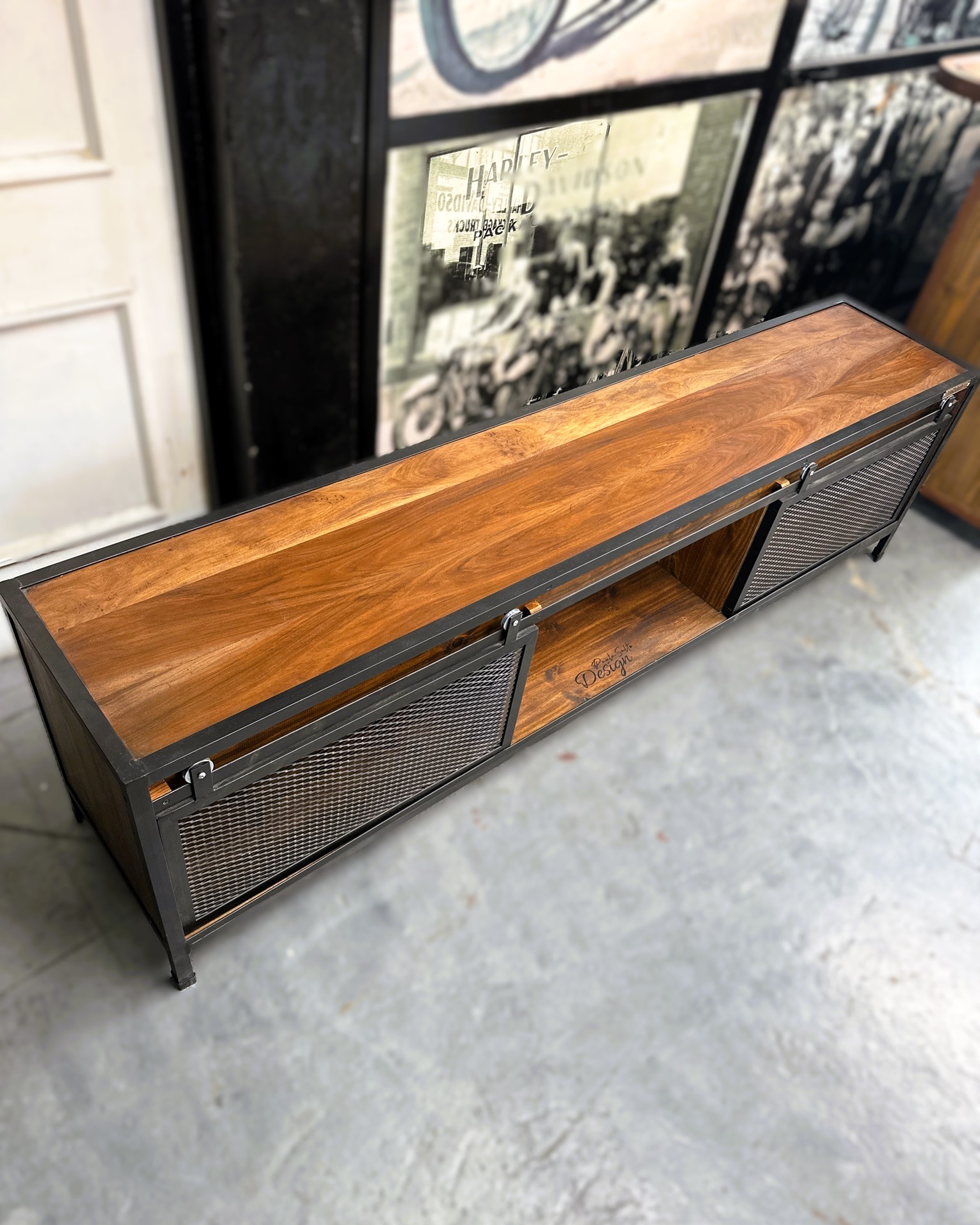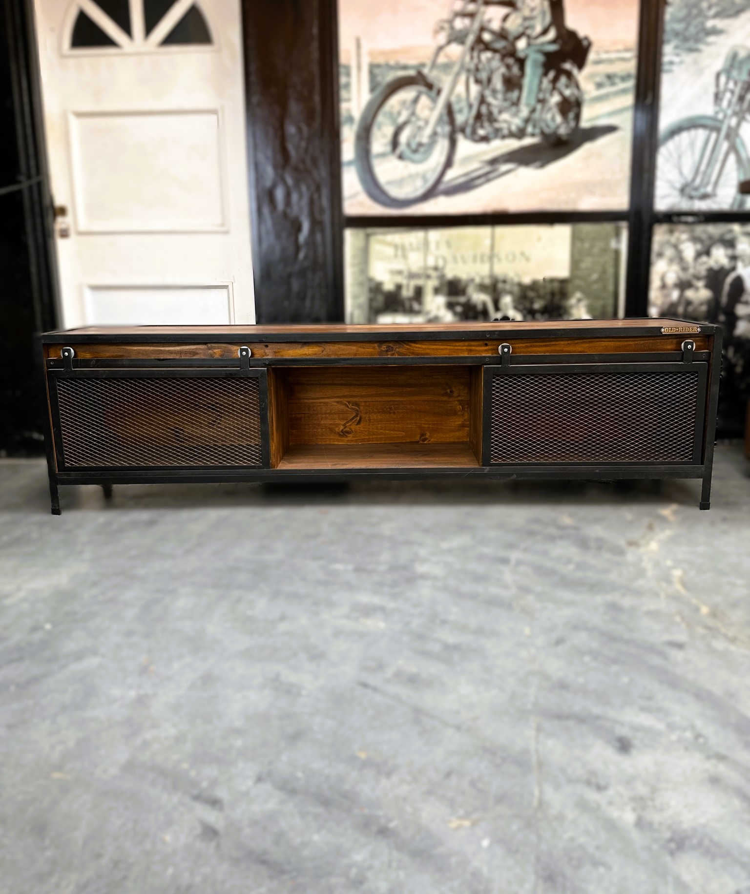 Mueble de tv estilo industrial con puertitas granero de hierro enrejado.