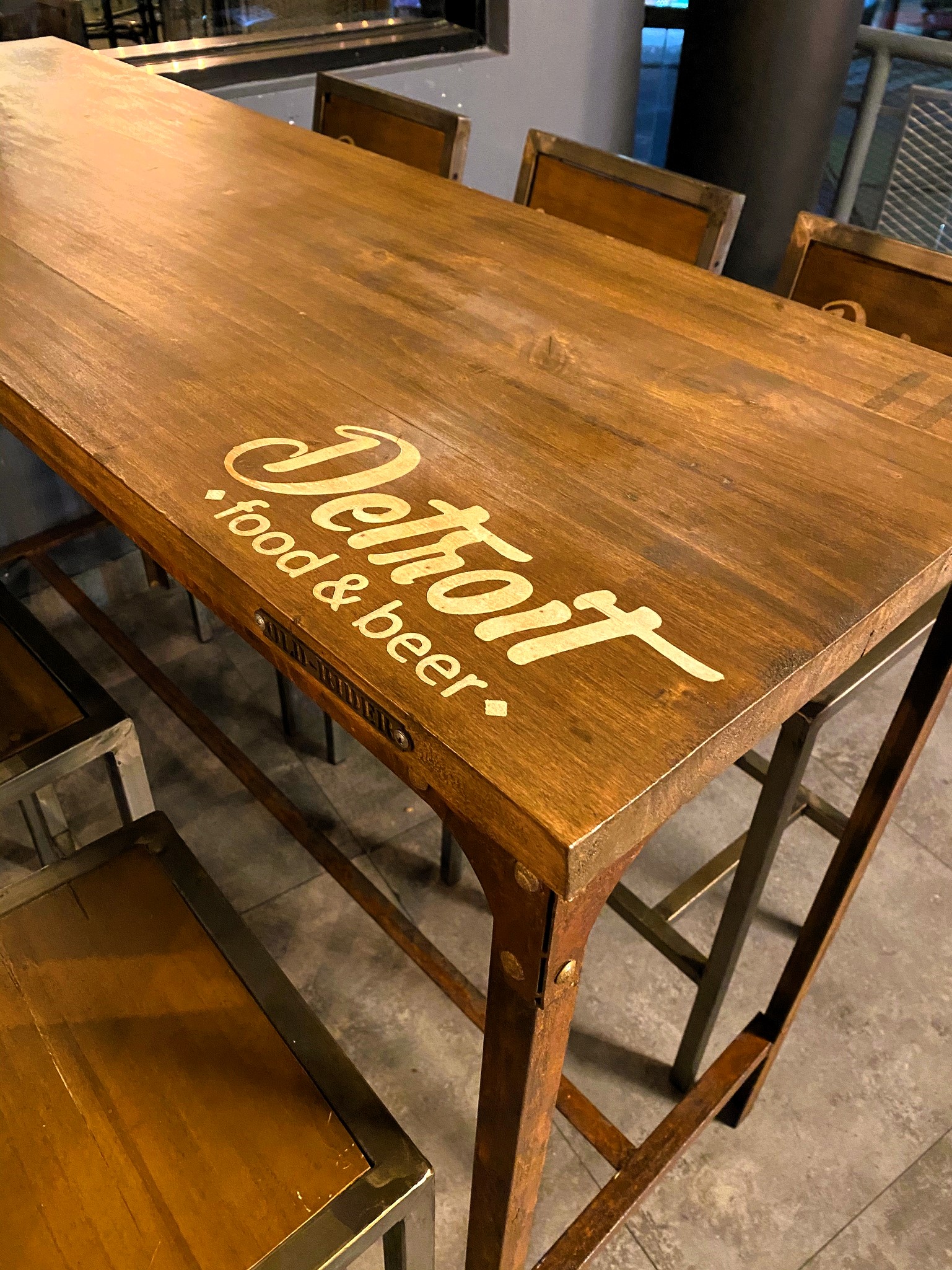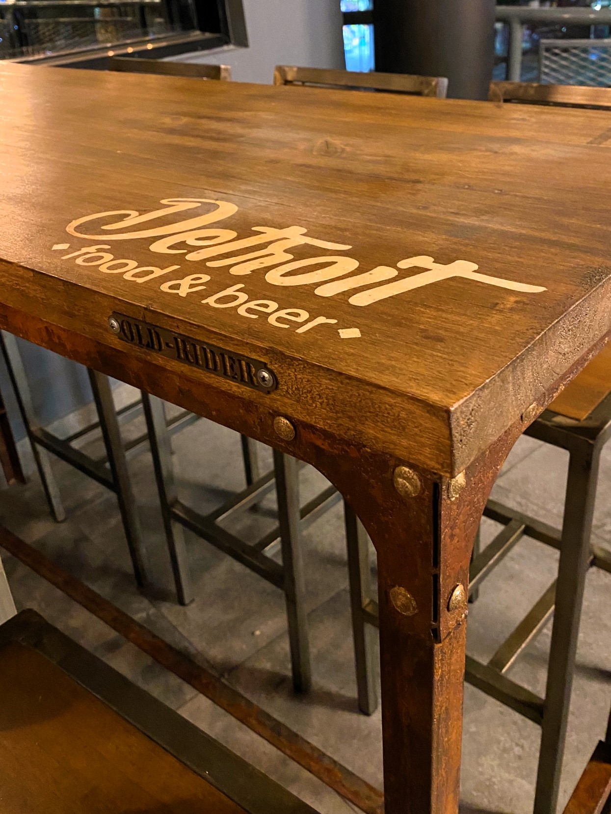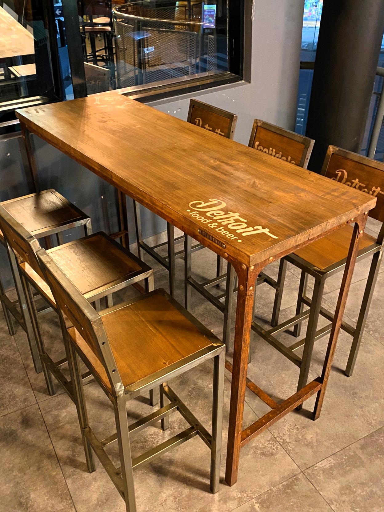 Mesa alta para bar, de madera con patas de hierro oxid y esquinas reforzadas con tachas.