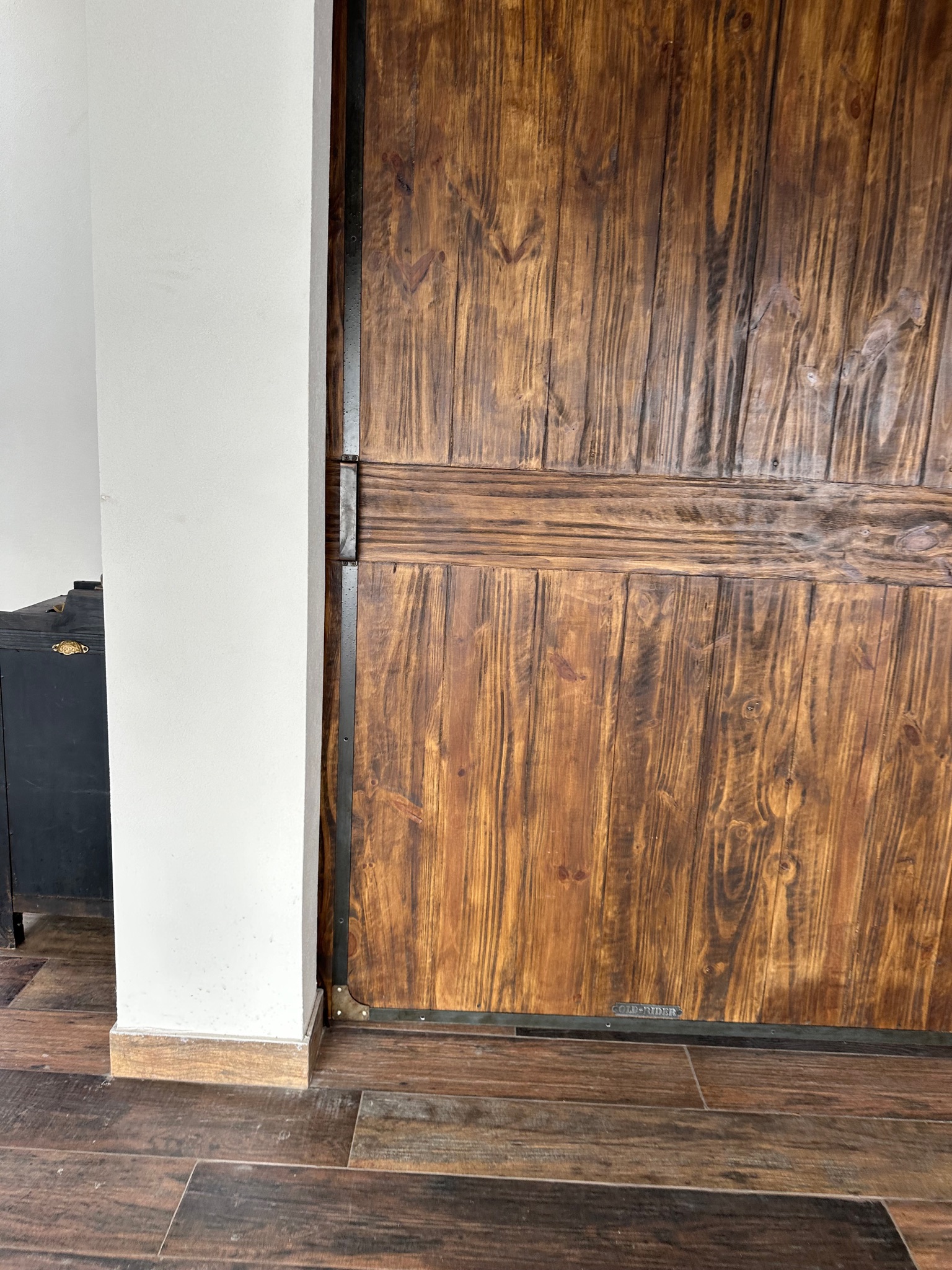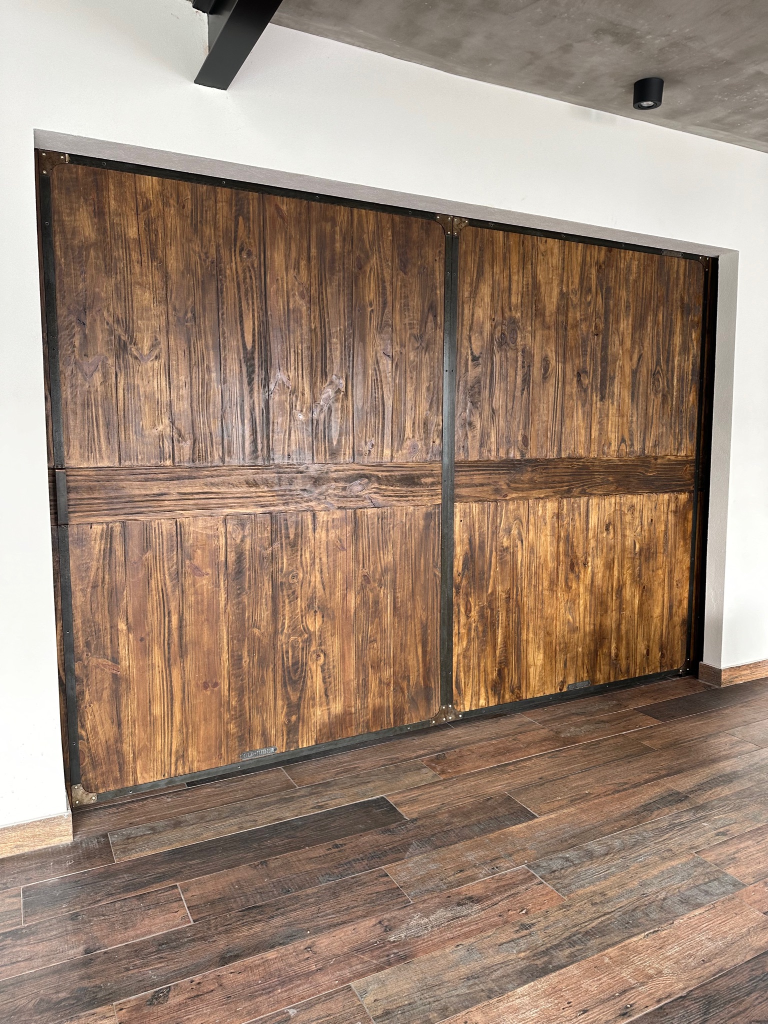 Puerta granero de madera y hierro con manija personalizada.