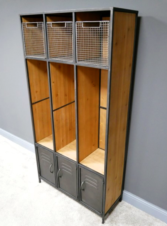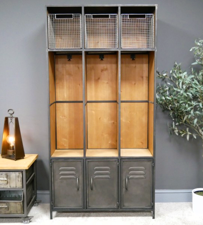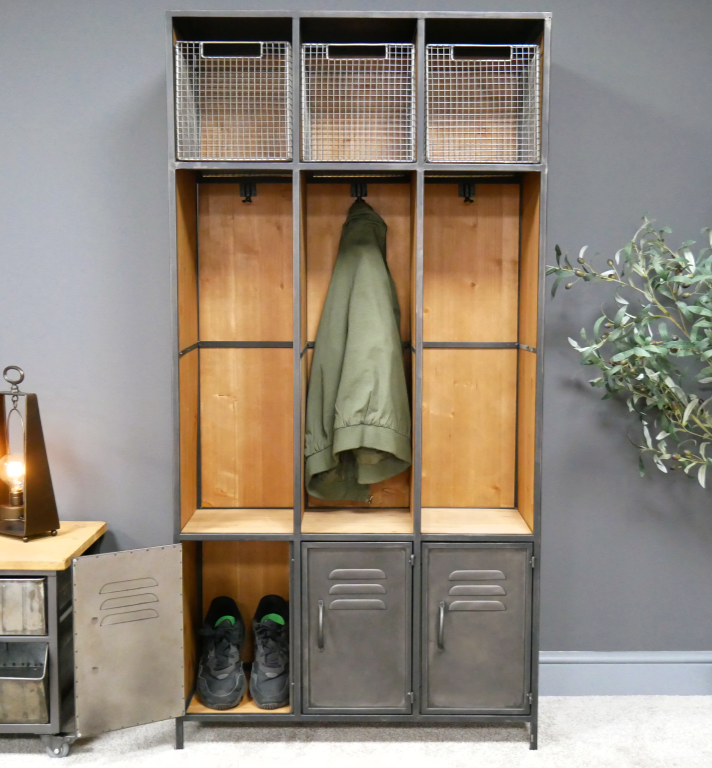 Perchero estilo locker con puertas inferiores y lugar de almacenamiento en la parte de arriba