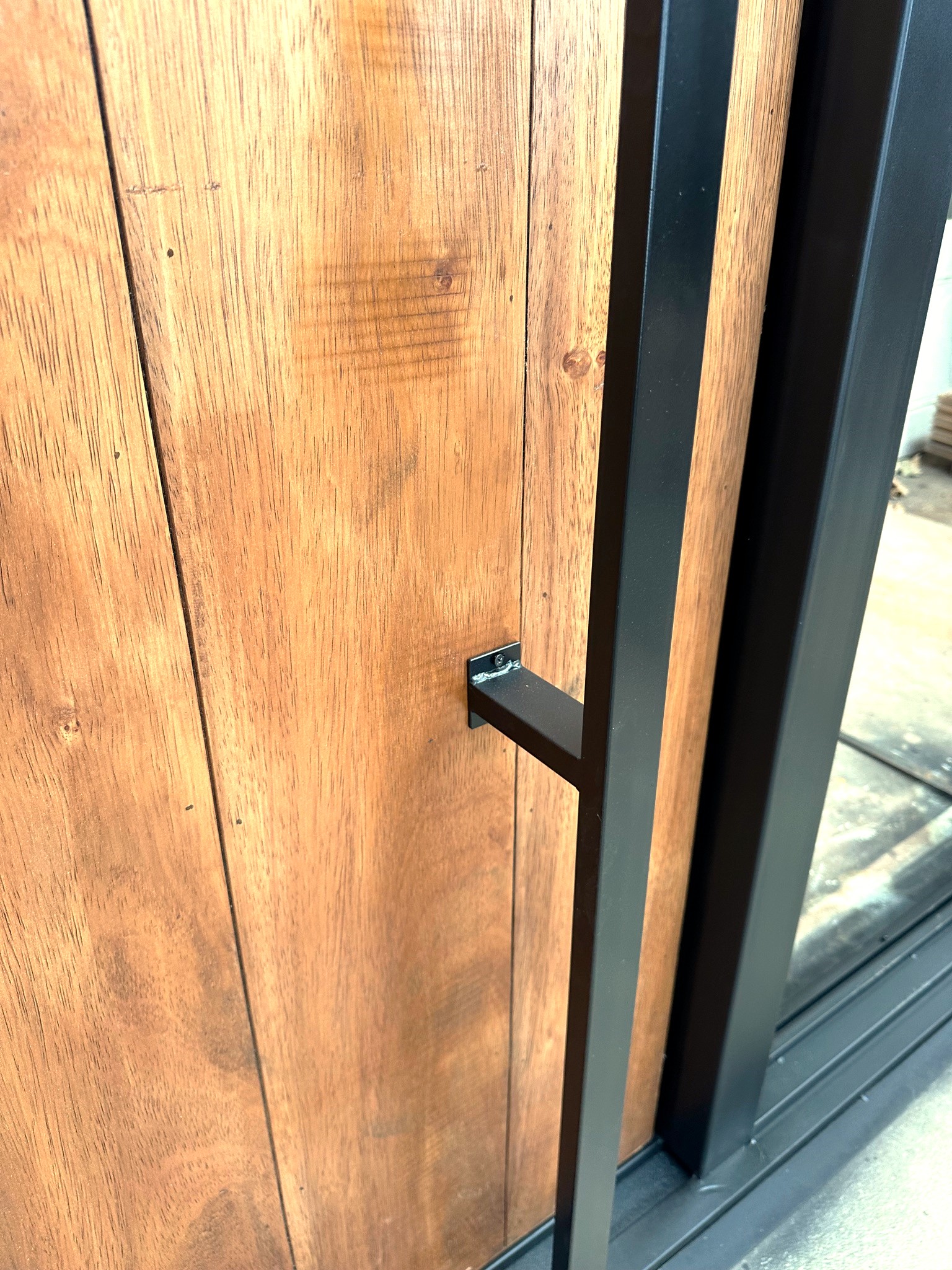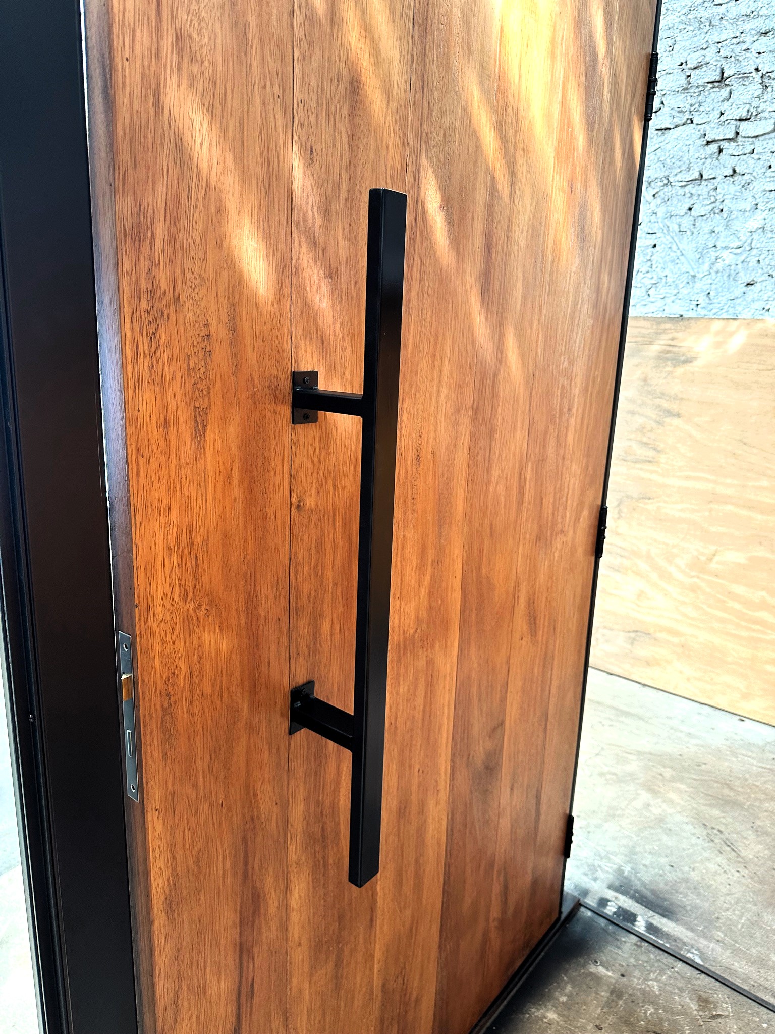 Puerta principal de madera con hueco en el lateral para vidrio. Fabricación a medida